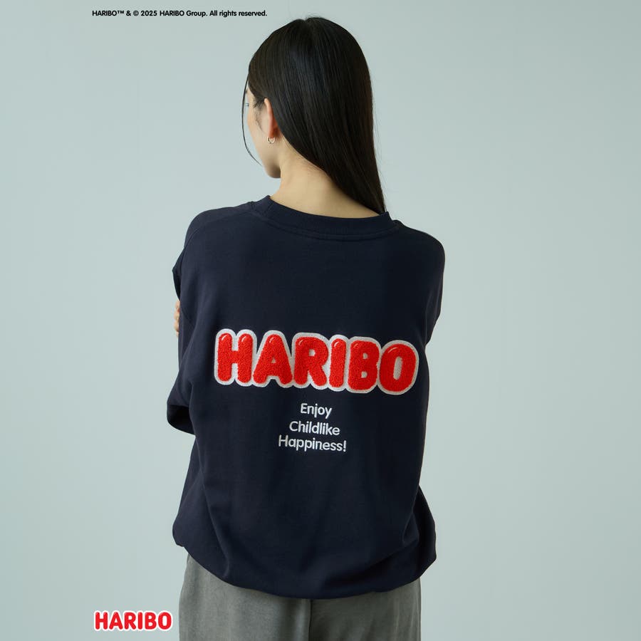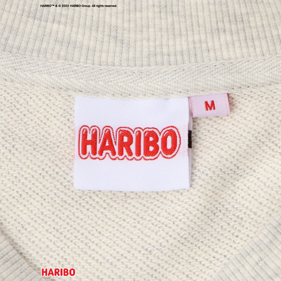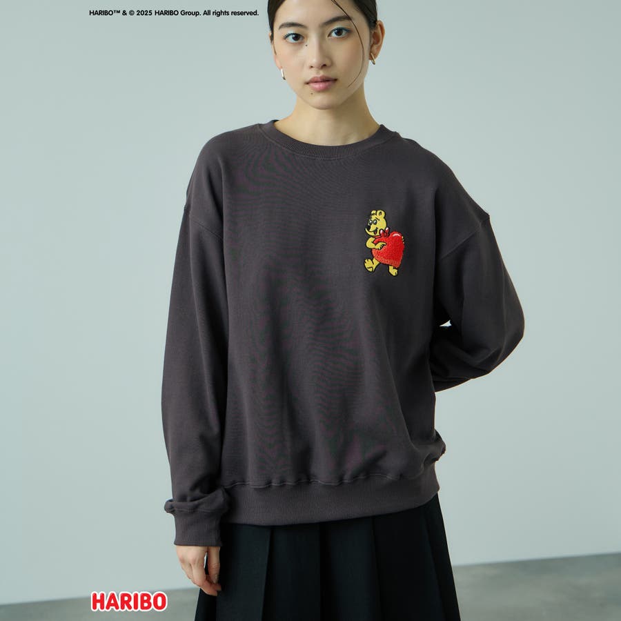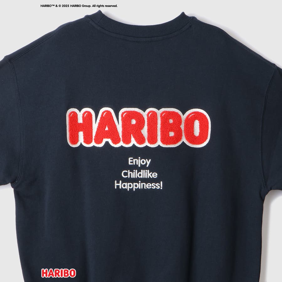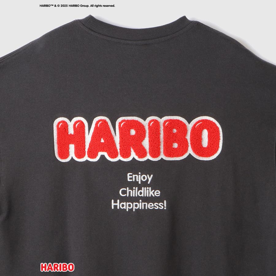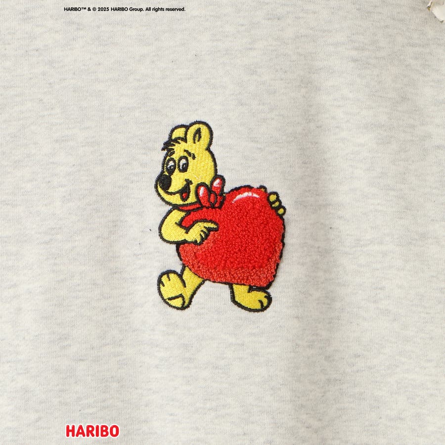フロントはサガラ刺繍が施されたハートを持ったゴールドベアのワンポイント、バックスタイルは「HARIBO」ロゴの赤い部分のみをサガラ刺繍にして凹凸感を出したグラフィックデザインのスウェットトップスです。
