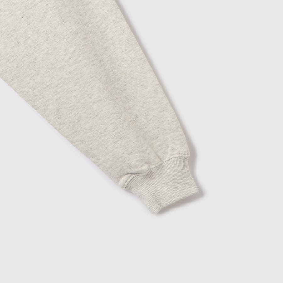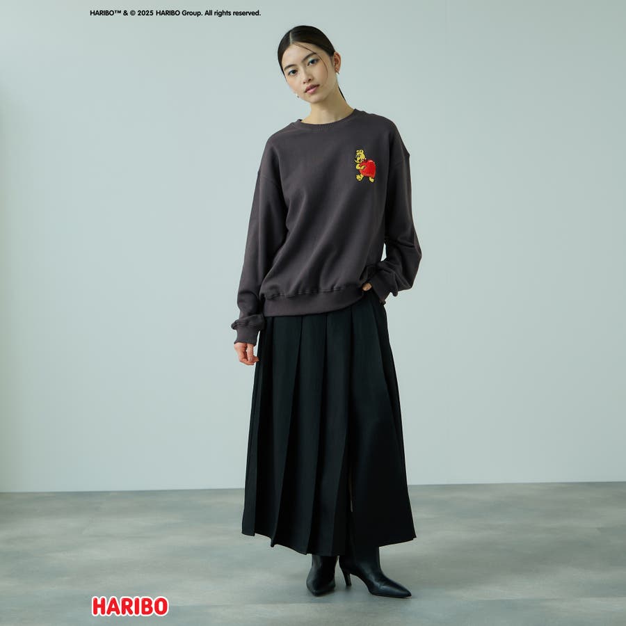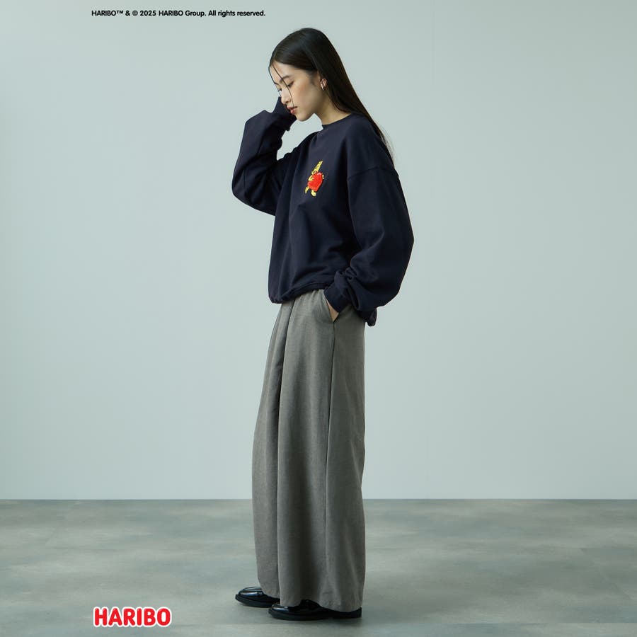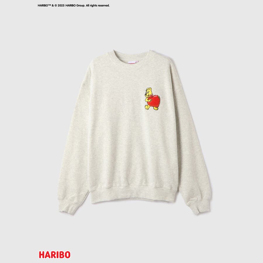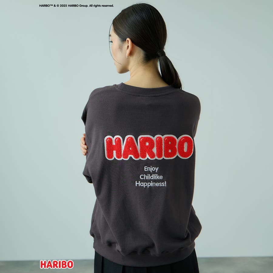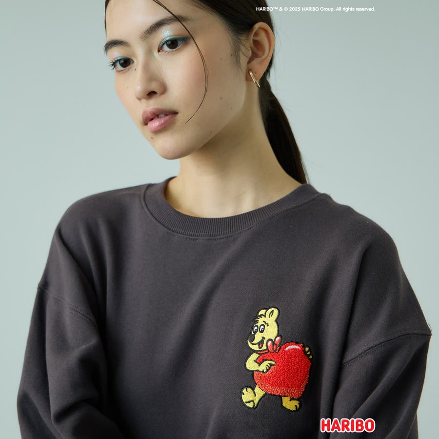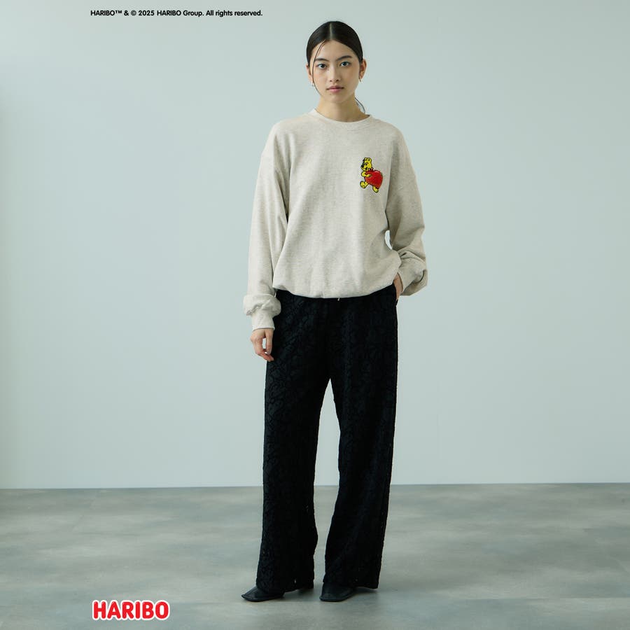 フロントはサガラ刺繍が施されたハートを持ったゴールドベアのワンポイント、バックスタイルは「HARIBO」ロゴの赤い部分のみをサガラ刺繍にして凹凸感を出したグラフィックデザインのスウェットトップスです。