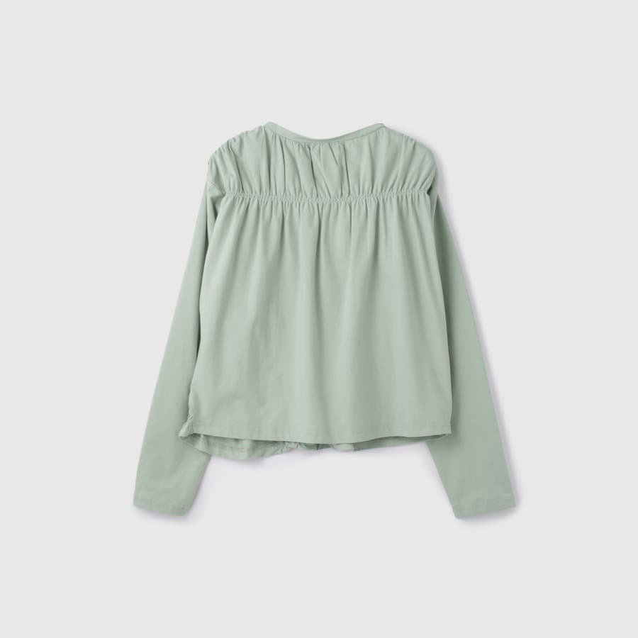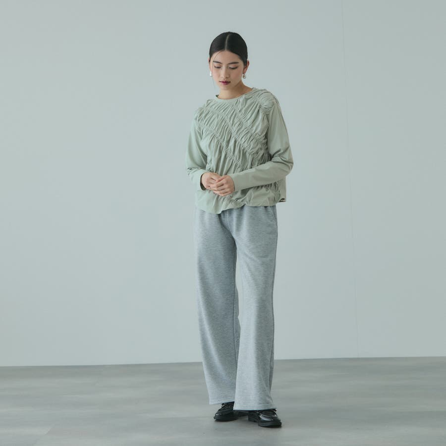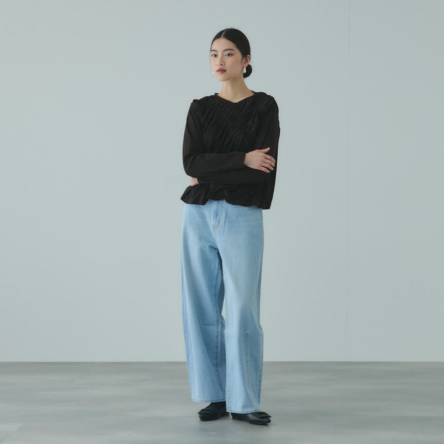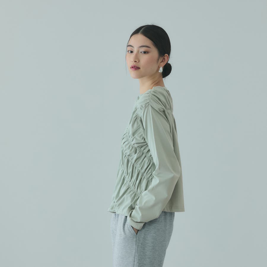 ボディに寄り添うシルエットですが、前身頃のたっぷりギャザーと後身頃ヨーク部分にもシャーリングが施されているので動きやすさも担保。