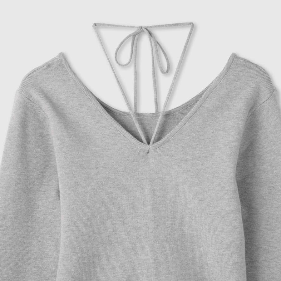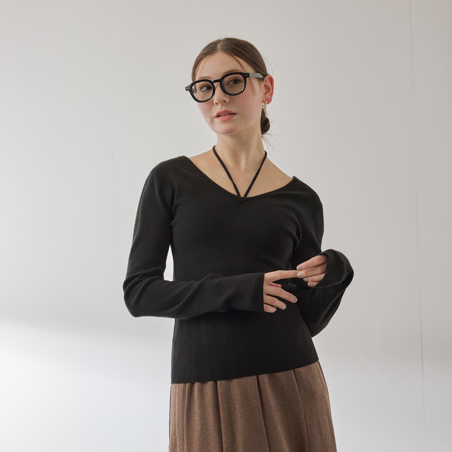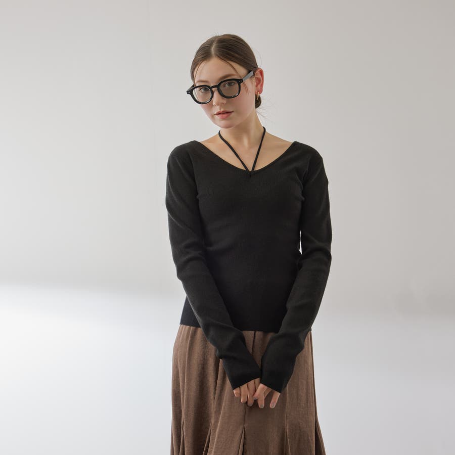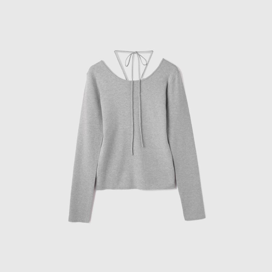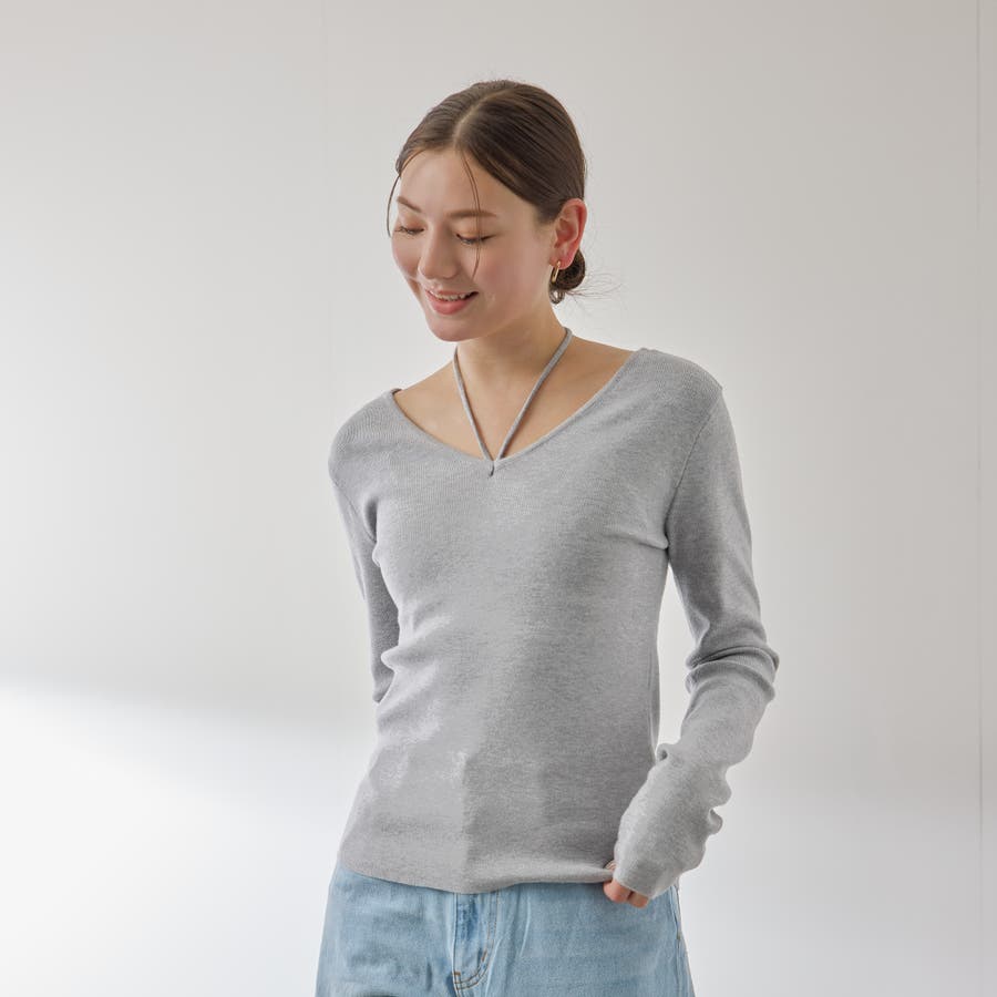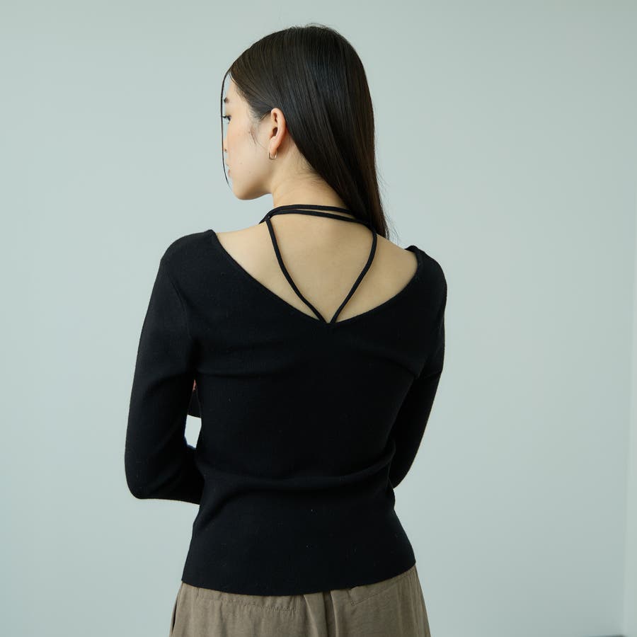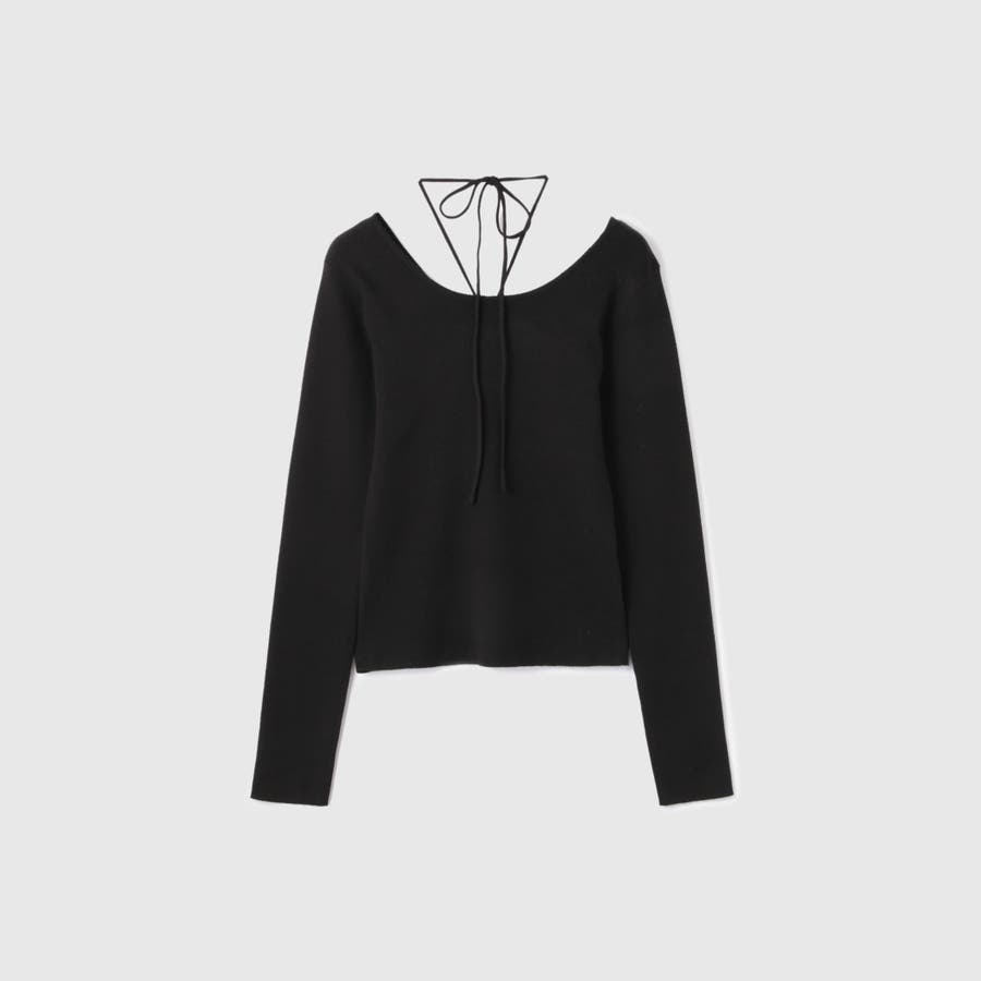 オフショルダーデザインだとズレ落ちの心配もありますが、ストリングデザインなので心配することなく冬の肌見せスタイルが完成します。
