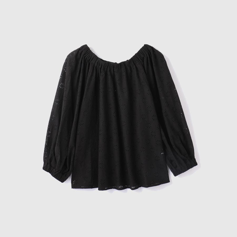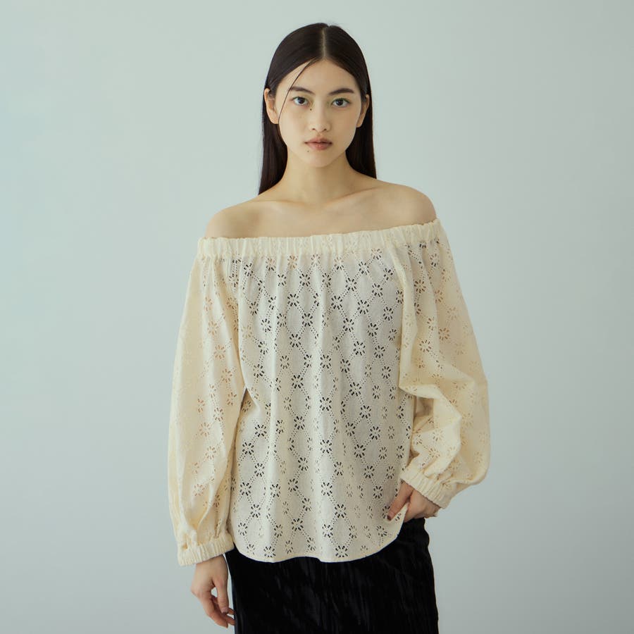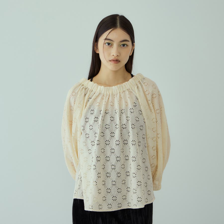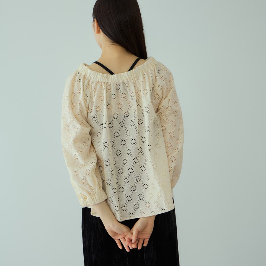 コットンナイロンのフラワーレースのテキスタイルを使用したゴムシャーリングデザインのプルブラウスです。