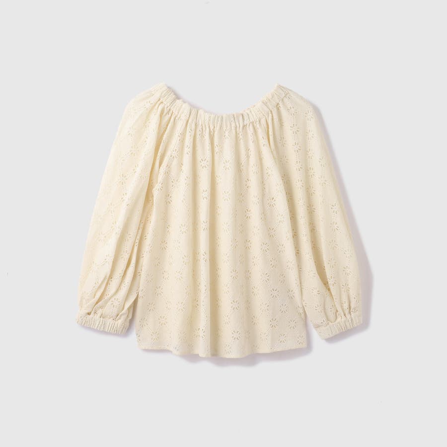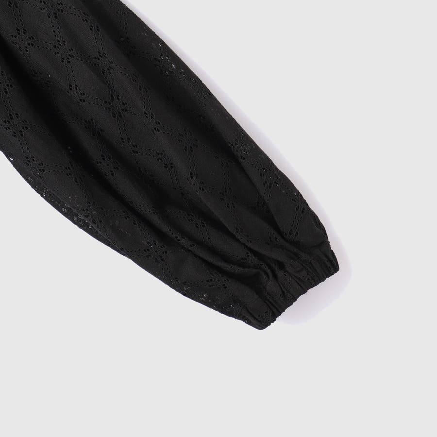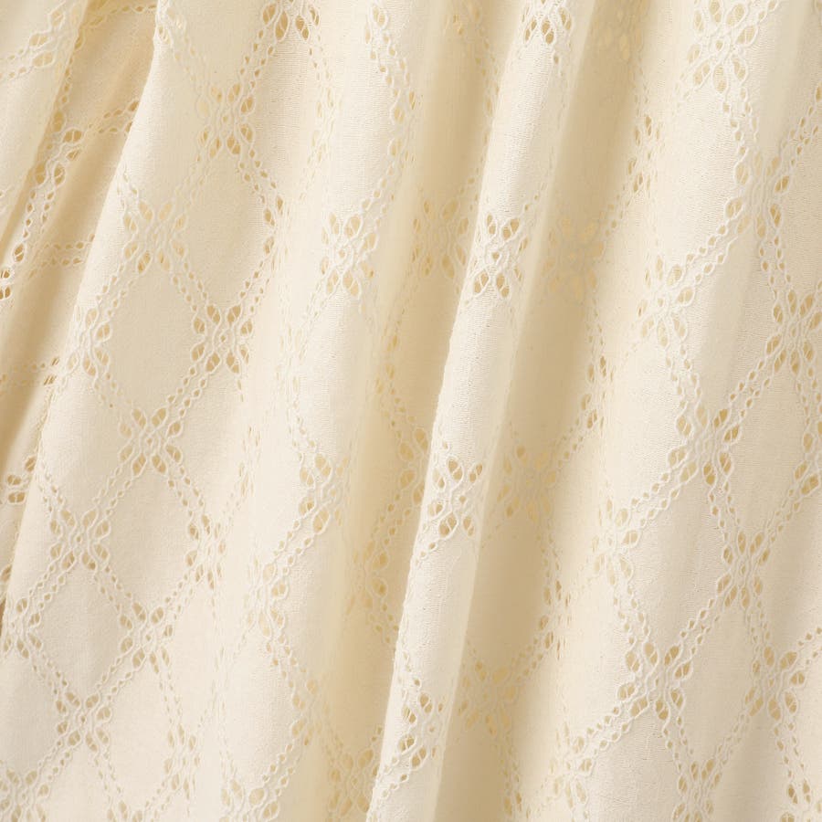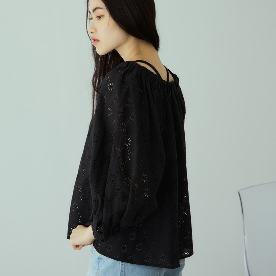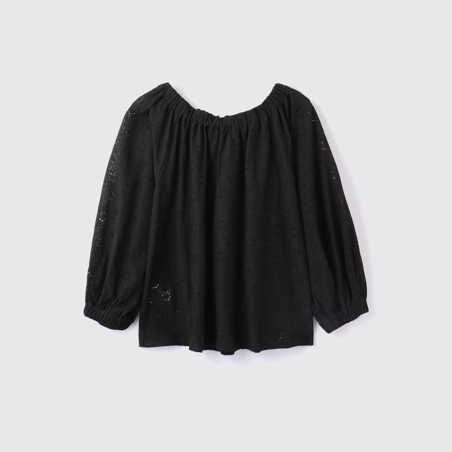 コットンナイロンのフラワーレースのテキスタイルを使用したゴムシャーリングデザインのプルブラウスです。