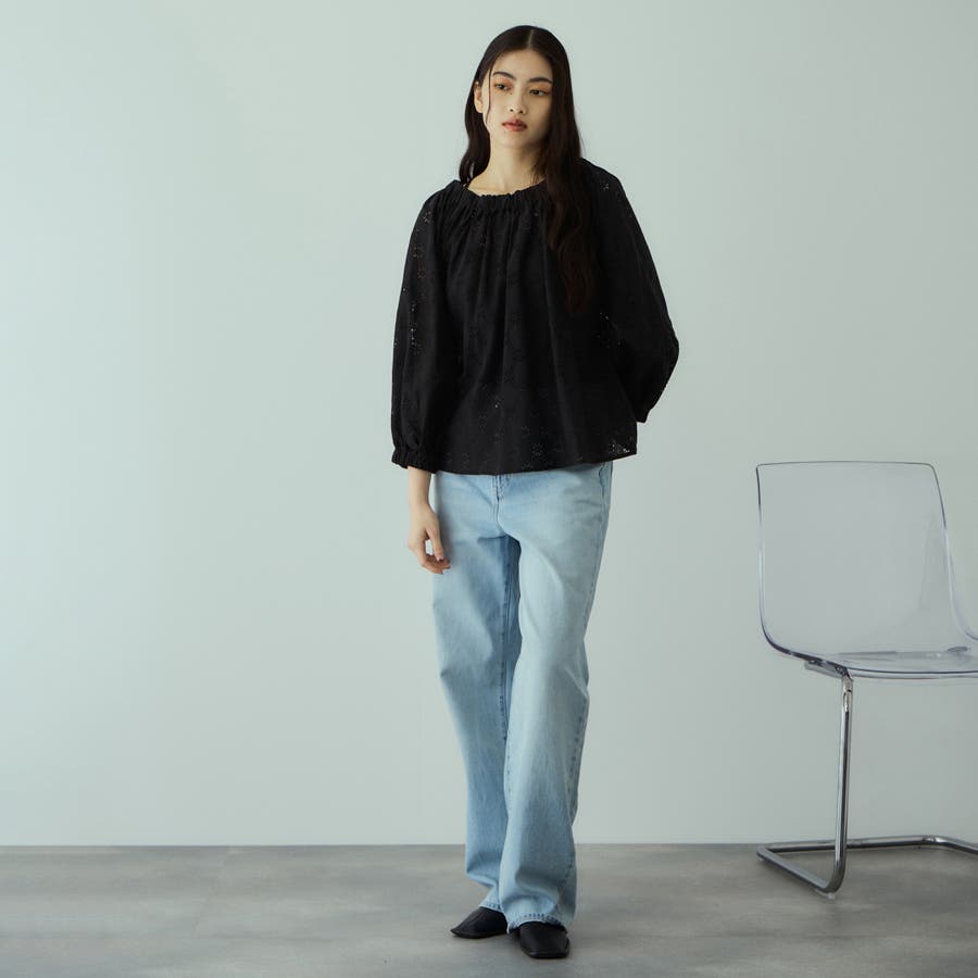 ネックラインがゴムシャーリングなので、肩を落とした着こなしも可能です。