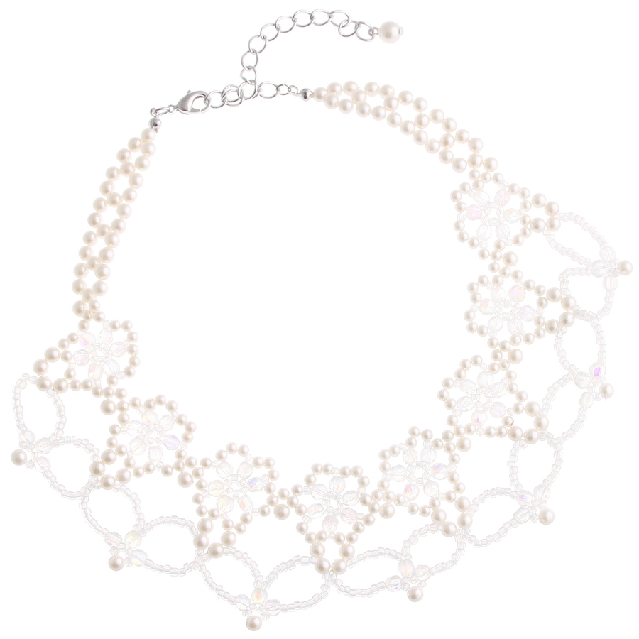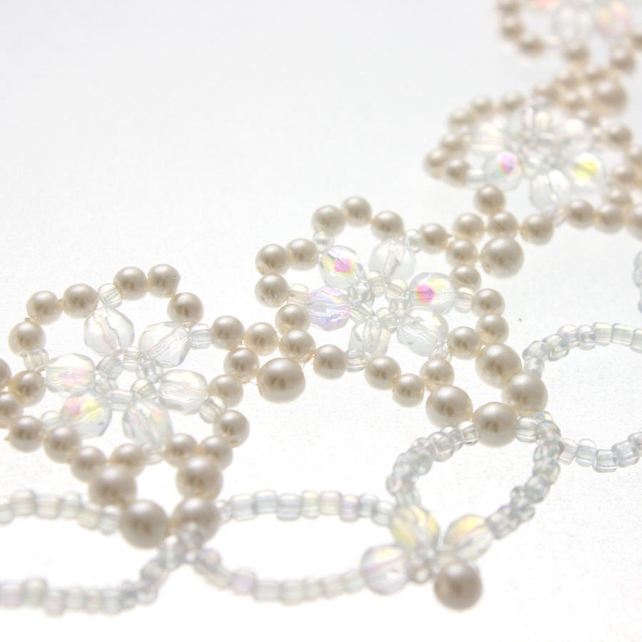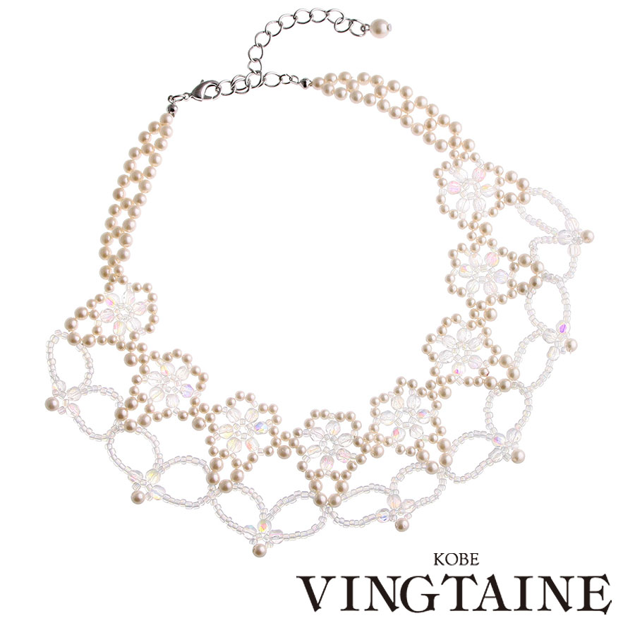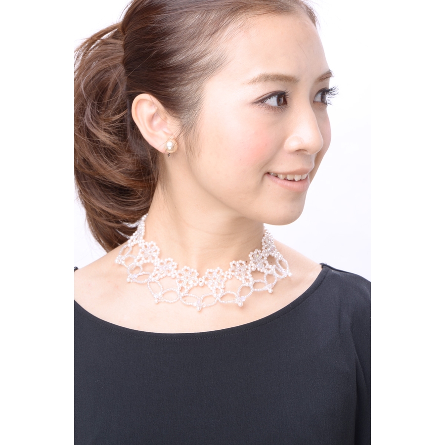 淡く耀くビーズと小粒のパールで、まるでレースのようなに繊細にデザインされたパールチョーカー。胸元が開いたドレスに良く似合い、デコルテラインを華やかに飾ってくれます。結婚式などの特別な日のドレスアップアイテムとして楽しみたい一品です。