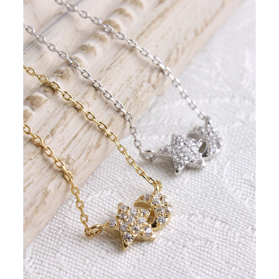 星と月が寄り添う、ロマンティックな雰囲気のネックレス。優しさや純粋さを象徴するモチーフは、女性らしさを引き立ててくれます。お守りのように毎日身につけて楽しみたいアイテムです。