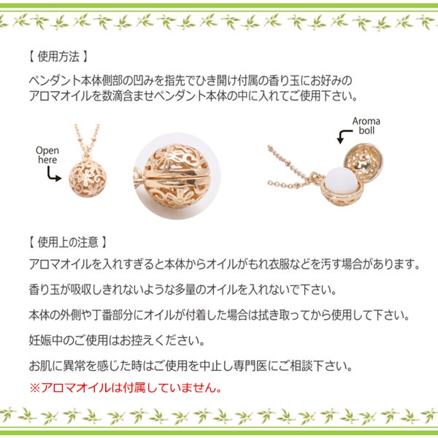 ペンダント本体側部の凹みを指先でひき開け、付属の香り玉にお好みのアロマオイルを数滴含ませペンダント本体の中に入れてご使用下さい。