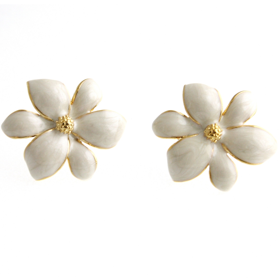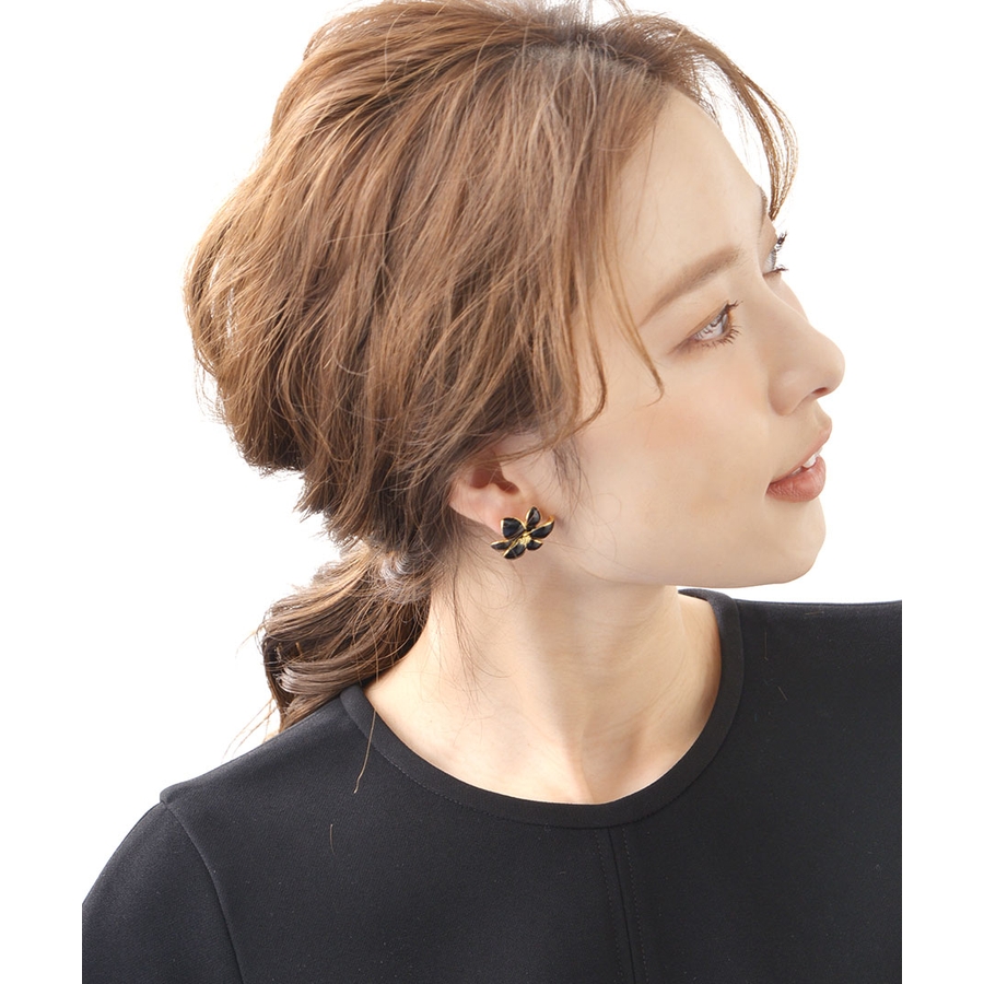 大ぶりのフラワーがお顔周りを華やかに演出してくれるピアス。艶のあるジャスミンの様な花びらが、クラシカルでゴージャスな雰囲気をかもし出しています。中心部と花びらの縁がアクセントの効いたゴールドカラーです。ボリューミーなフラワーをキレイめコーデやカジュアルスタイルに取り入れて、周りの視線を独り占め♪