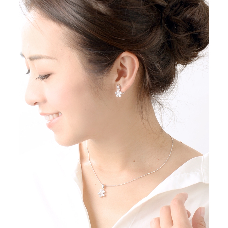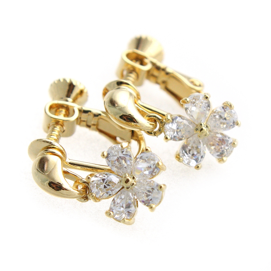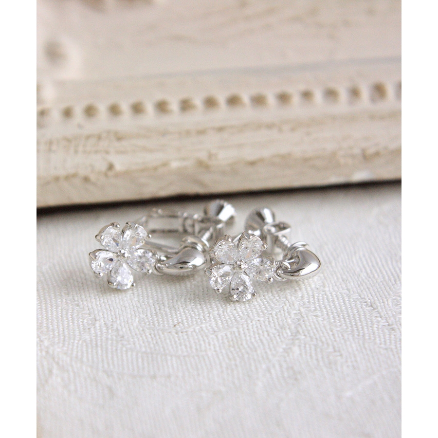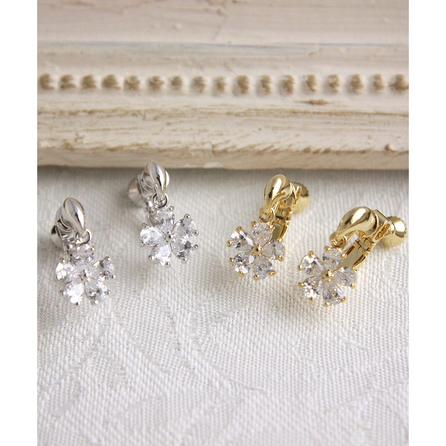 可憐な輝きを放つキュービックジルコニアでデザインされたフラワーイヤリング。5枚の花びら一枚一枚が繊細に輝き、女性らしい表情を引き立ててくれます。