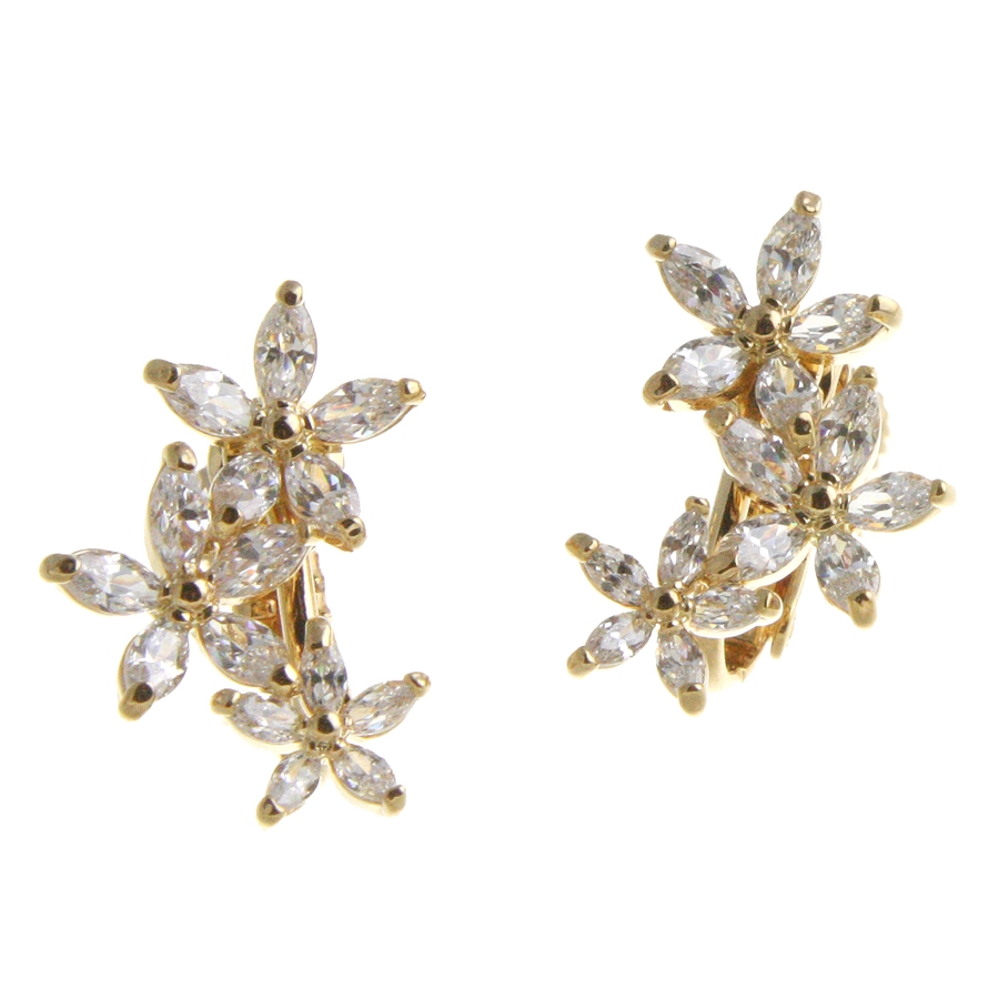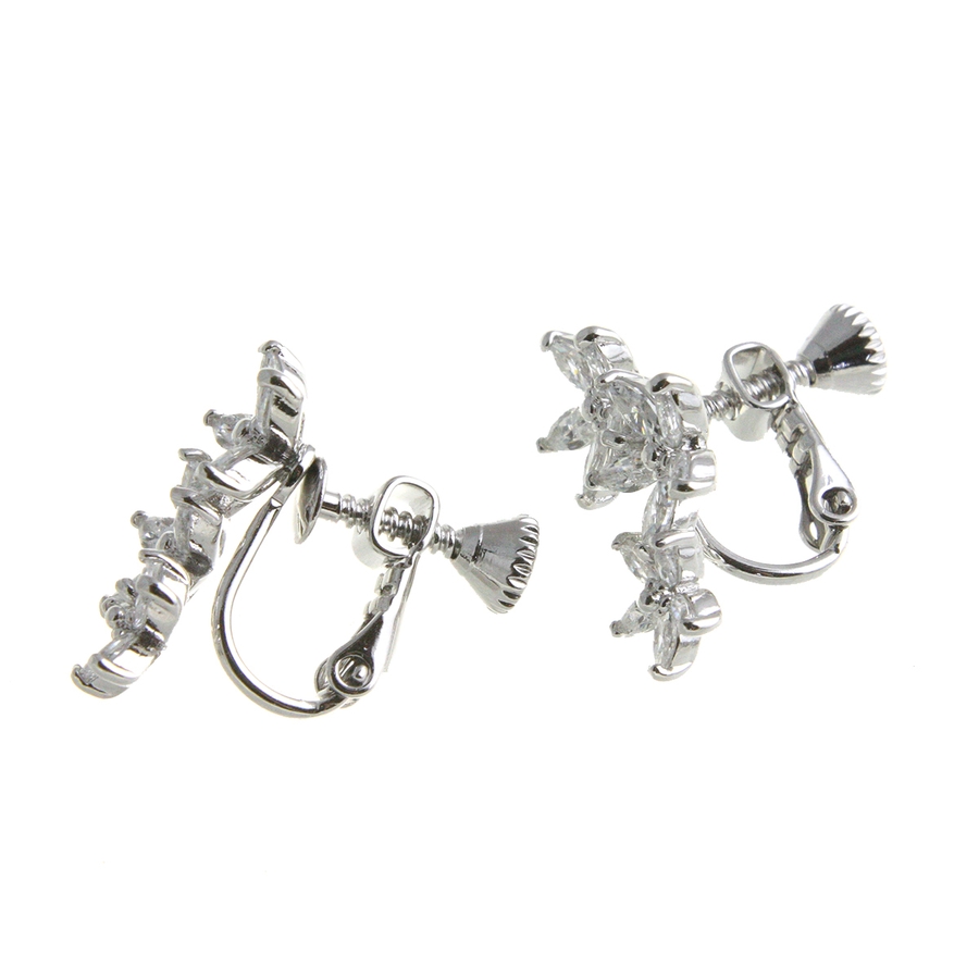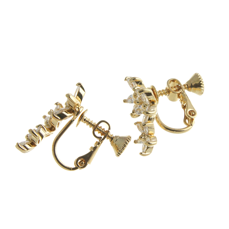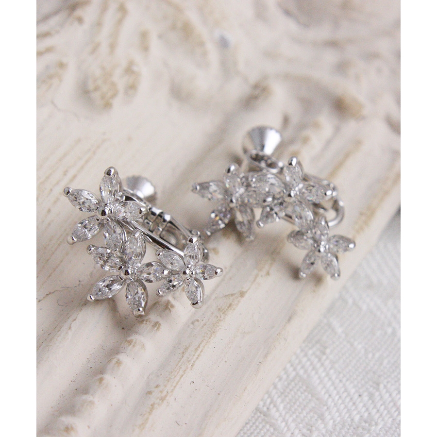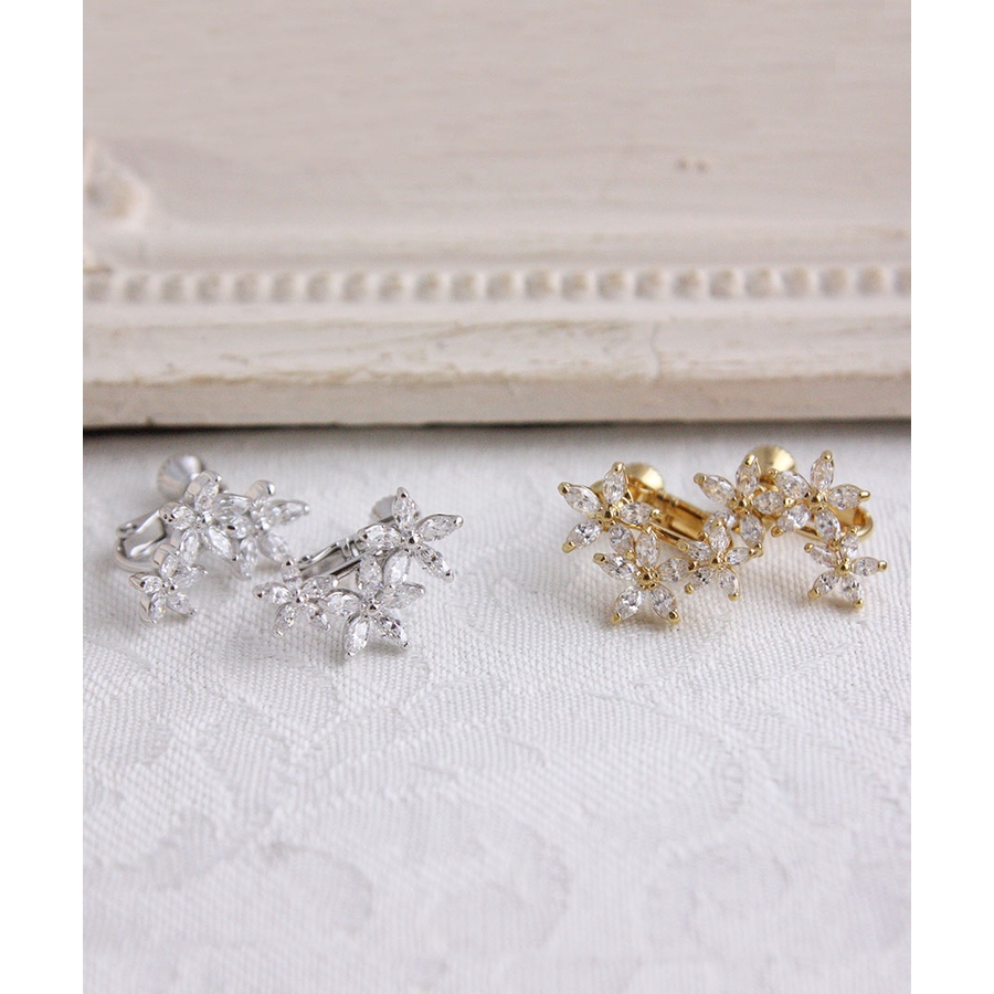 キュービックジルコニアで模った、流れるような3連のお花が美しいイヤリング。きらめくお花が胸元を華やかに彩ってくれそう。