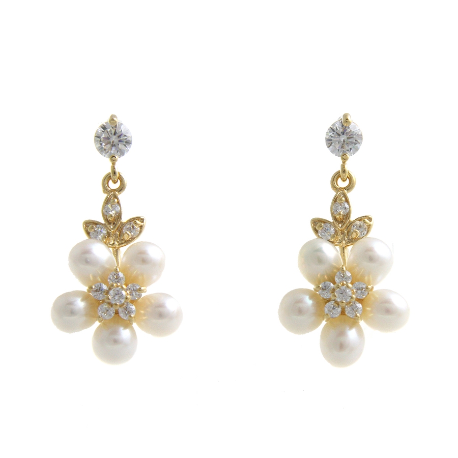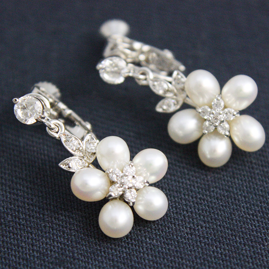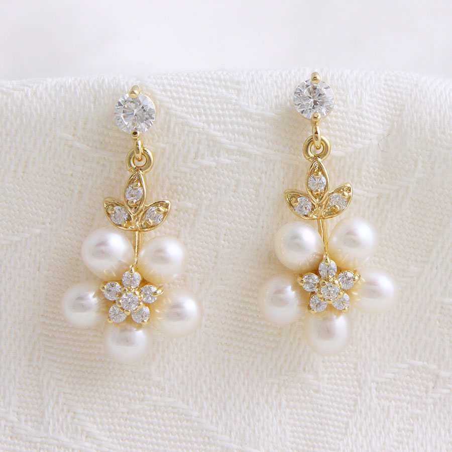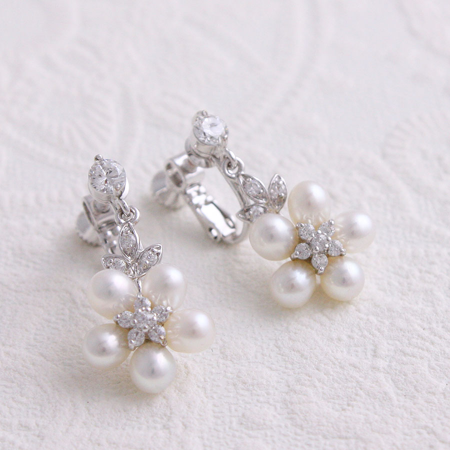 大人の女性に似合う、キュービックジルコニア×パールのピアス/イヤリング。淡水パールをあしらった清楚なフラワーモチーフ。きちんとした印象を残しつつ、女性らしい華やかな雰囲気をかもし出してくれるので、結婚式やパーティー、ちょっとしたお呼ばれの場など、幅広く活躍してくれそうです。