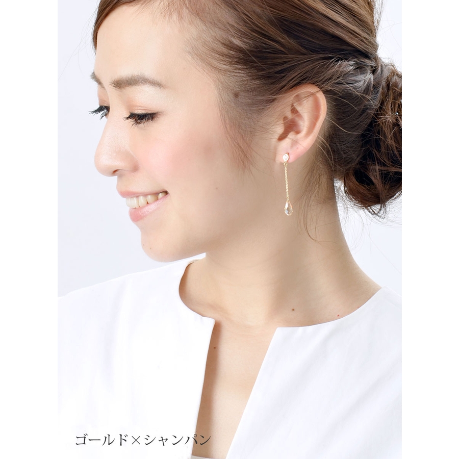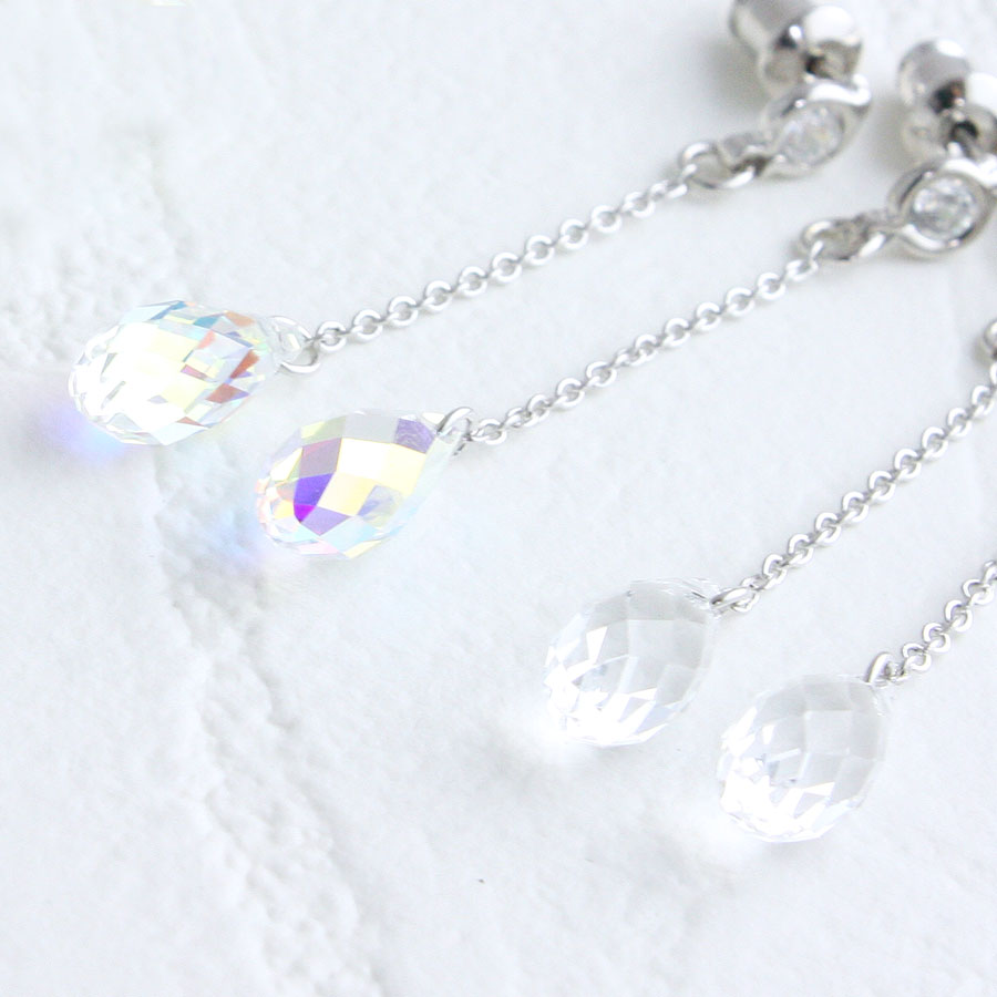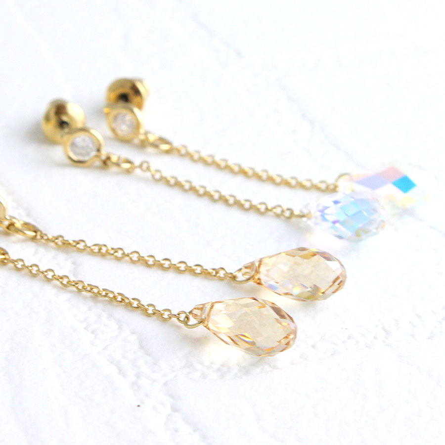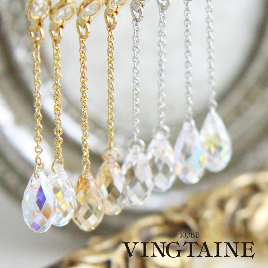 エレガントにゆらゆら揺れるクリスタライズ。どの角度から見ても優雅に輝くブリオレットカットで美しく透明感のある女性を演出してくれます。品のあるシャンパンゴールドに七色に輝くオーロラ、透き通るクリアの美しさも魅力です。飽きの来ないデザインでついつい出番が多くなりそう♪