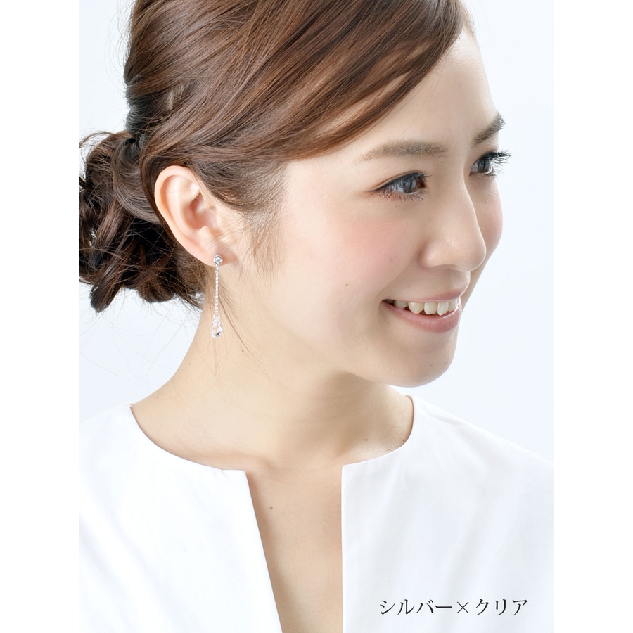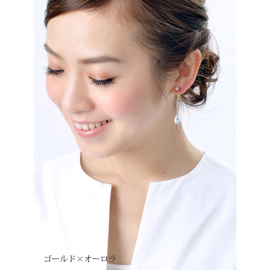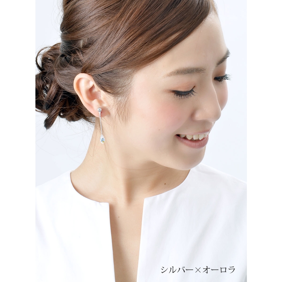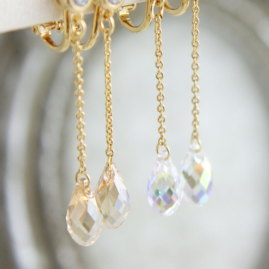 エレガントにゆらゆら揺れるクリスタライズ。どの角度から見ても優雅に輝くブリオレットカットで美しく透明感のある女性を演出してくれます。品のあるシャンパンゴールドに七色に輝くオーロラ、透き通るクリアの美しさも魅力です。飽きの来ないデザインでついつい出番が多くなりそう♪