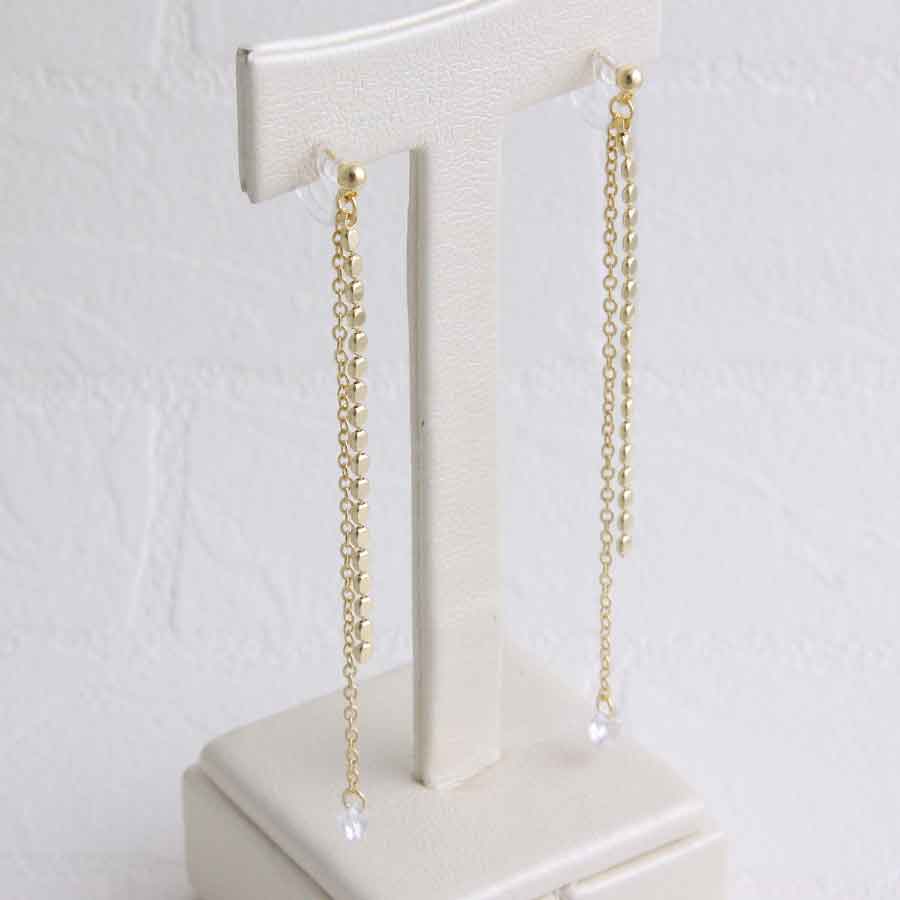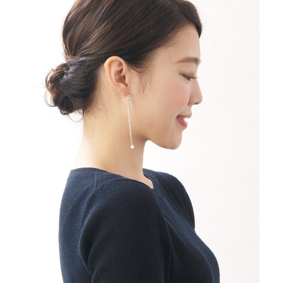 ピアス穴がなくても、耳たぶに挟むだけで着けられるピアス風イヤリングです。軽い着け心地なので長時間の使用でも痛くなりにくく、また、樹脂製のパーツなので金属アレルギーの方も安心してお使いいただけます。