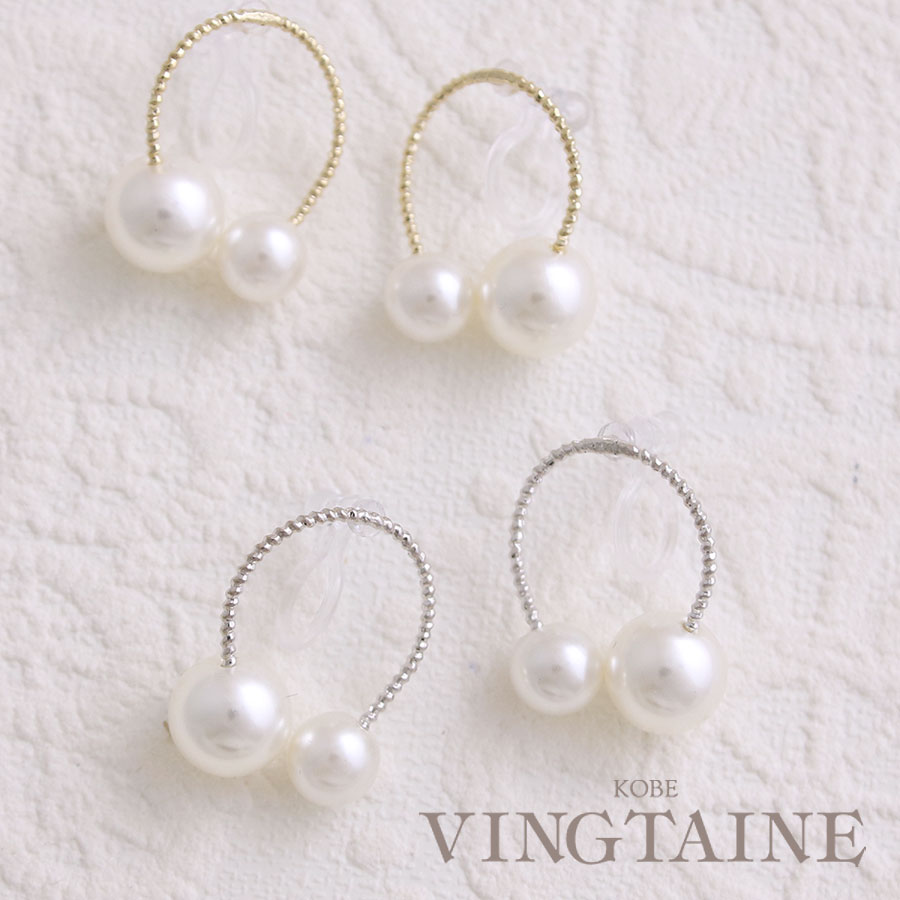 ダブルパール付きリングノンホールピアス 樹脂イヤリング 金属アレルギー