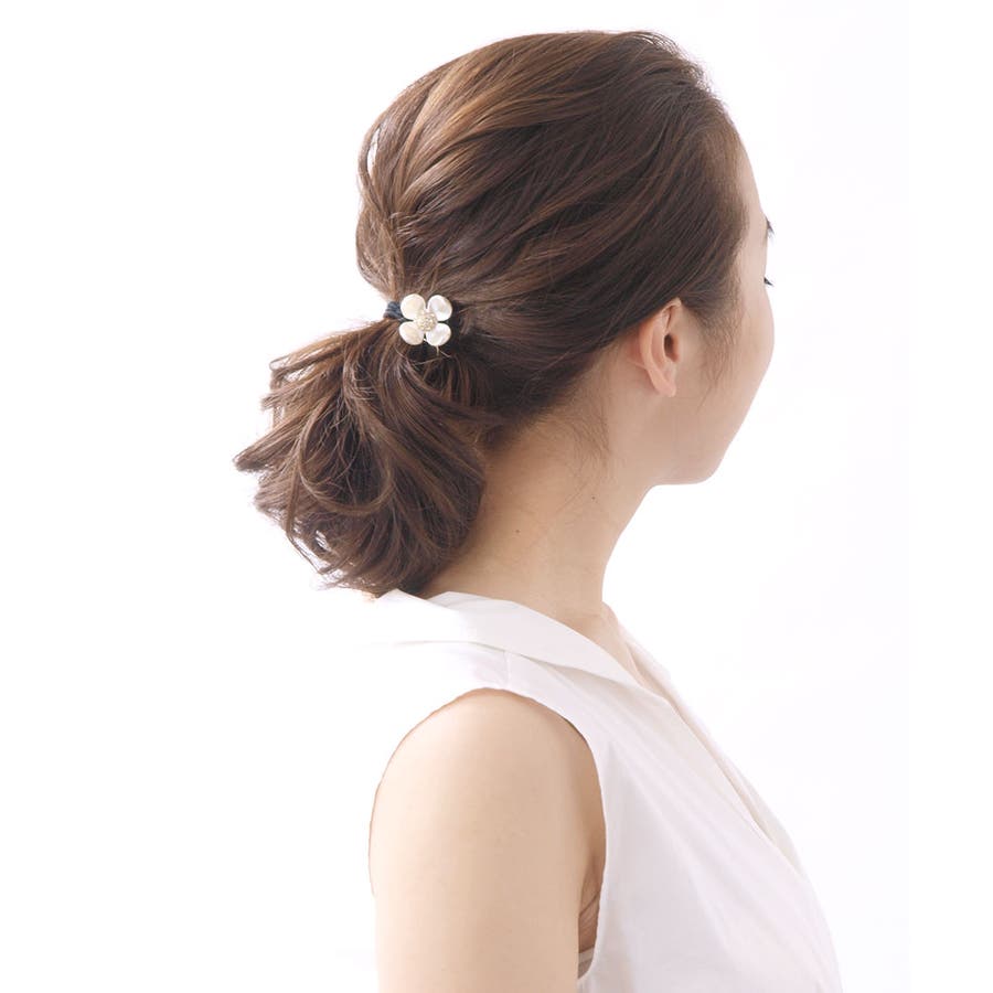 少し丸みを帯びた花びらとパヴェの輝きが特徴のヘアゴム。コーディネートの邪魔にならない程よい大きさが使いやすい。ラインストーンが敷き詰められた中央部は動くたびにキラリと光り、さりげなく存在感をアピールしてくれます。デイリーはもちろん、パーティーシーンでも使えるデザインはひとつあると便利ですよね♪