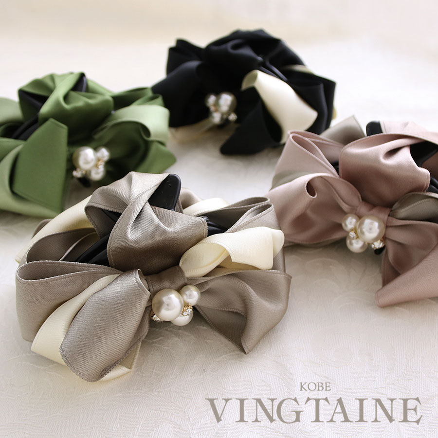 パールビジュー付きリボンバンスクリップ ツートーン 上品