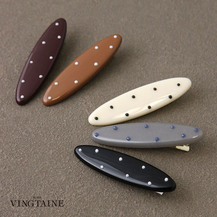 細身のフォルムが頭の形に自然となじみ、留めるだけで上品にまとまる万能デザインです。落ち着いたニュアンスカラーと控えめなドットが大人の遊び心を演出。