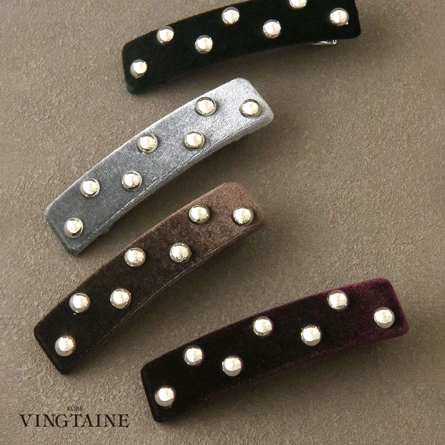 上品なベロア生地に、メタルボールをバランスよくあしらったくちばしクリップ。柔らかな素材感とシャープな輝きのコントラストが、髪に立体感と華やぎを添えます。