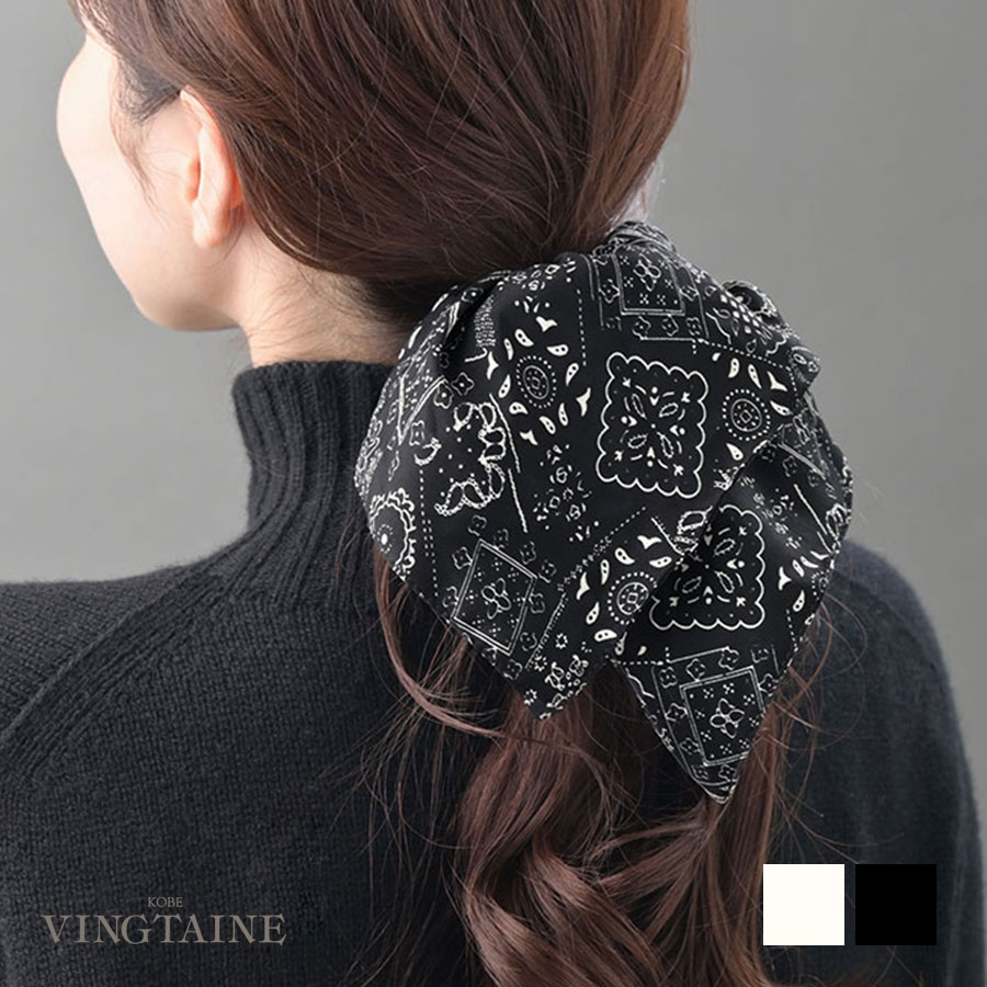 軽やかに広がるスカーフ柄の素材が、シンプルなヘアアレンジを一気に洗練して見せてくれます。結んだ毛先や低めのポニーテールにもフィットし、後ろ姿に華やぎをプラスします。