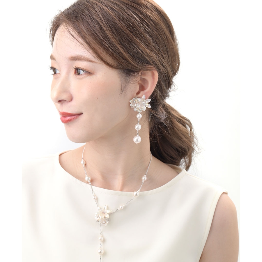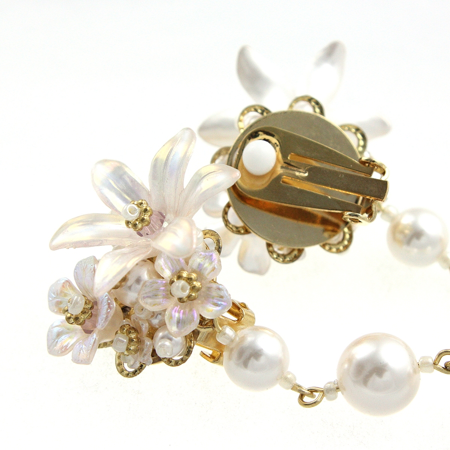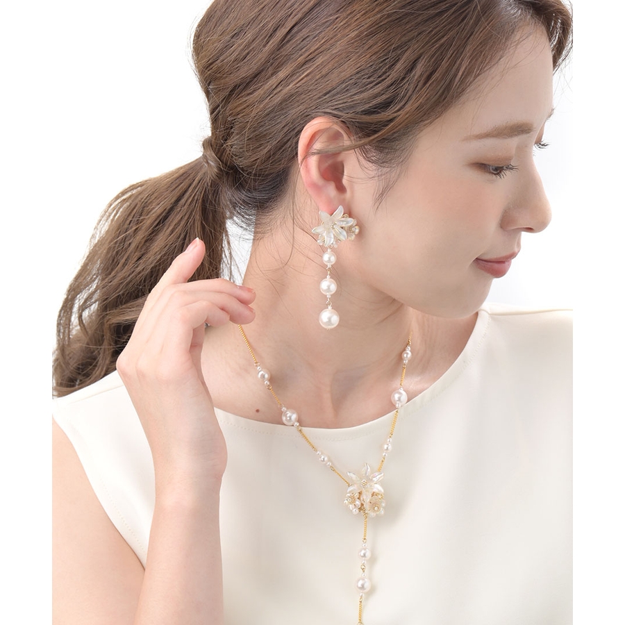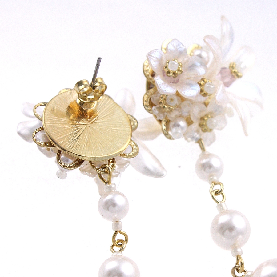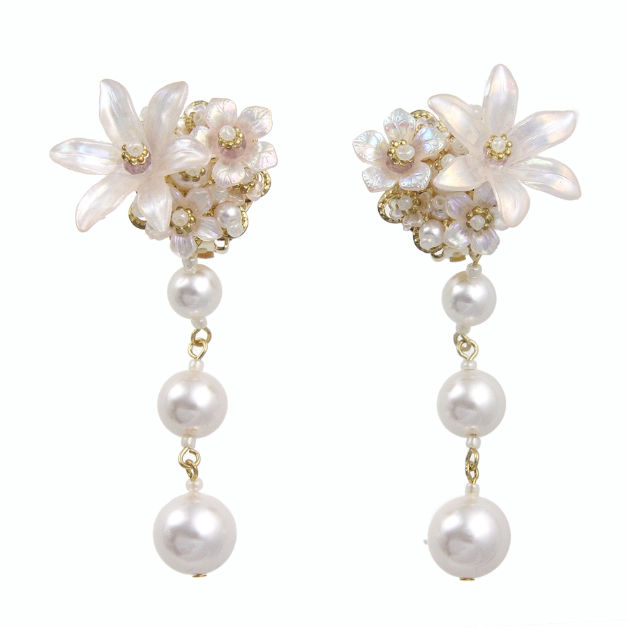 スイートな雰囲気を振りまく、パール調のフラワーがポイントのピアス。つけるだけでお顔周りがパッと華やぐボリューム感がポイント。表情を女性らしく印象付けてくれる、ブーケのような可憐なフラワーデザインが魅力です。