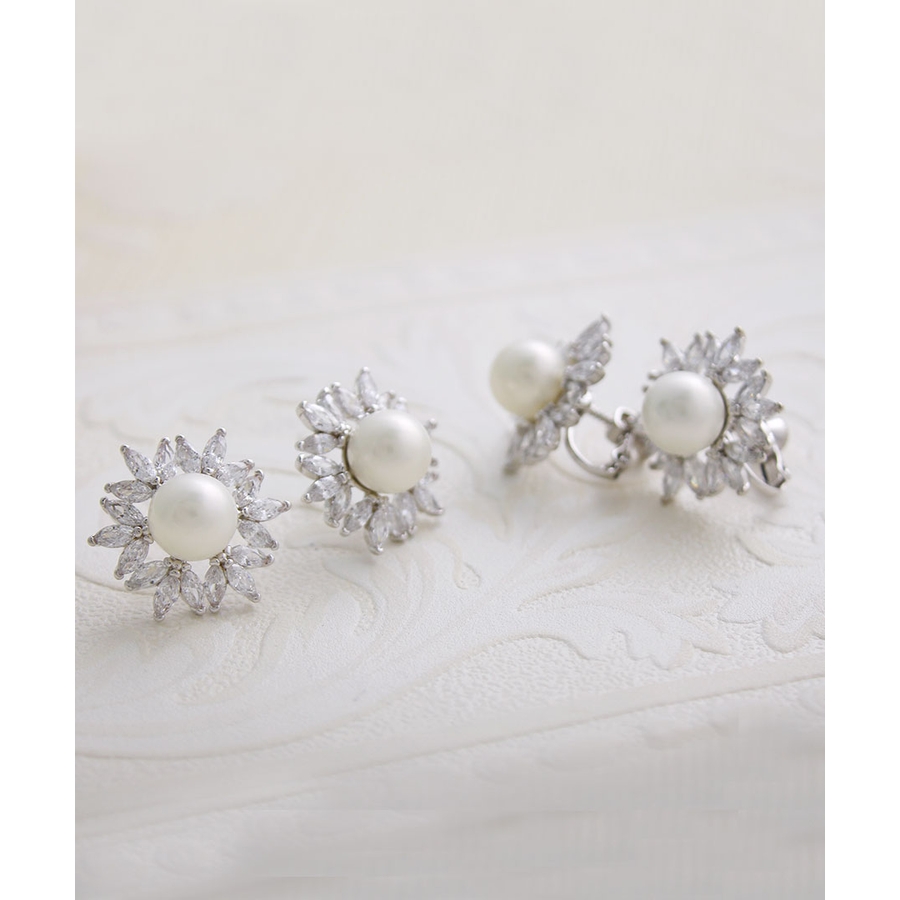 お花のようなシルエットが清楚で上品な印象のピアス/イヤリング。立体的だからサイドから見ても存在感があって、耳元のアクセントにぴったり。美しく煌くビジューでお顔周りをぐっと華やかに見せてくれるので、日常使いはもちろん、パーティーシーンにも活躍してくれそう!