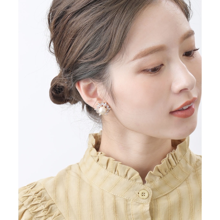 お花のようなシルエットが清楚で上品な印象のピアス/イヤリング。立体的だからサイドから見ても存在感があって、耳元のアクセントにぴったり。美しく煌くビジューでお顔周りをぐっと華やかに見せてくれるので、日常使いはもちろん、パーティーシーンにも活躍してくれそう!