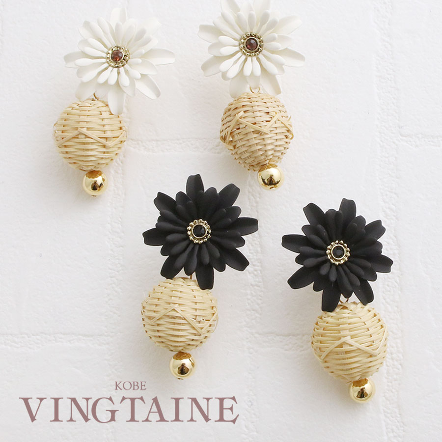 ラタンボール×フラワーロングピアス イヤリング 大ぶり