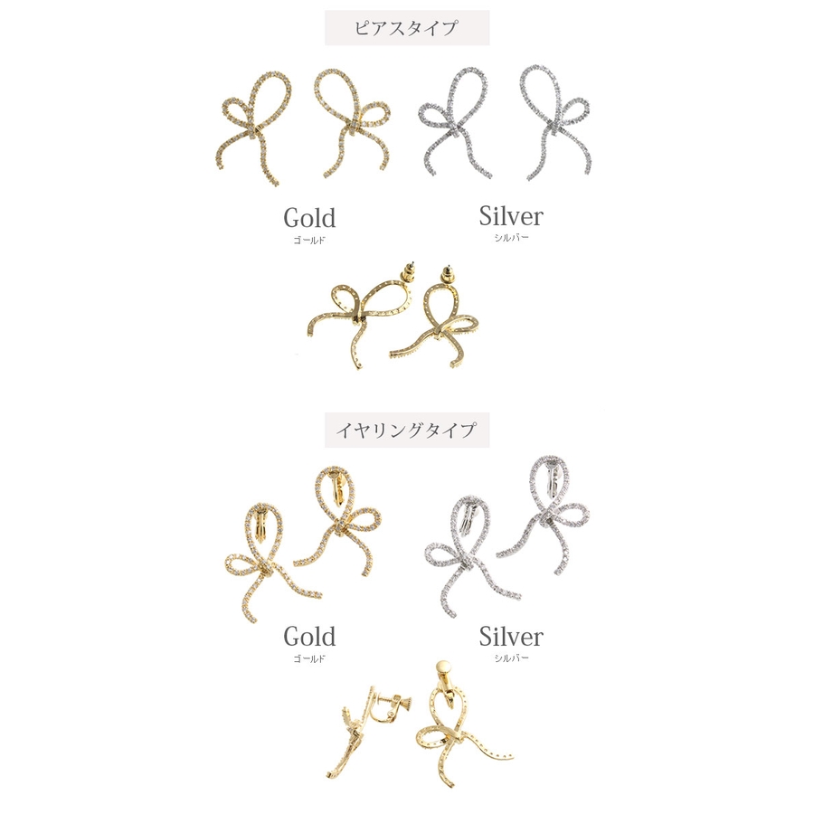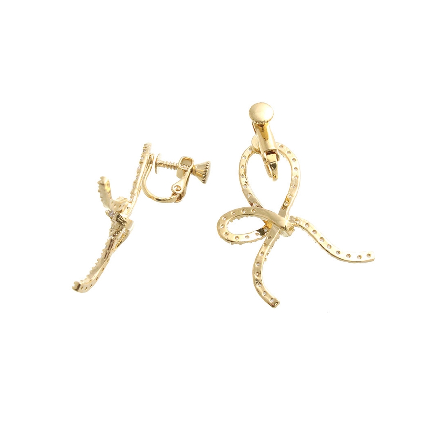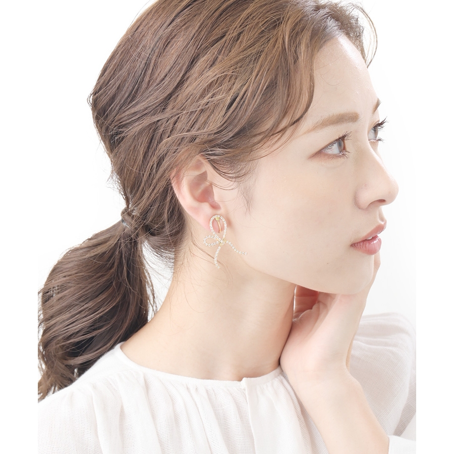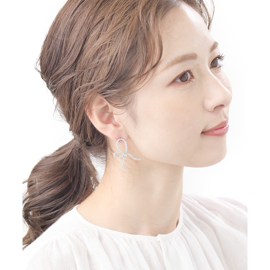 スタイリッシュに楽しめる大人の女性のためのリボンピアス・イヤリング。甘くなりがちなリボンモチーフを、上品な輝きをまとったラインだけでアレンジ。アシンメトリーなシルエットで美しい縦のラインを作り出してくれます。大きさも印象的なサイズだから、繊細な輝きをたっぷりと振りまいて、大人っぽく楽しめます。