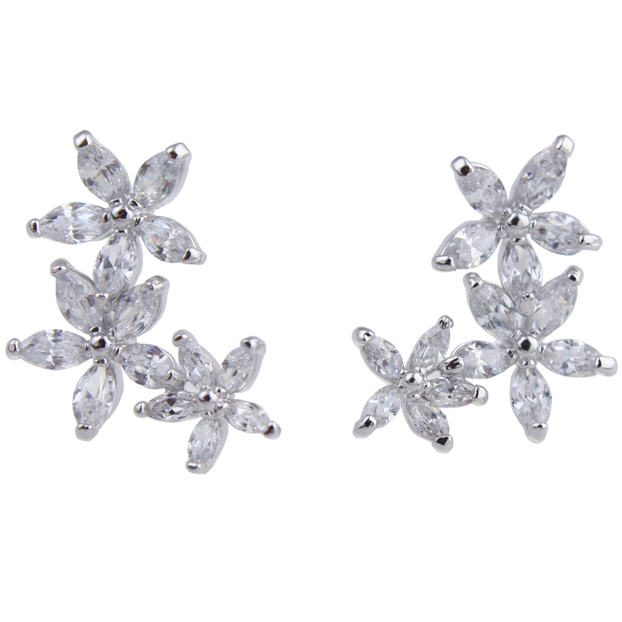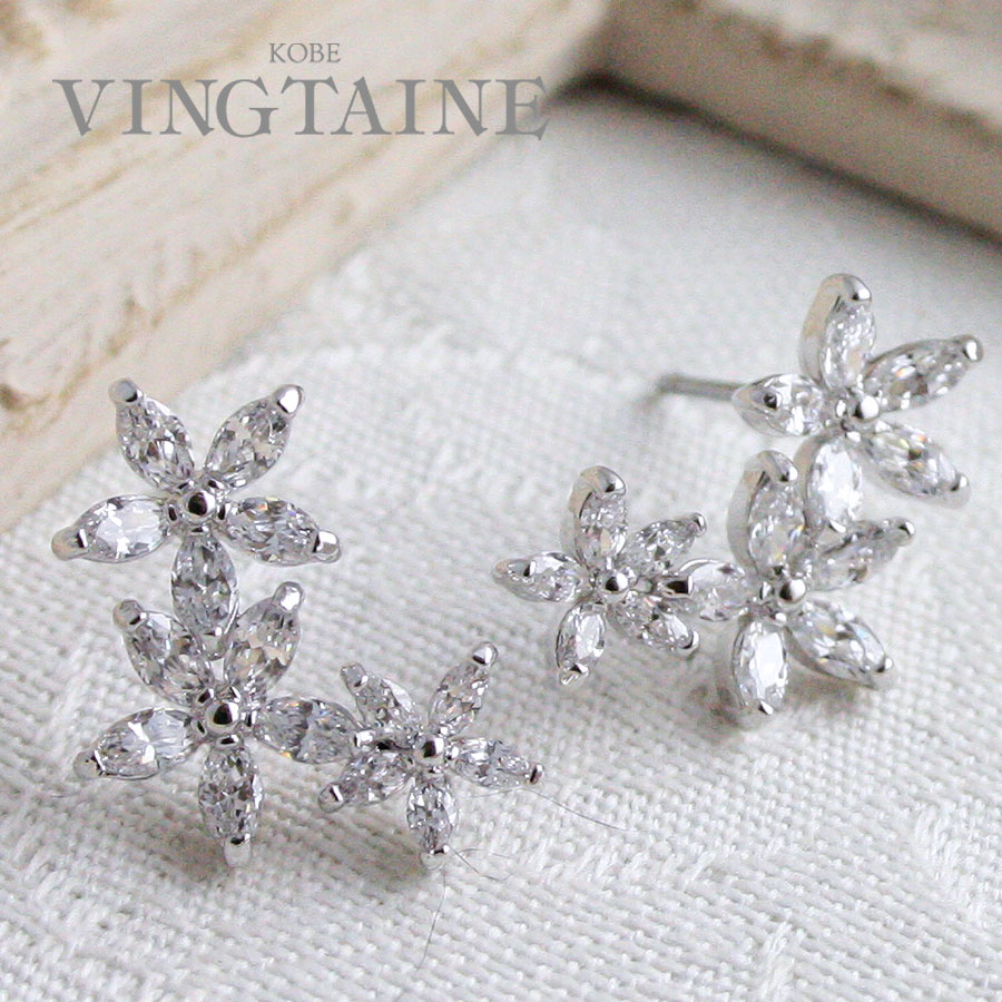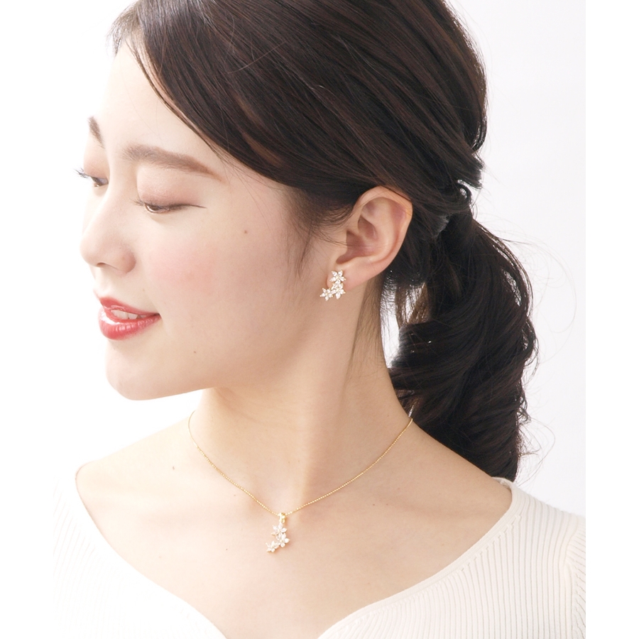 キュービックジルコニアで模った、流れるような3連のお花が美しいピアス。きらめくお花が顔周り華やかに彩ってくれそう。