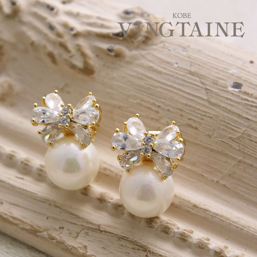 ビジューリボン×パールピアス キュービックジルコニア 可愛い