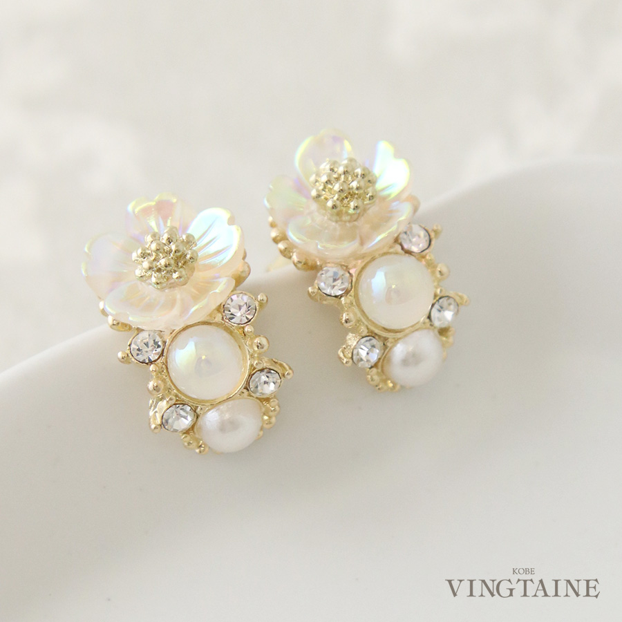 角度によって様々な表情を見せるシェル調のお花とパールの組み合わせが、上品で洗練された印象を与えます。女性らしさを引き立てるフェミニンなフラワーデザイン。大人可愛い雰囲気を演出します。