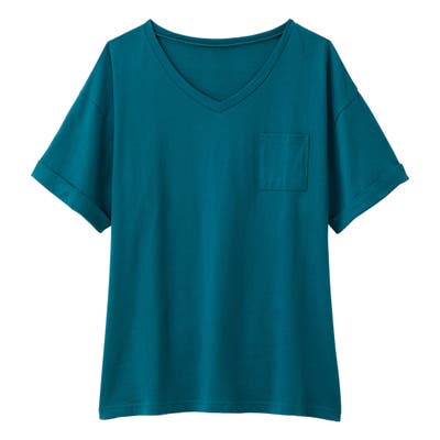 Tシャツのシルエットは少しゆったりと仕上げ、気になる体型をしっかりカバー。きれい見えするVネックで、ゆるっとしたTシャツもすっきりと着こなせます。シンプルなデザインなので、着回し力抜群です。