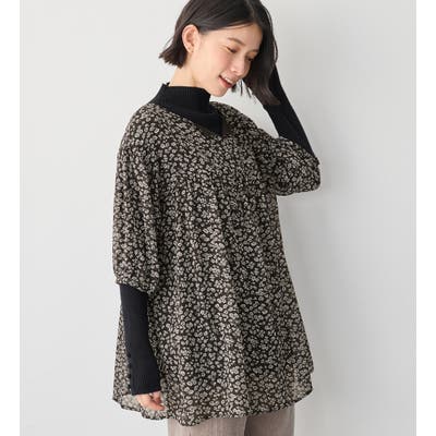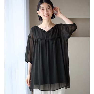 表地は、透け感のあるシフォン素材のブラウス。インナー部分は、接触冷感・吸水速乾・UV対策・抗菌防臭・保湿加工の機能がついた綿混カットソーで、ブラウスでも肌に優しく夏でも快適な着心地に。ふわっとしたシルエットでおしゃれに体型カバーも叶う!