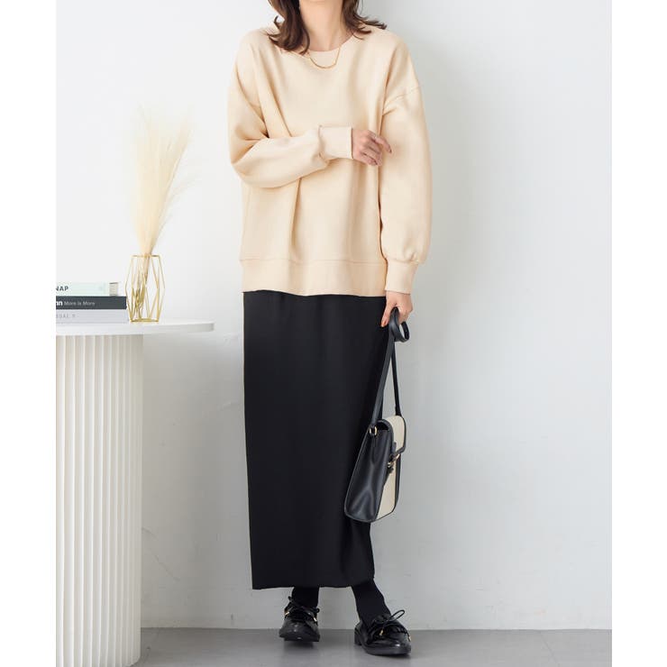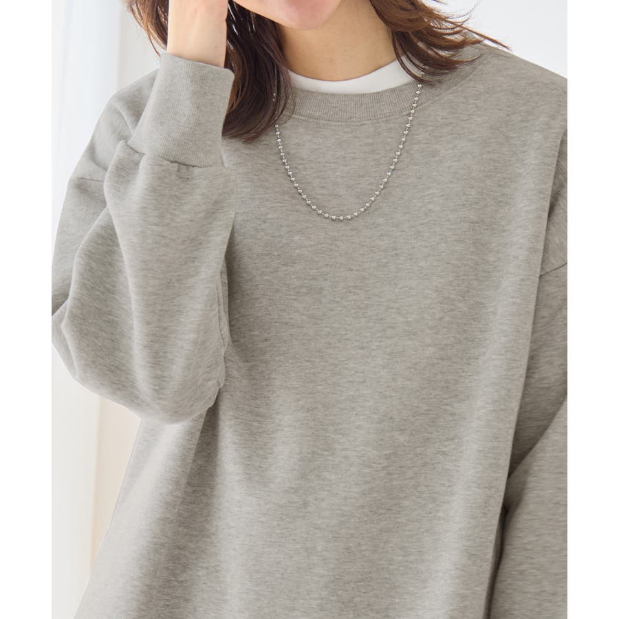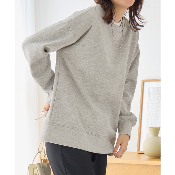 ・クルーネックデザインで首元がすっきりと見せ、カジュアル感を抑え大人っぽい印象に。