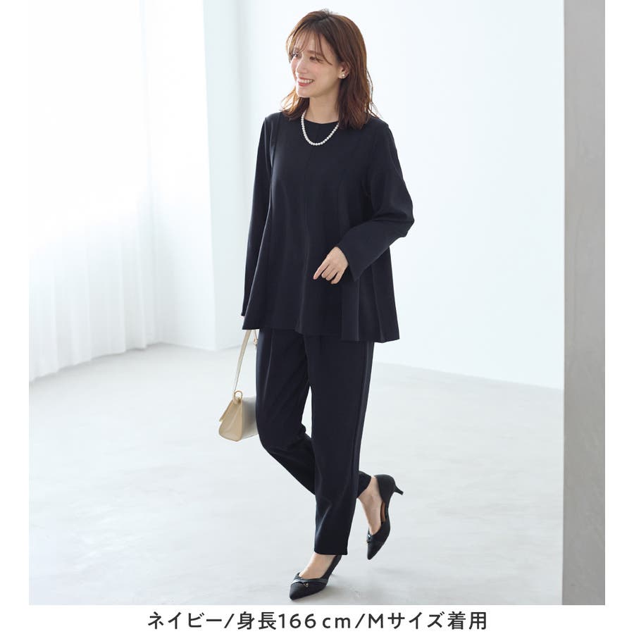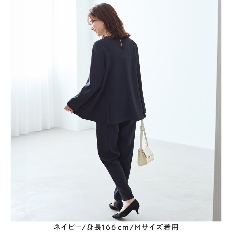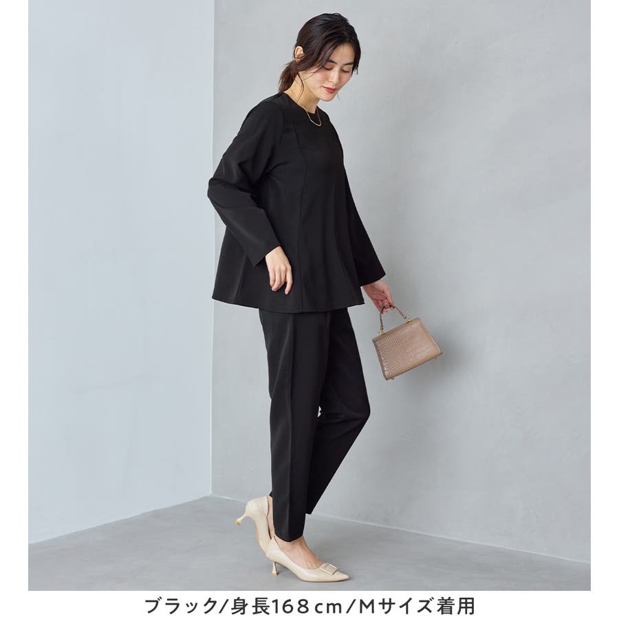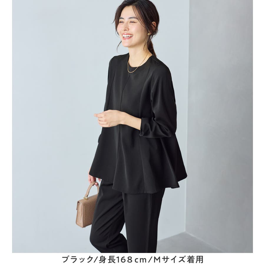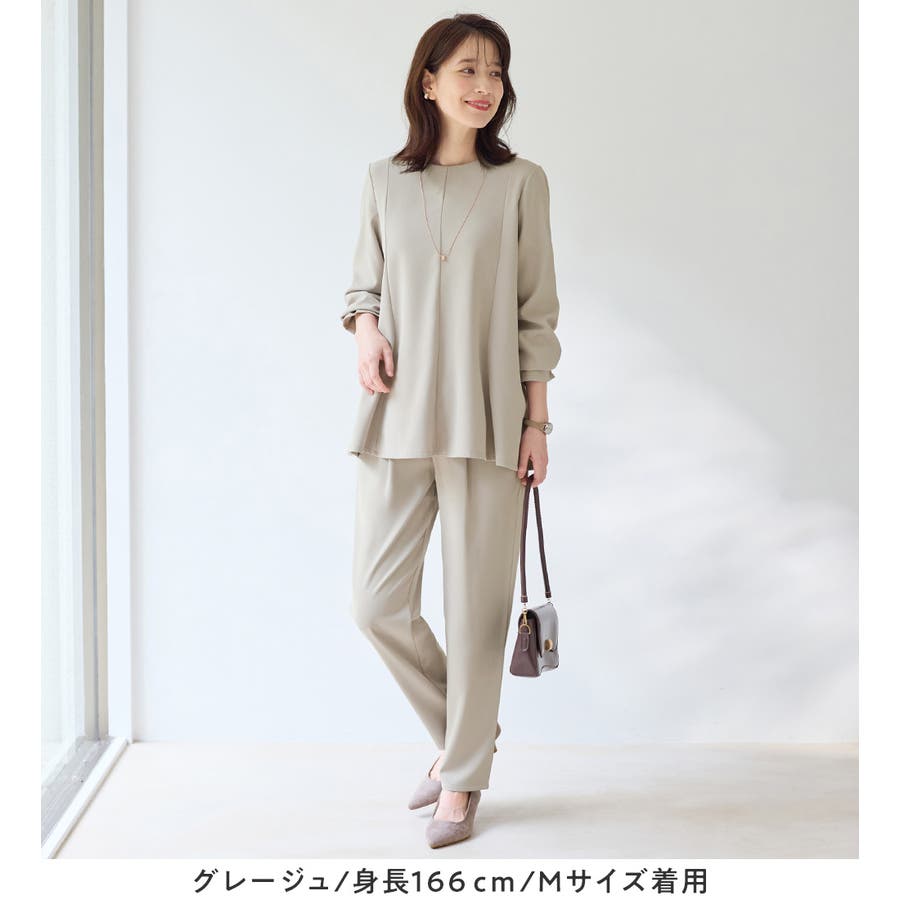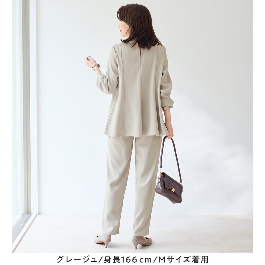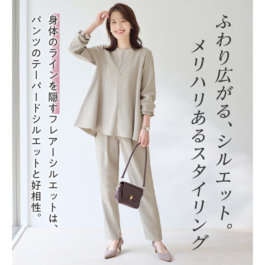 自然に体型カバーを叶えるフレアシルエットのブラウスとスッキリとしたテーパードパンツで上品に着られます♪
