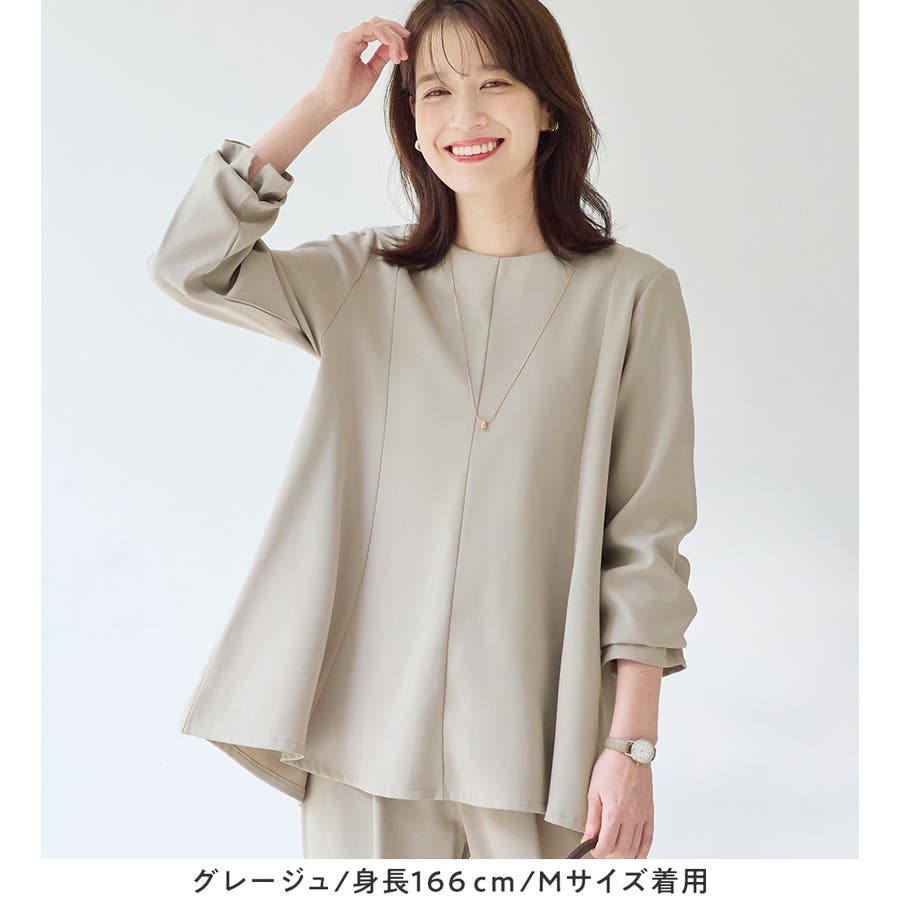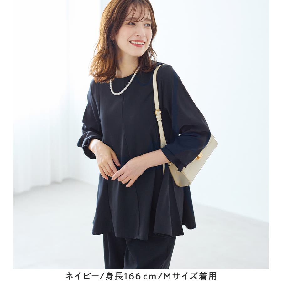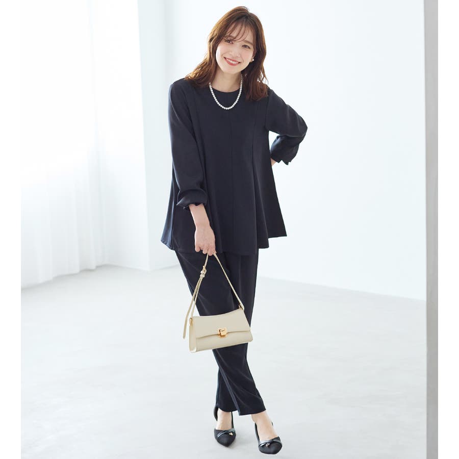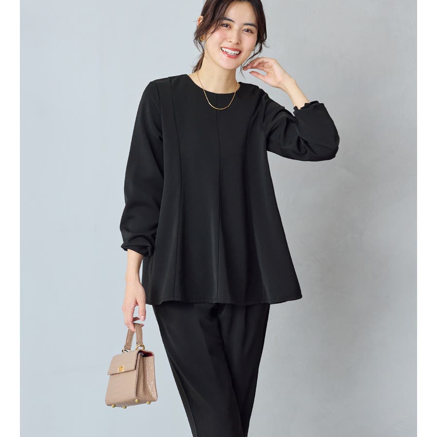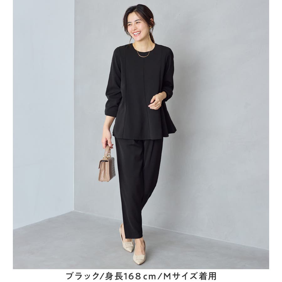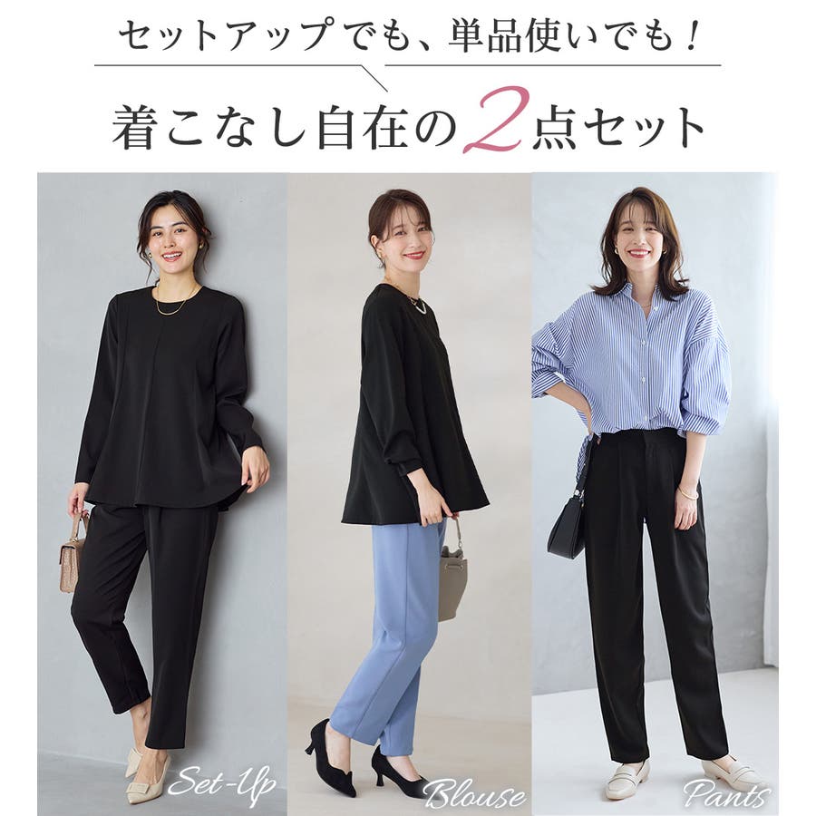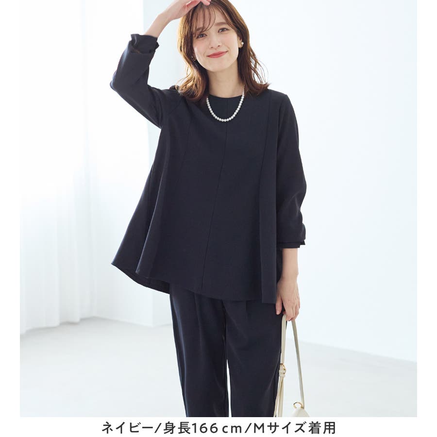 自然に体型カバーを叶えるフレアシルエットのブラウスとスッキリとしたテーパードパンツで上品に着られます♪