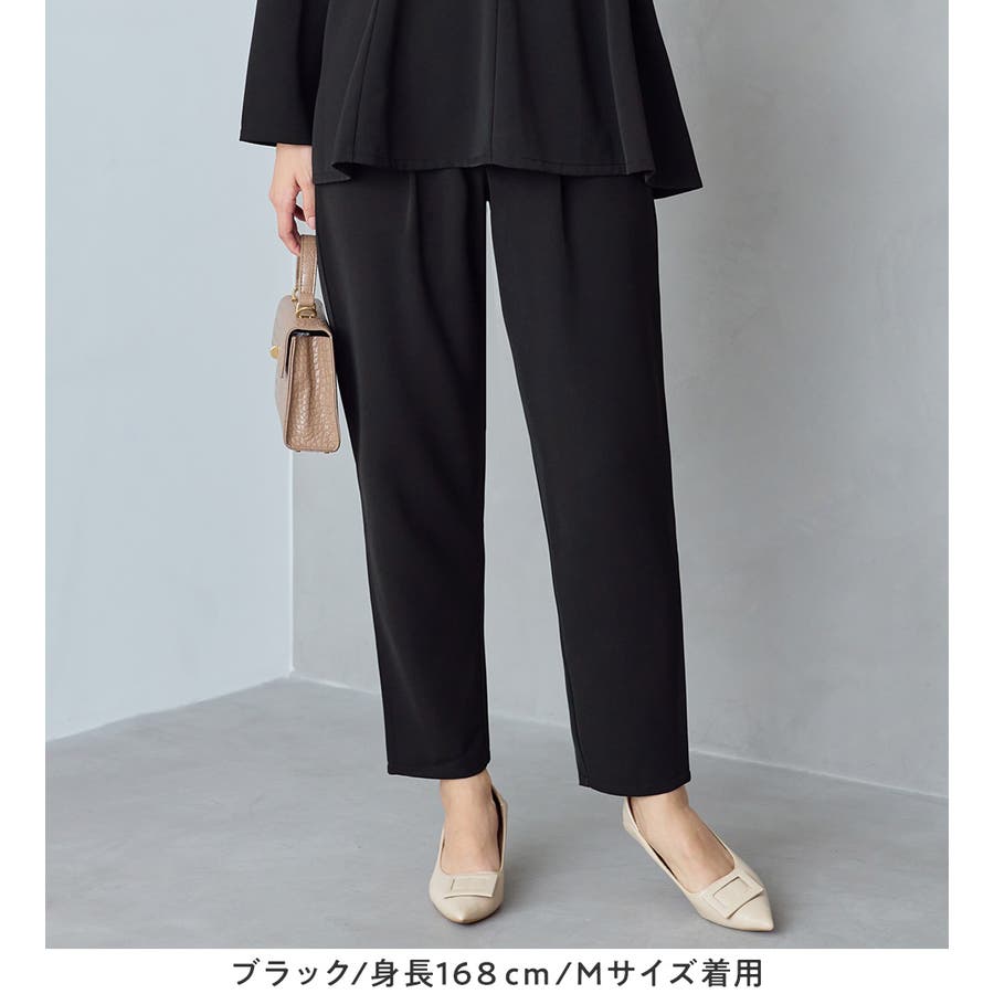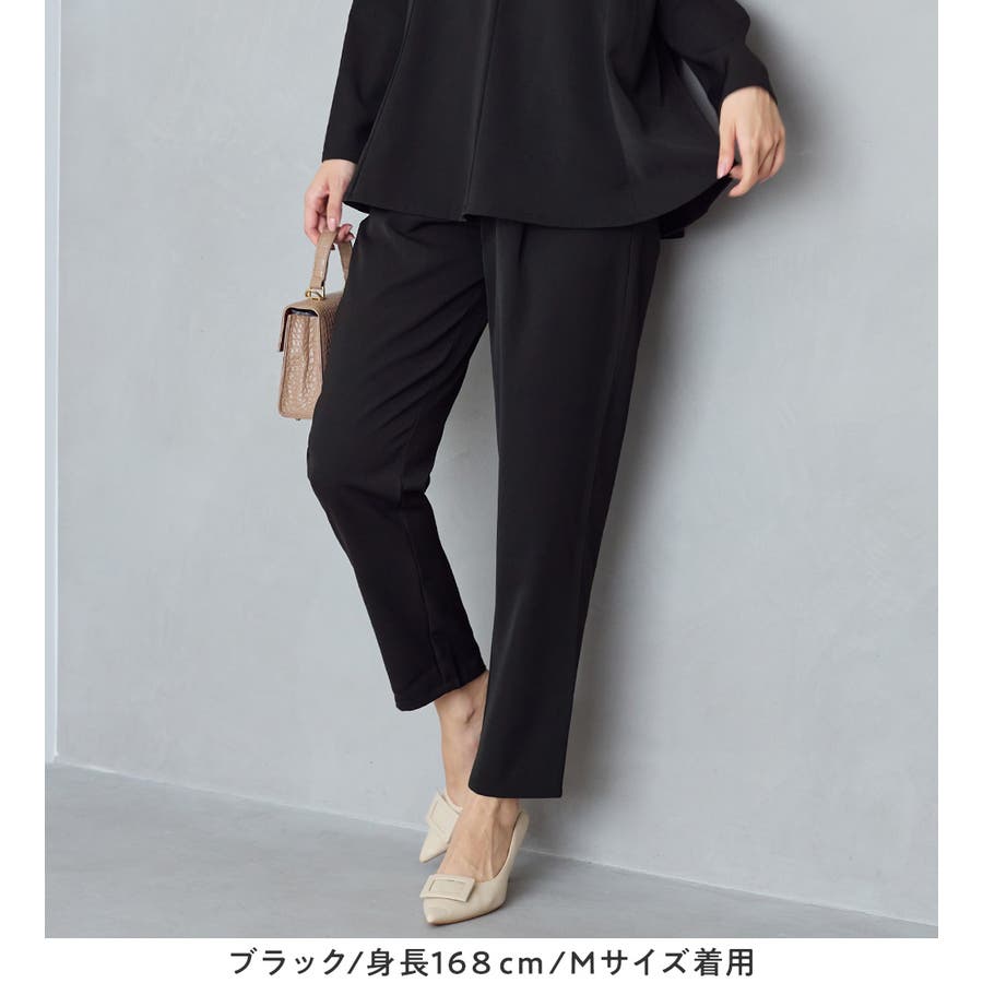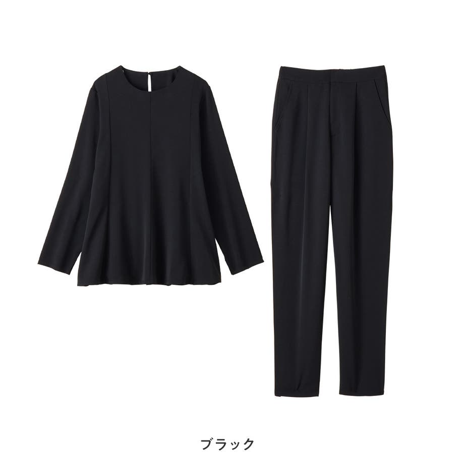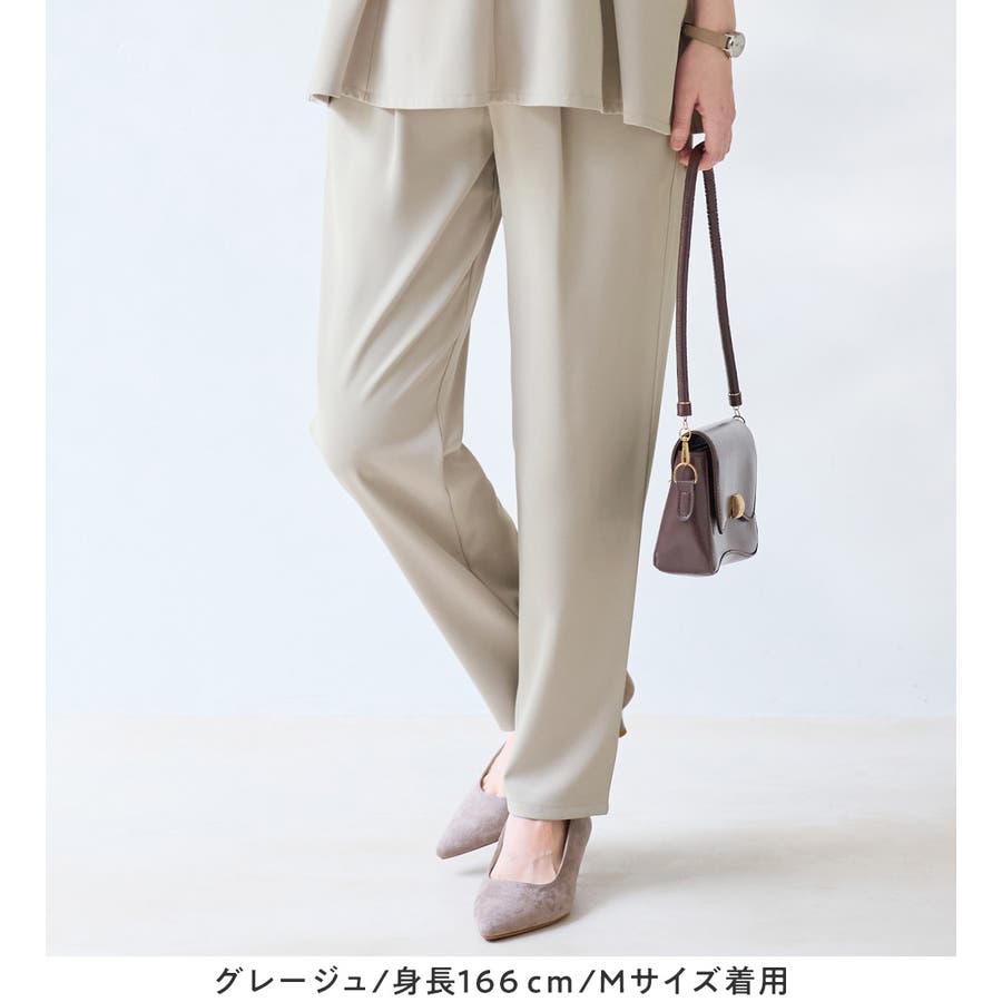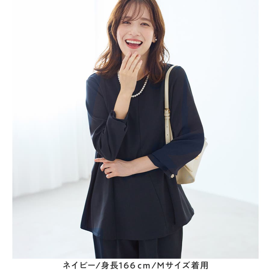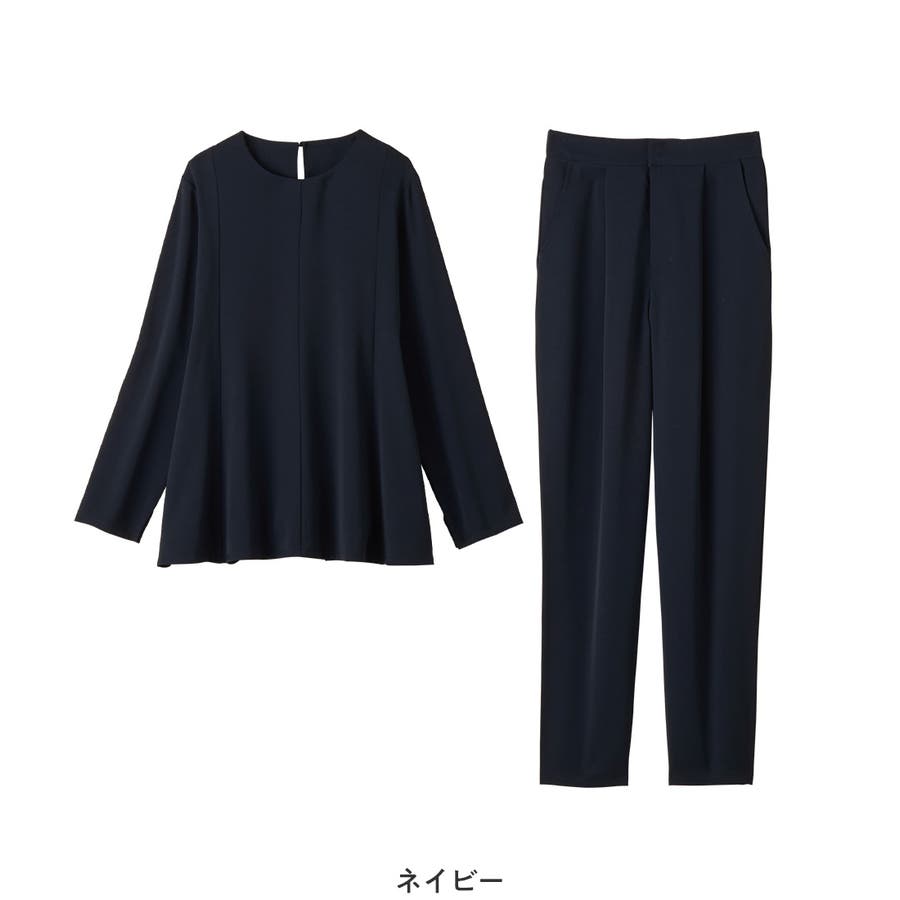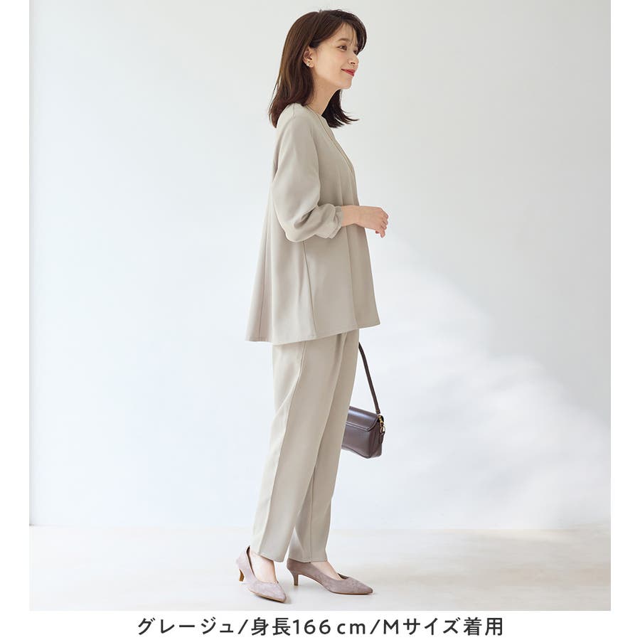 自然に体型カバーを叶えるフレアシルエットのブラウスとスッキリとしたテーパードパンツで上品に着られます♪