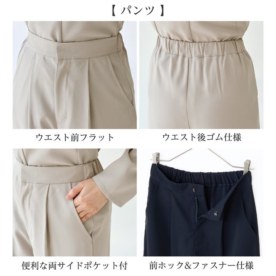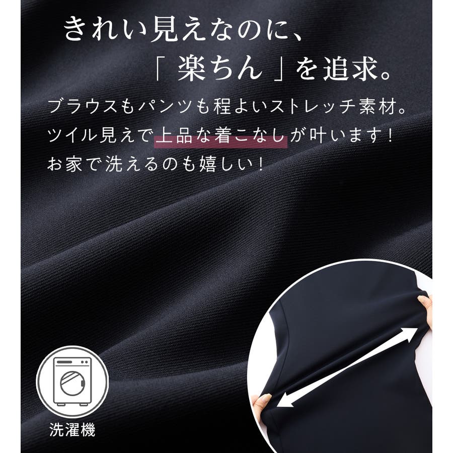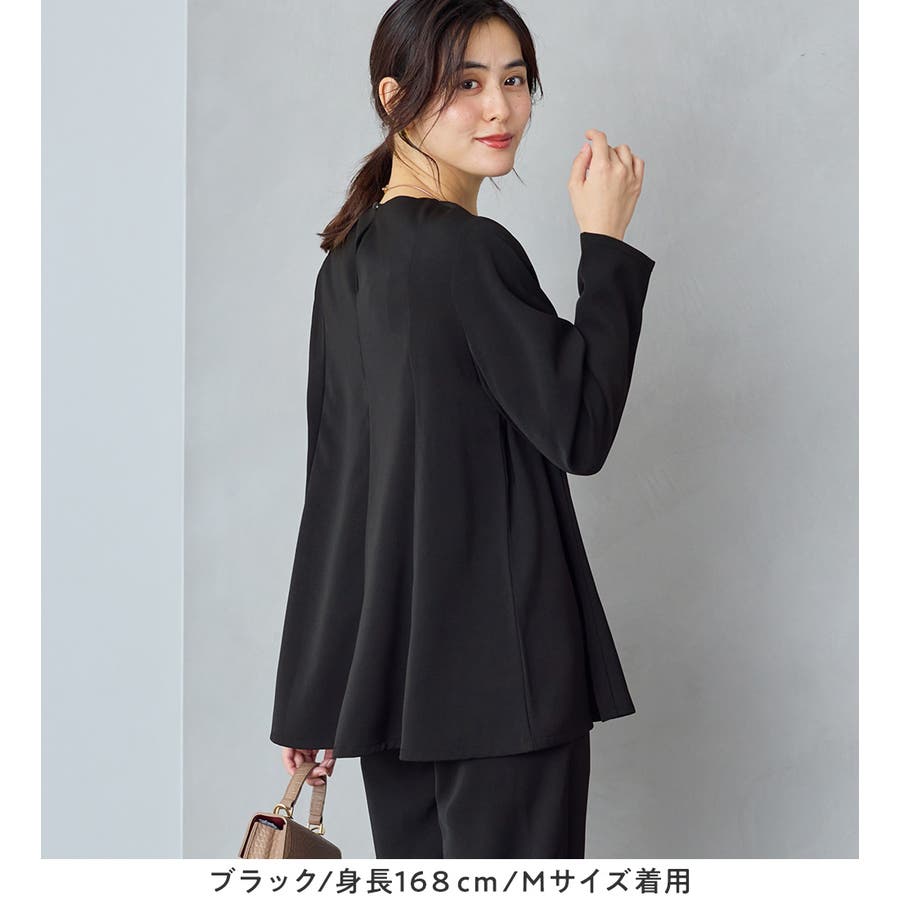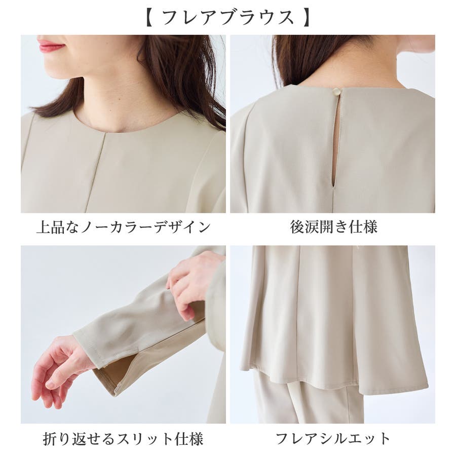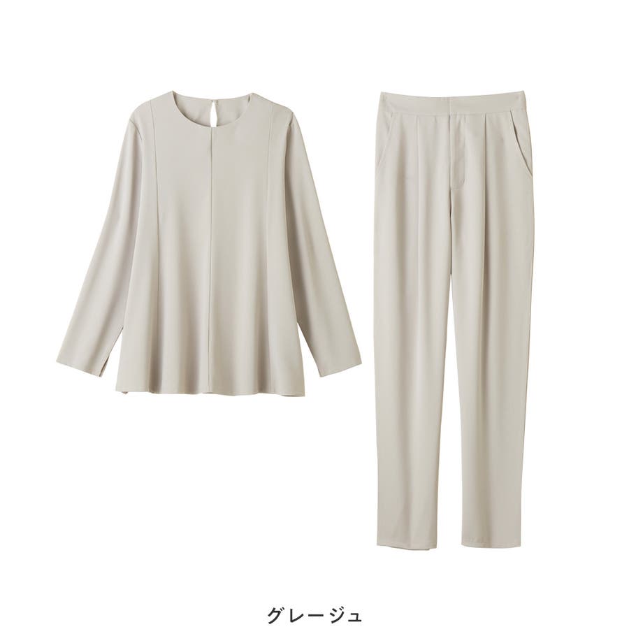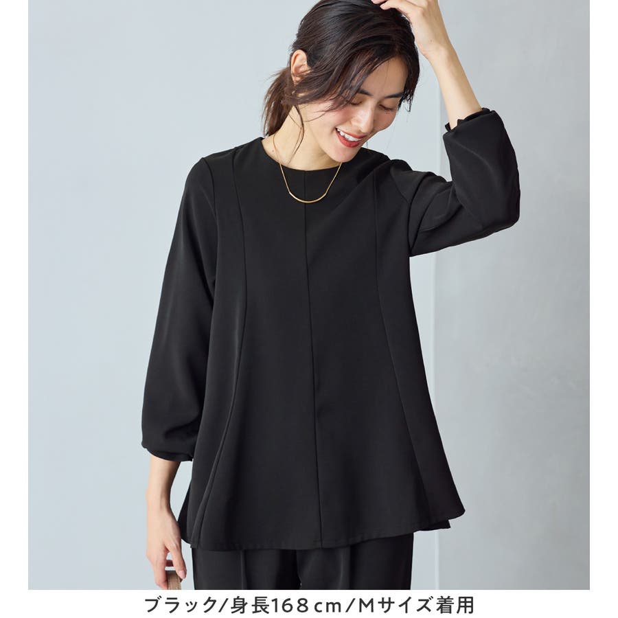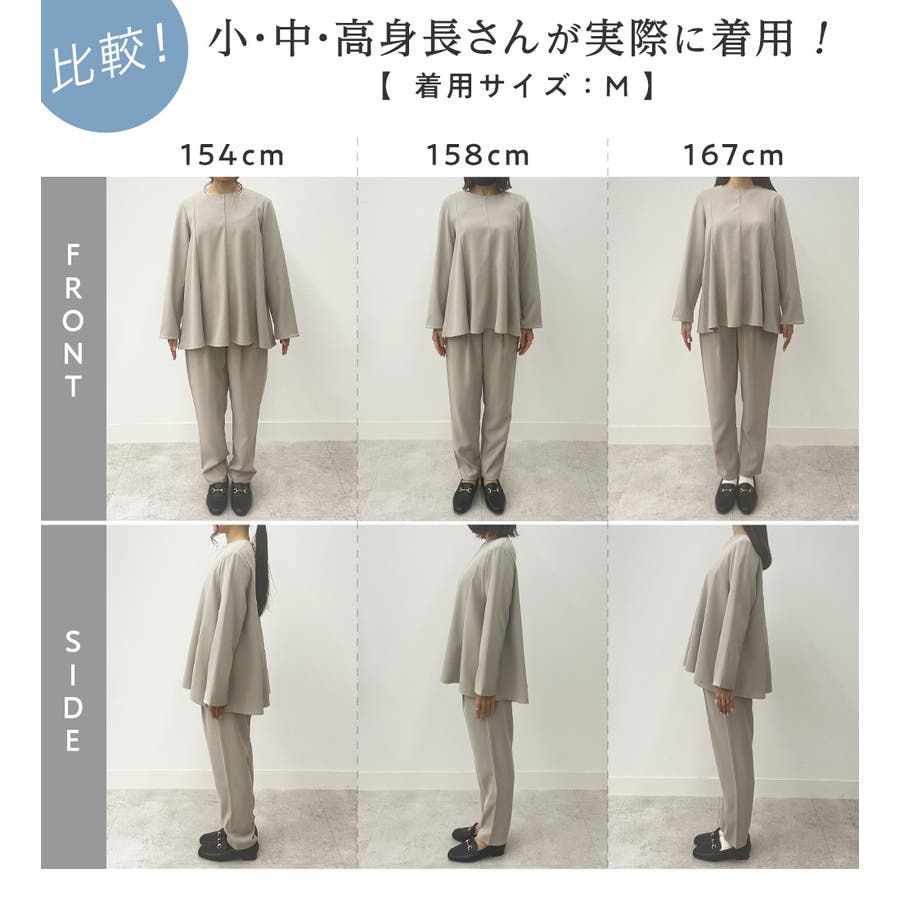 自然に体型カバーを叶えるフレアシルエットのブラウスとスッキリとしたテーパードパンツで上品に着られます♪