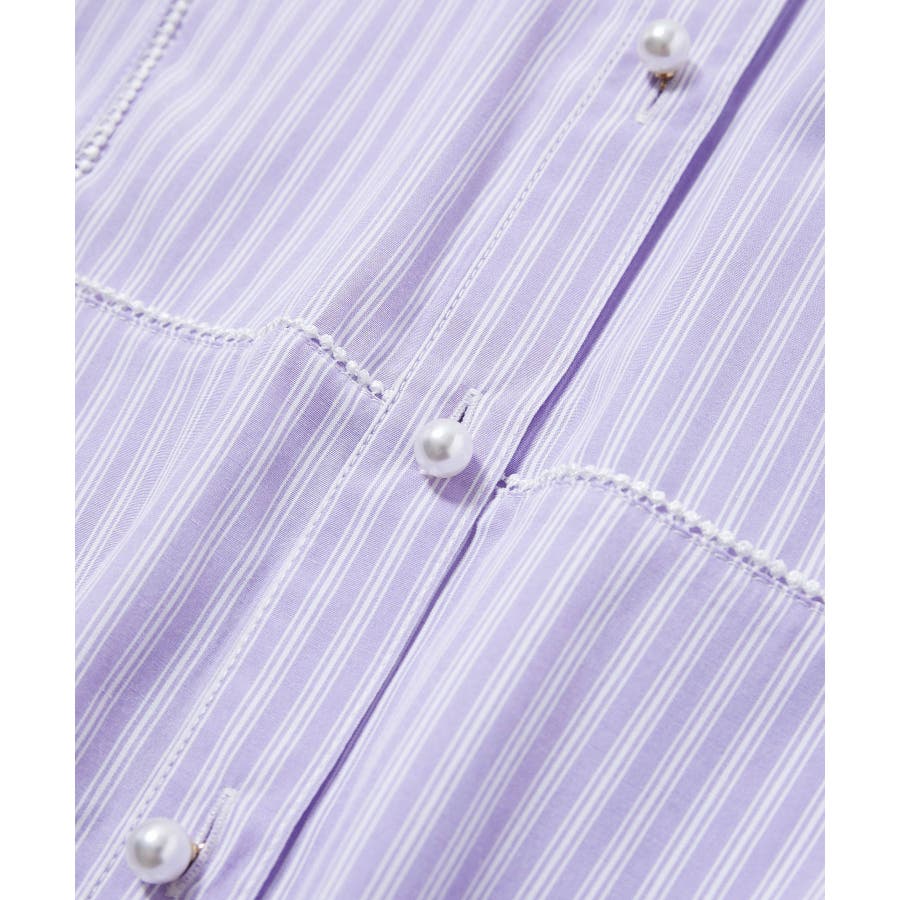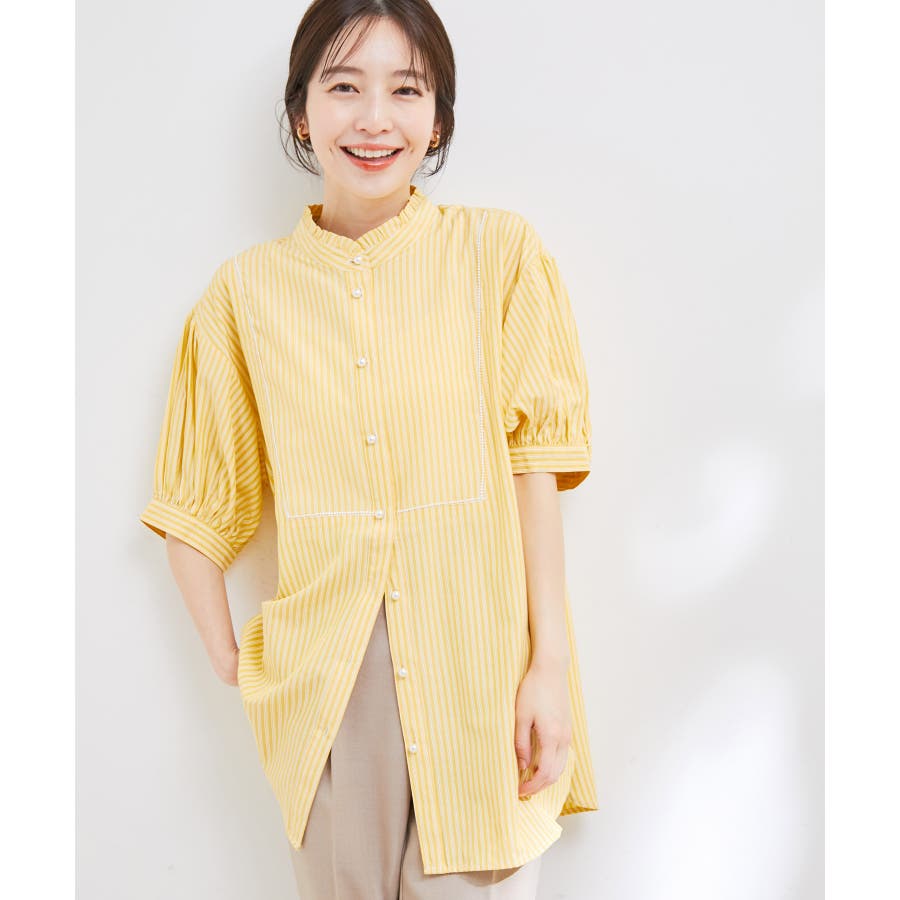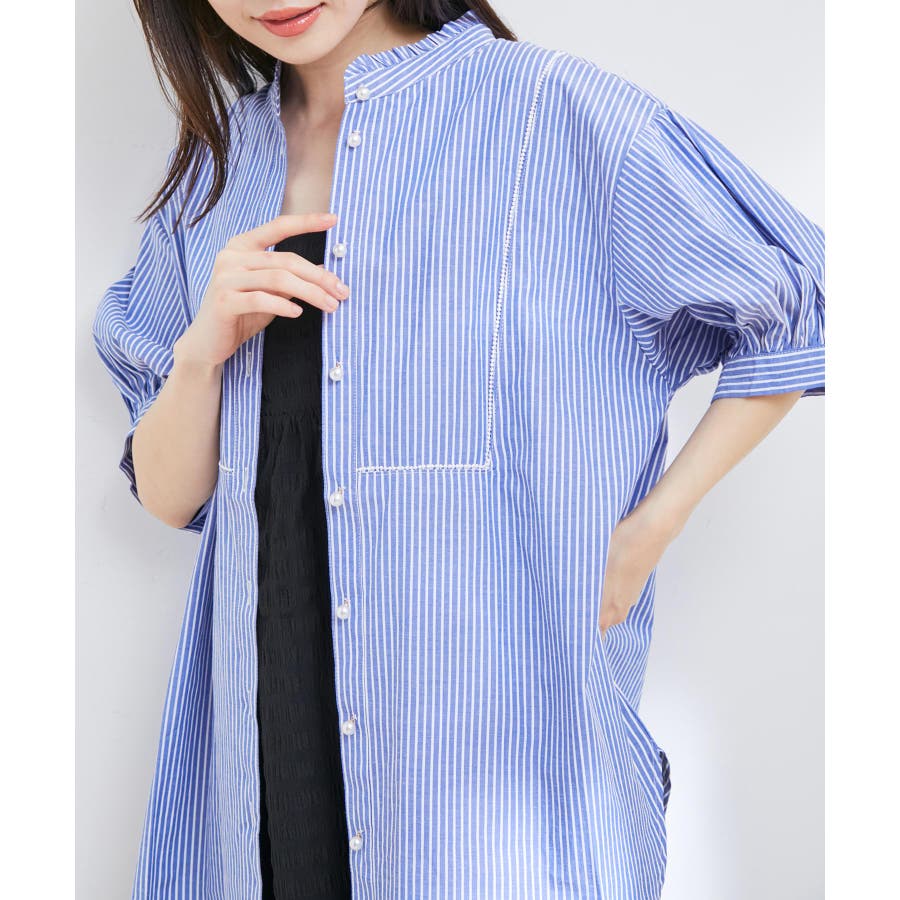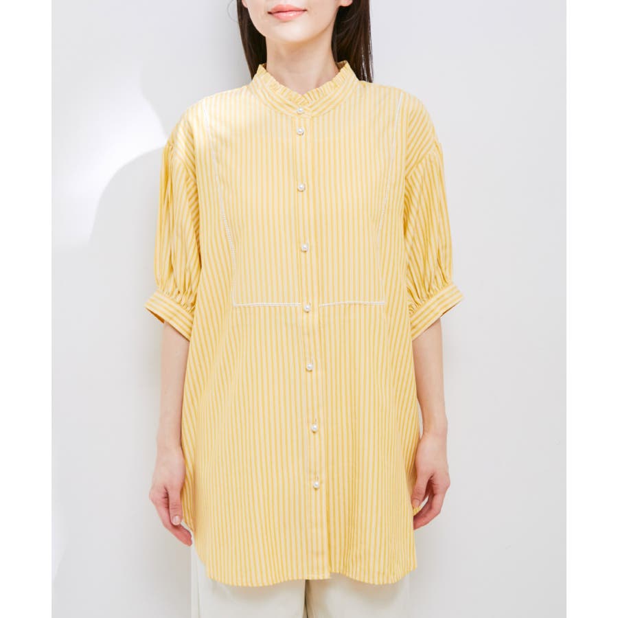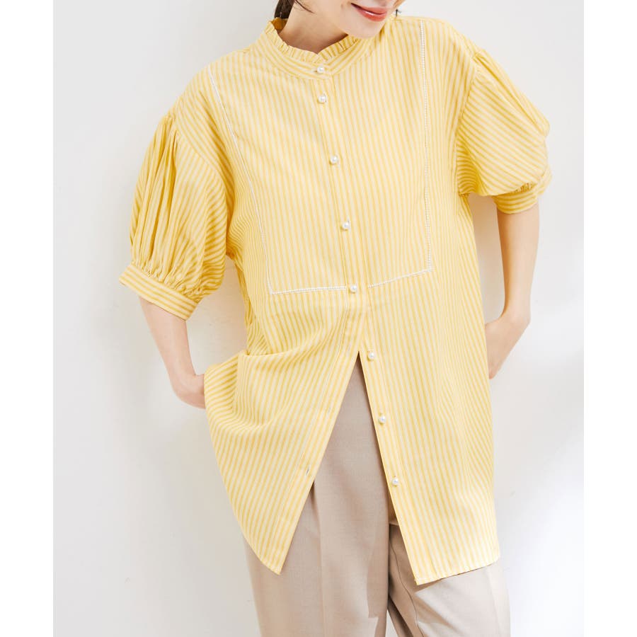 【vis-`a-vis/ビザビ】 女っぽくエッジの効いた好奇心旺盛なビザビスタイル 「Casual」「Feminine」へのこだわりのディテールと着映えするトレンド服を手軽な価格で提案 どこか必ず女性らしさを感じる魅せる今どきスタイル 【デザイン・シルエット】 切り替え部分にレースをはさみこんだ細部まで拘ったアイテムです。 釦はコロッとした大きめのパールを使用し、高見えと女性らしいディティールになっています。 裾はラウンドタイプで、インしてもアウトで着ても簡単に決まります。 フリル付きのスタンドタイプの衿なので重ね着もしやすいです。 袖はロングシーズン使いやすい上品な5分袖丈に。 同シリーズで長袖バージョン(BPH52000)もございます。 【素材】 どんなシーンでも合わせやすい細めのストライプ生地を使用しています。 シワになりにくいのも嬉しいポイント◎ ※カラーによって組成が異なります。 ネイビー・ピンク:(本体)ポリエステル 65% 綿 35%(レース部分)ポリエステル 100% ラベンダー・イエロー:(本体)ポリエステル 61% レーヨン 39%(レース部分)ポリエステル 100% 【カラー】 定番のネイビーに柔らかなカラーをプラスしたストライプ柄4色展開。 ラベンダーは完売しました。 【おすすめのスタイリング】 ボトムイン・アウトどちらでも◎ 衿だけ出したレイヤードスタイリングや前秋の羽織としてもおすすめです! ----------------------------- 裏地:なし 光沢感:なし 透け感:なし ポケット:なし 伸縮性:なし 生地の厚さ:やや薄手 ボタン:あり 季節:春~初秋 ----------------------------- 【モデル着用サイズ】 全色モデル身長:160cm、着用サイズ:F ※こちらは、WEB店舗限定の商品です。実店舗での販売はしておりません。 ※画像の商品はサンプルです。 実際の商品と仕様、加工、サイズが若干異なる場合がございます。