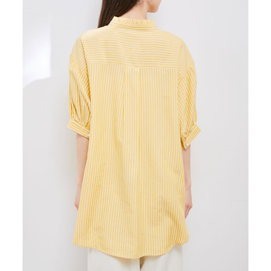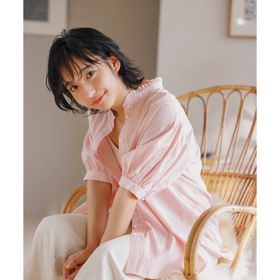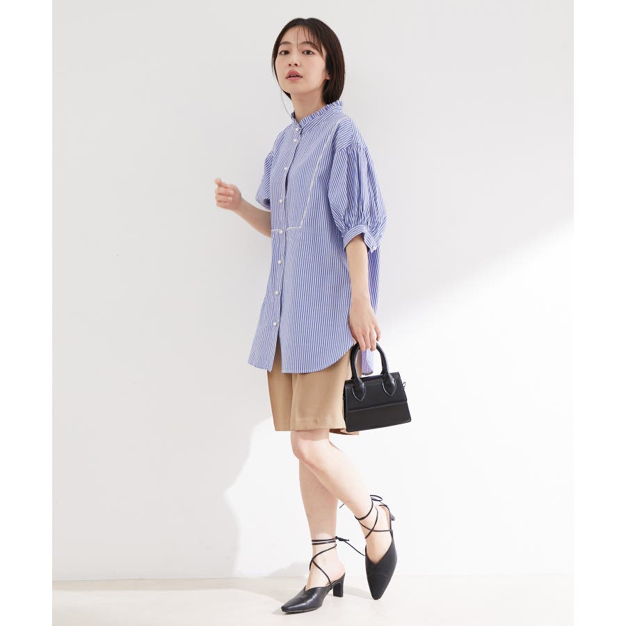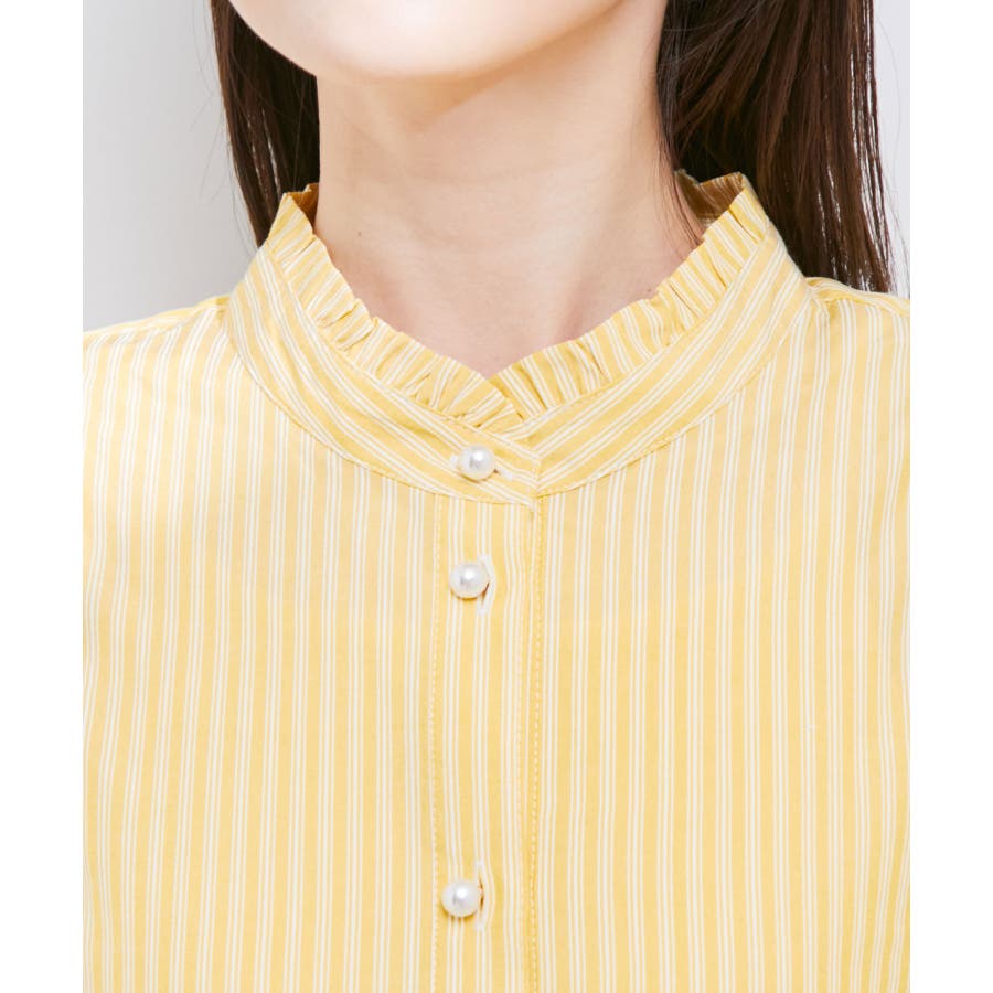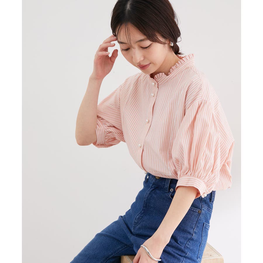【WEB限定】スタンドフリルストライプ5分袖ブラウス