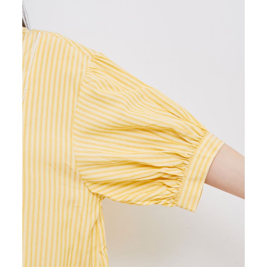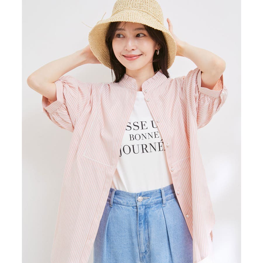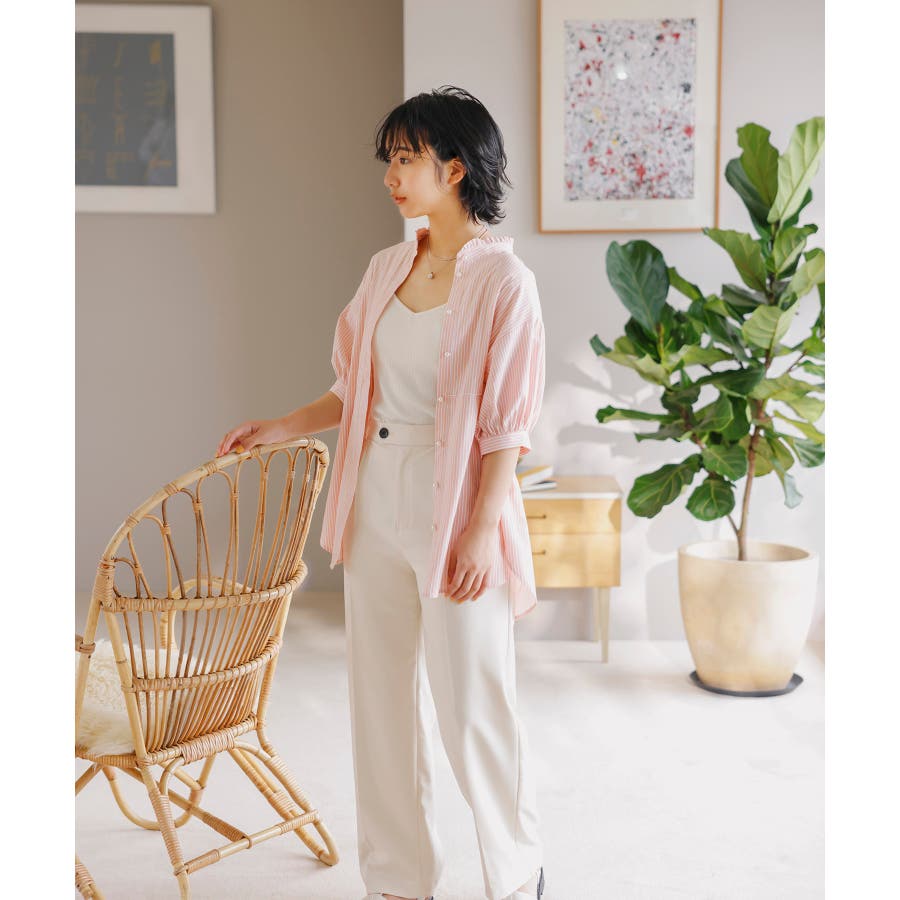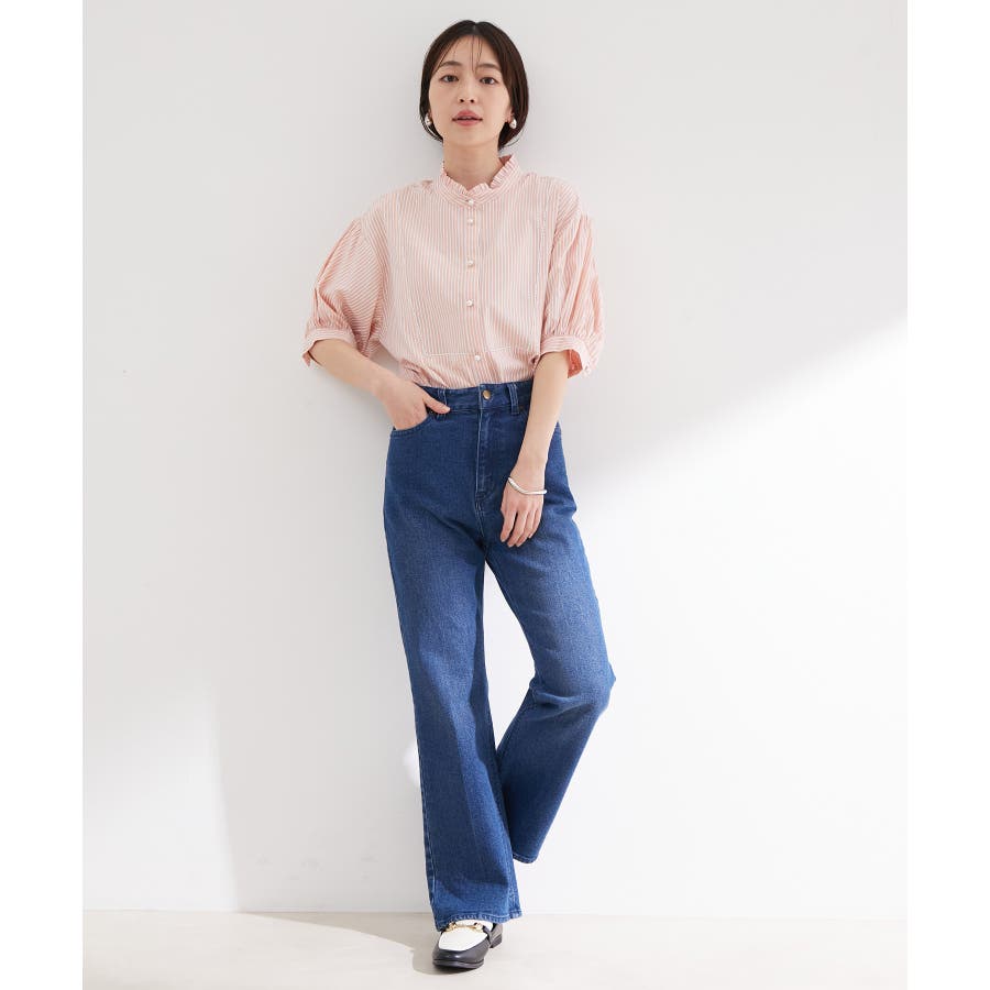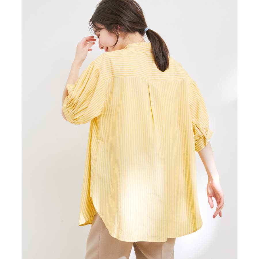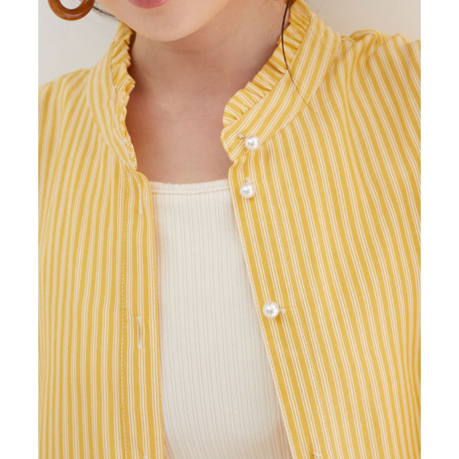 【WEB限定】スタンドフリルストライプ5分袖ブラウス
