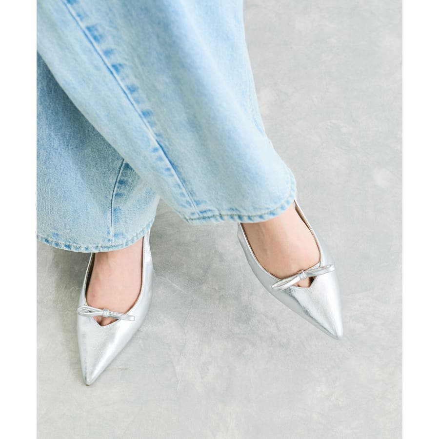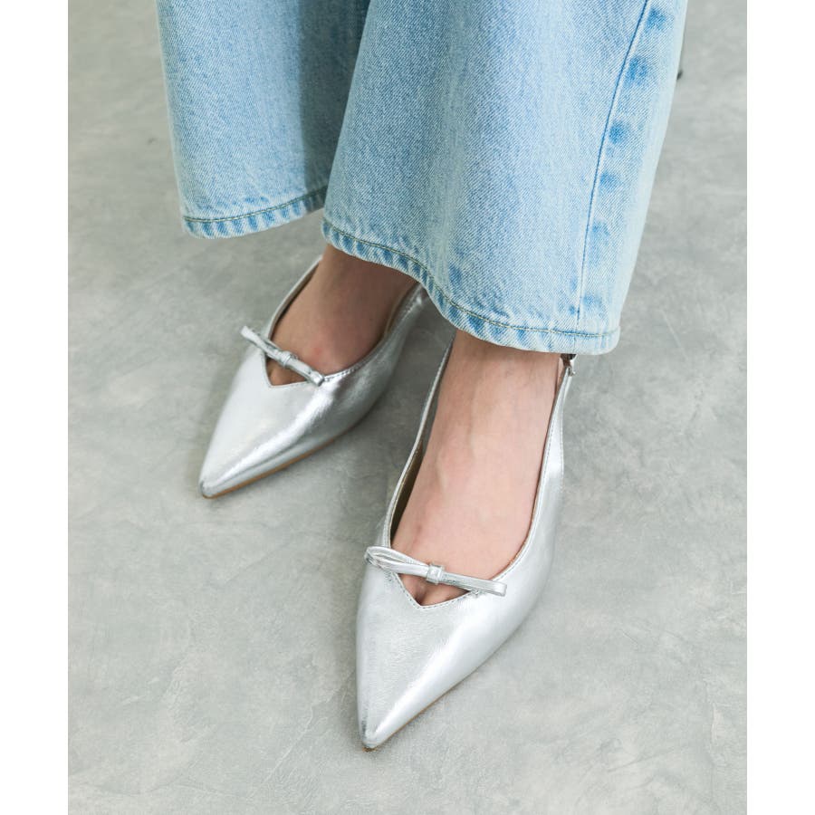 Vカットラインに掛かる華奢なフロントリボンが足先を女性らしく演出してくれるパンプス。