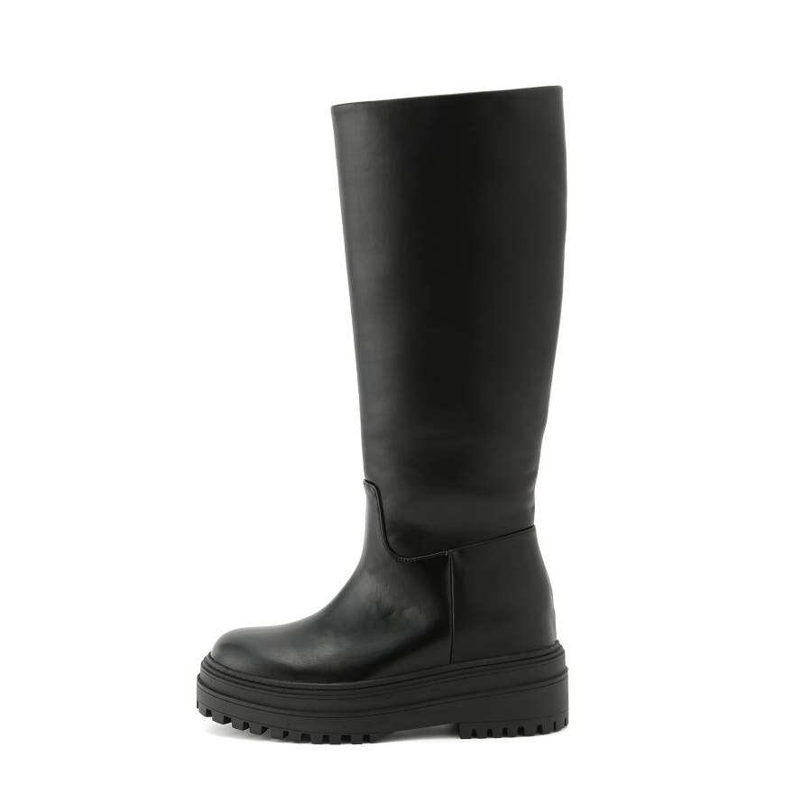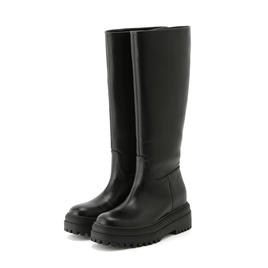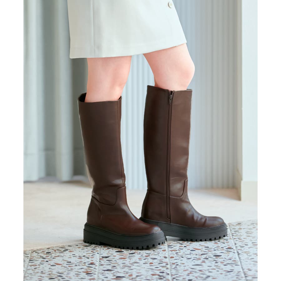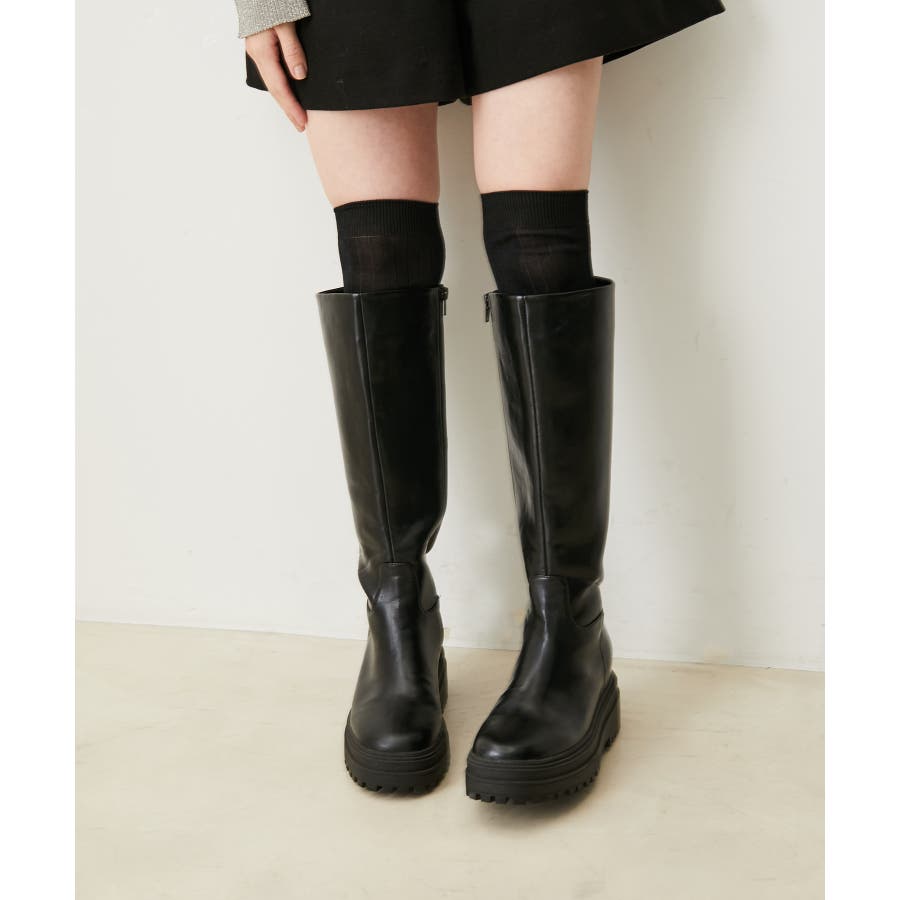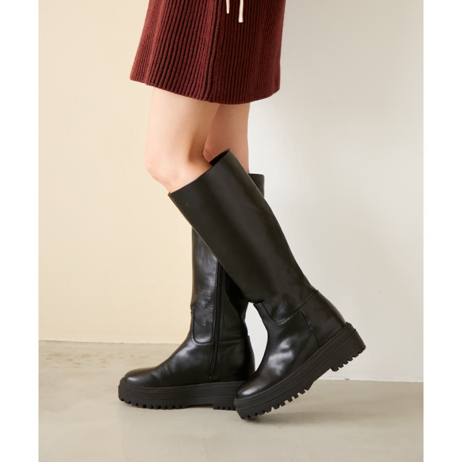 【デザイン・シルエット】 2cmのインソールヒールを取り入れた仕様で、傾斜のないべた足状態よりも疲れにくく、さりげなくスタイルアップもできる優秀な厚底ロングブーツ。