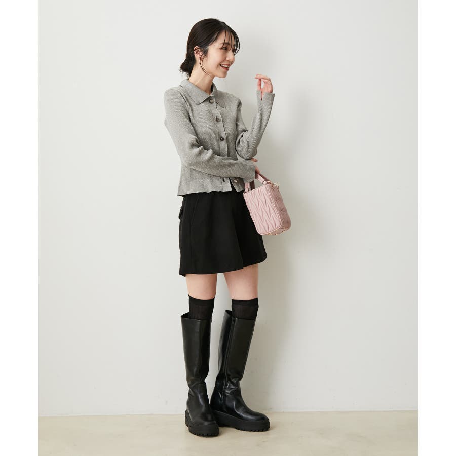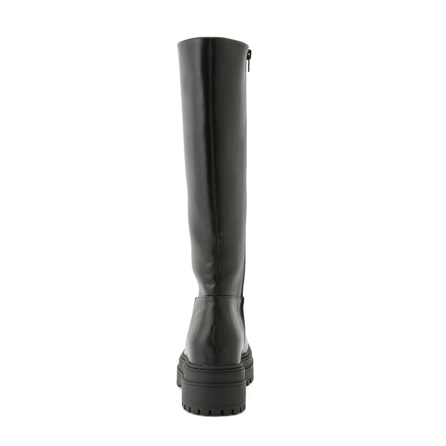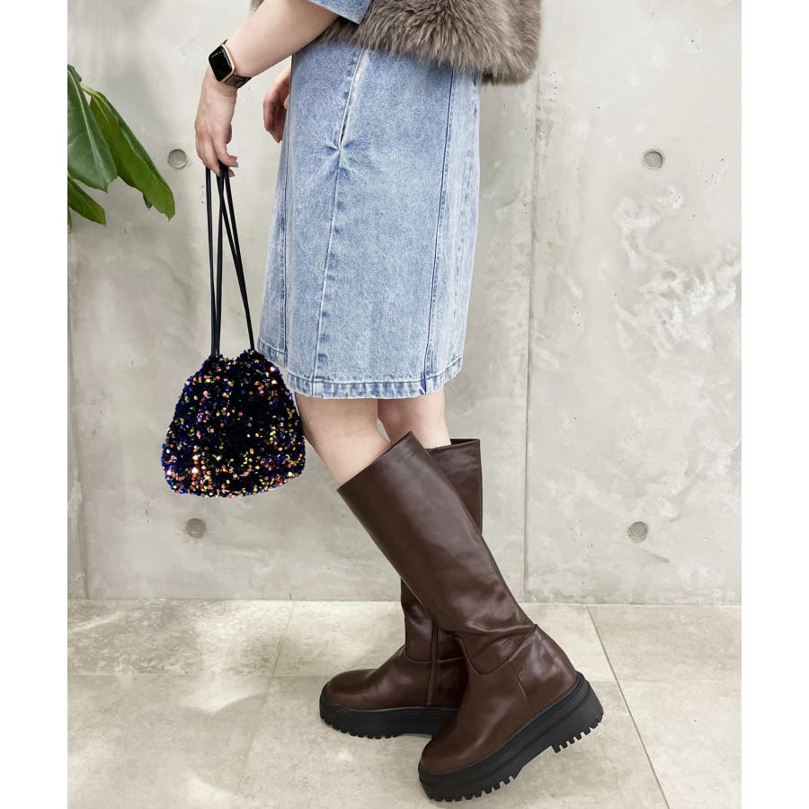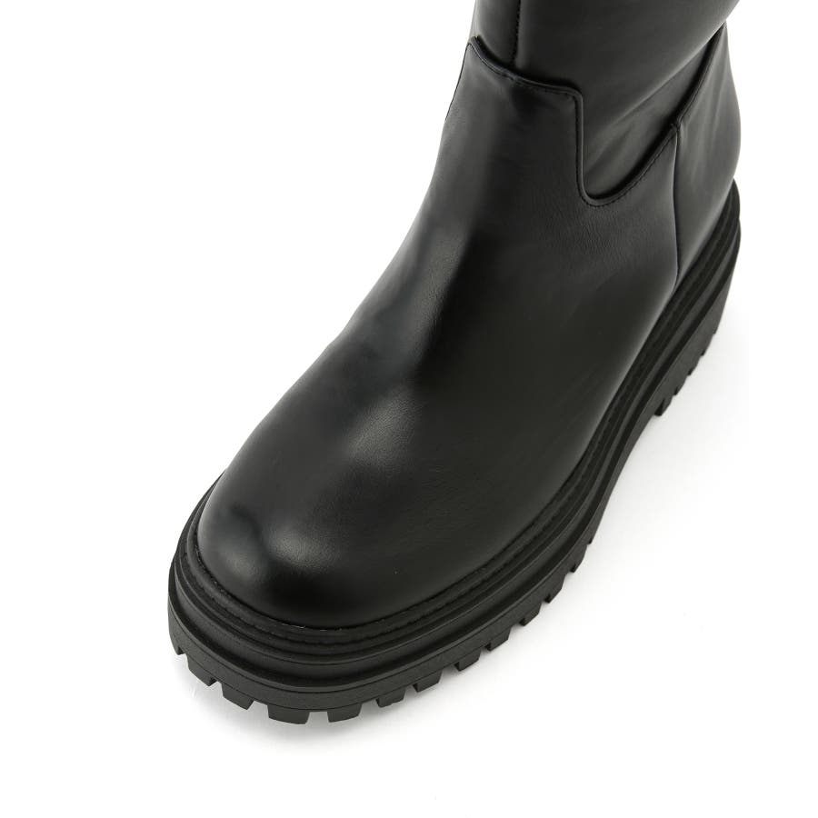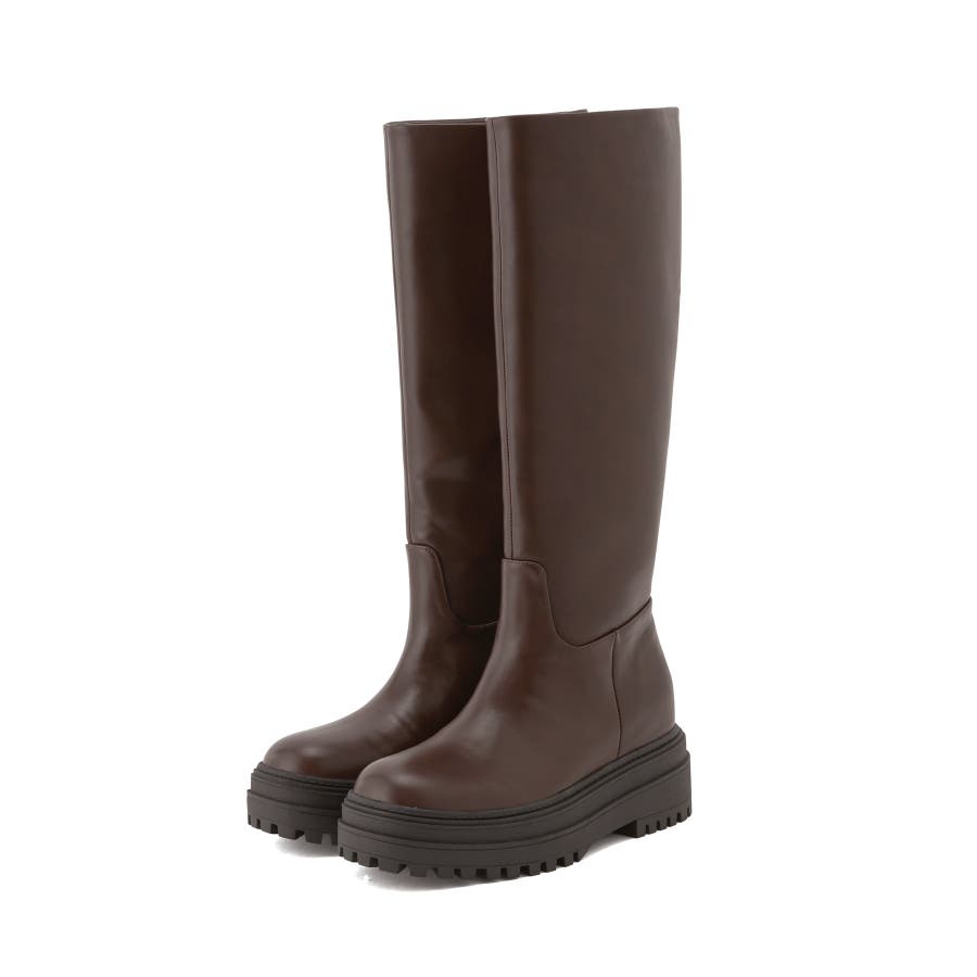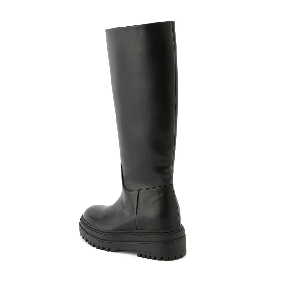 【デザイン・シルエット】 2cmのインソールヒールを取り入れた仕様で、傾斜のないべた足状態よりも疲れにくく、さりげなくスタイルアップもできる優秀な厚底ロングブーツ。
