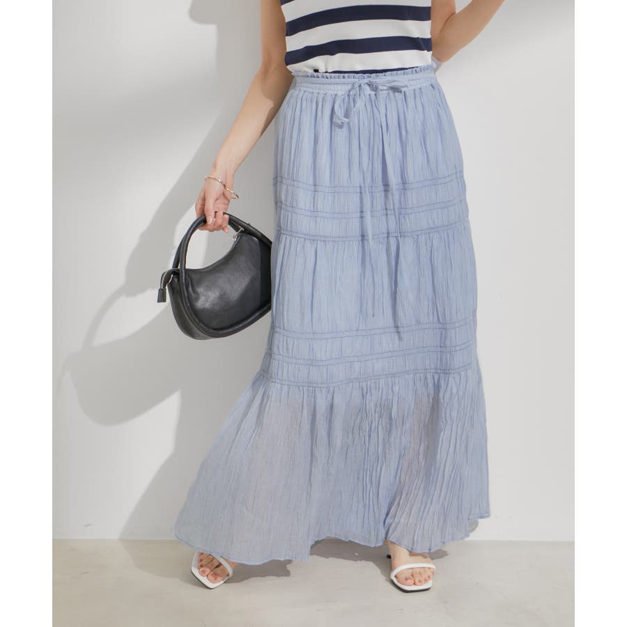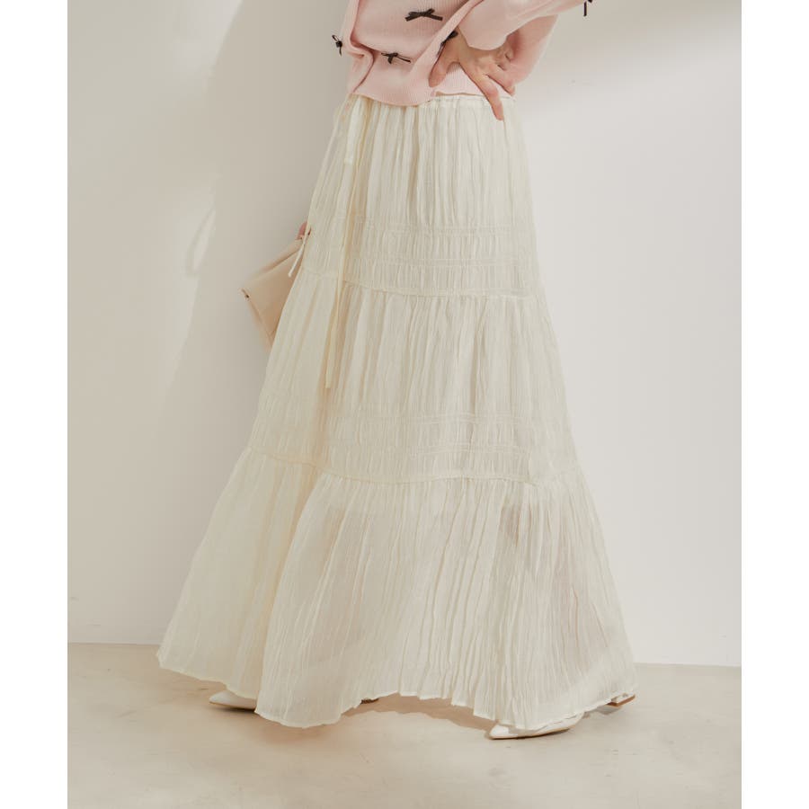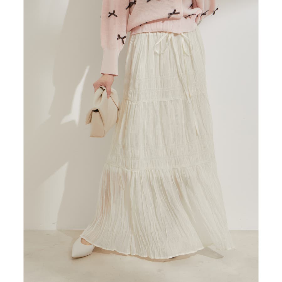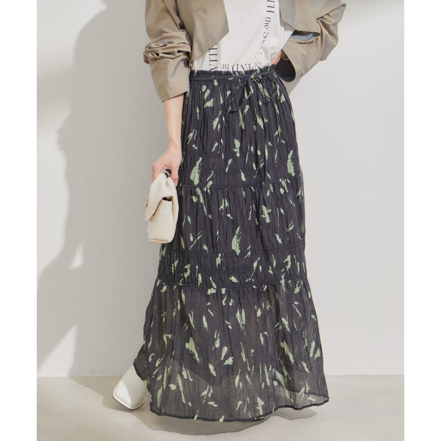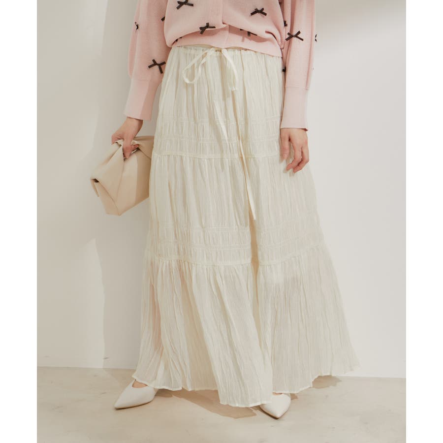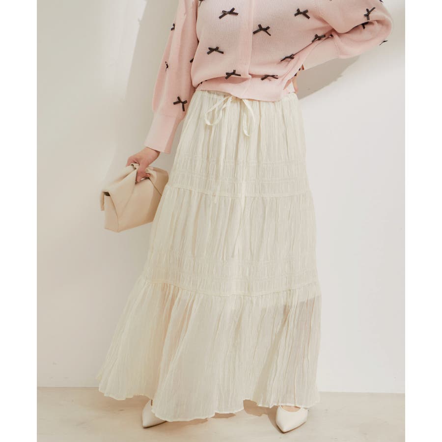 ◆2024春夏◆ 【デザイン・シルエット】 程よい分量感のシャーリングギャザーティアードスカート。 大人もスッキリと着れるティアードスカートに仕上げています。 ウエストにはリボンがついていて、ゆらゆらと揺れる感じがフェミニンなアクセントに!