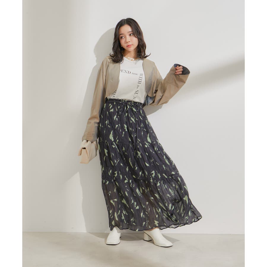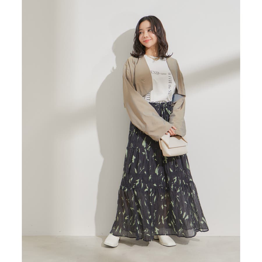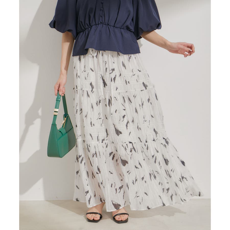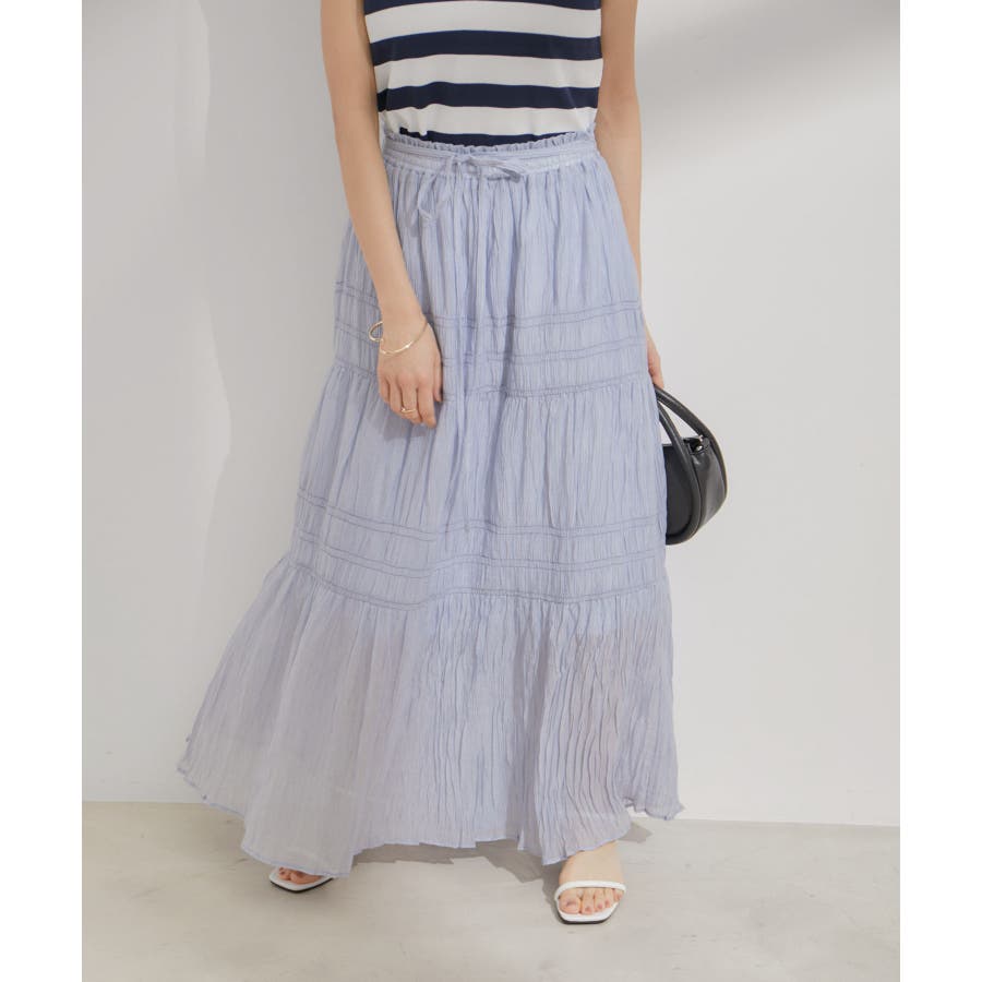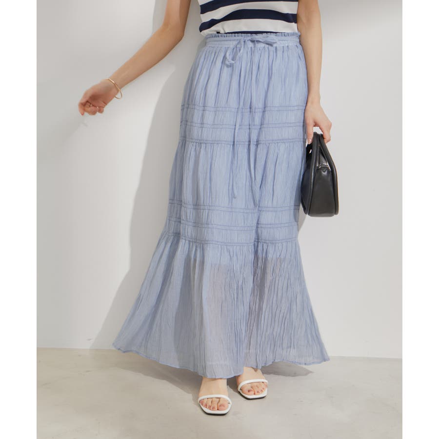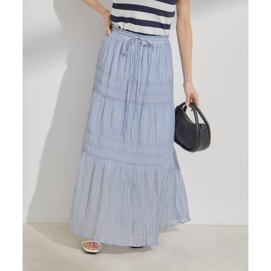 ◆2024春夏◆ 【デザイン・シルエット】 程よい分量感のシャーリングギャザーティアードスカート。 大人もスッキリと着れるティアードスカートに仕上げています。 ウエストにはリボンがついていて、ゆらゆらと揺れる感じがフェミニンなアクセントに!
