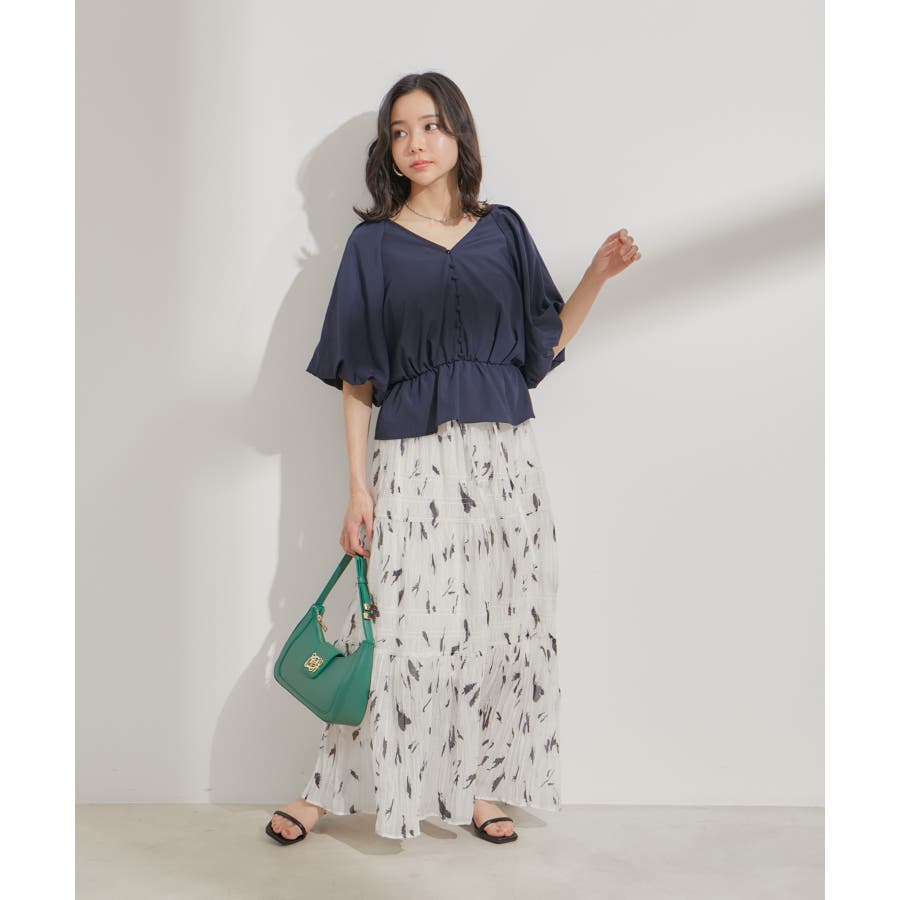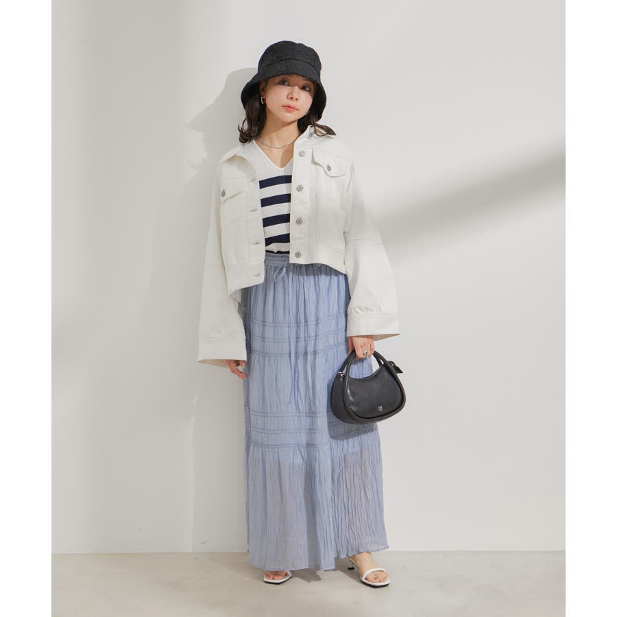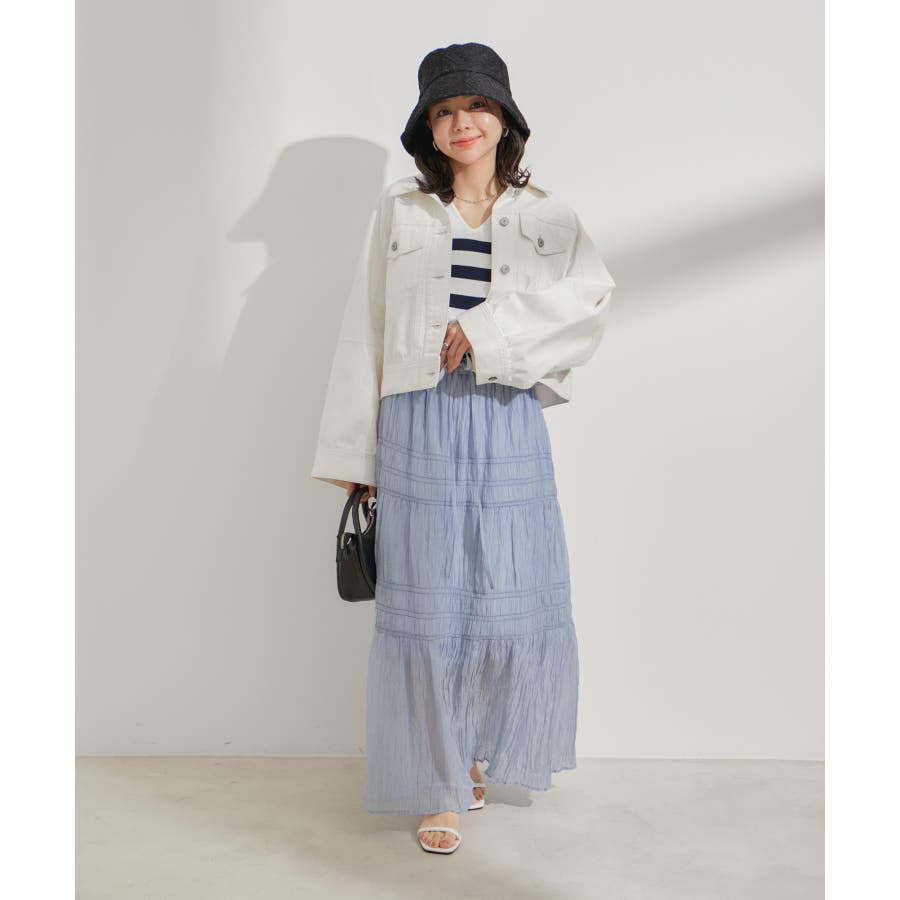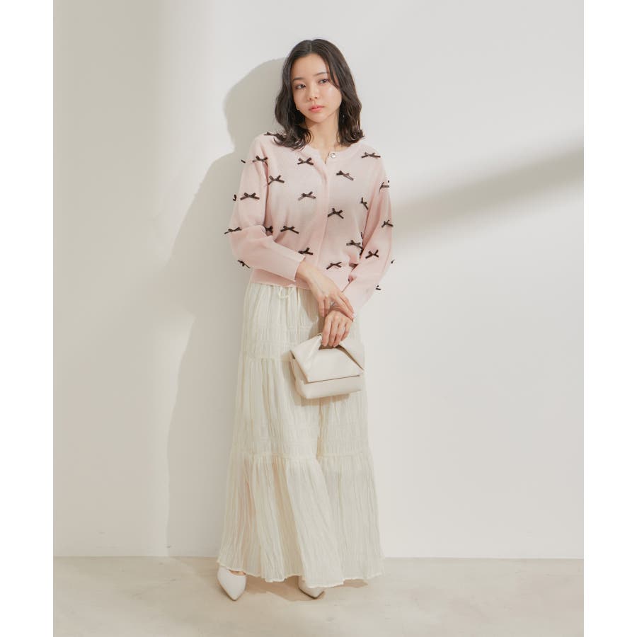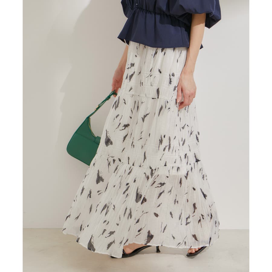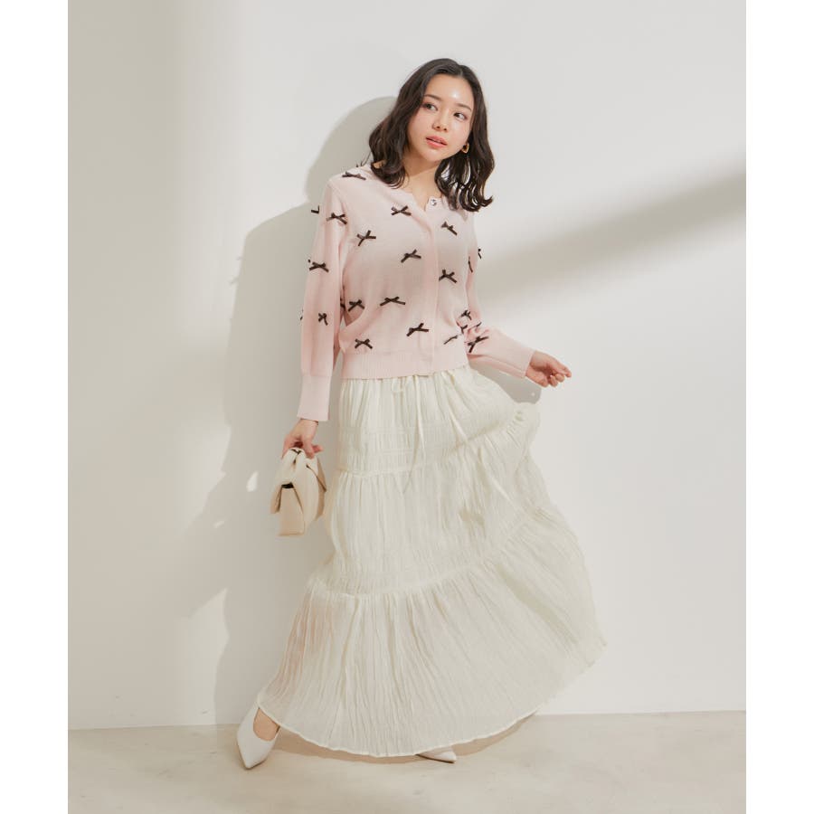◆2024春夏◆ 【デザイン・シルエット】 程よい分量感のシャーリングギャザーティアードスカート。 大人もスッキリと着れるティアードスカートに仕上げています。 ウエストにはリボンがついていて、ゆらゆらと揺れる感じがフェミニンなアクセントに!