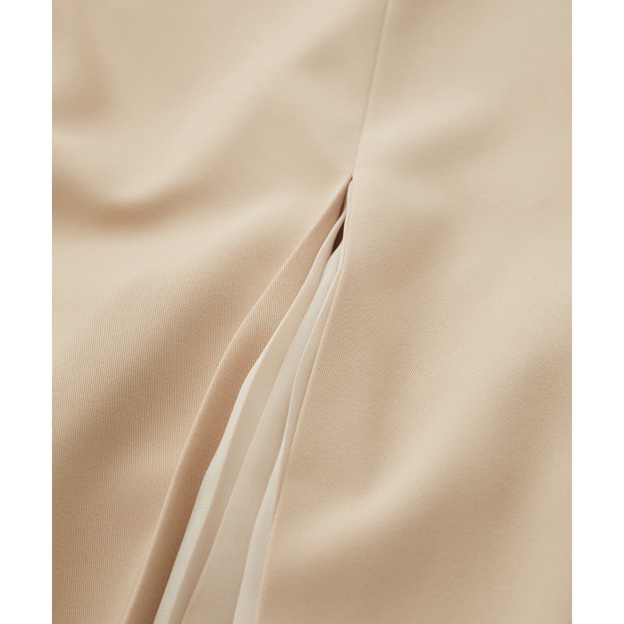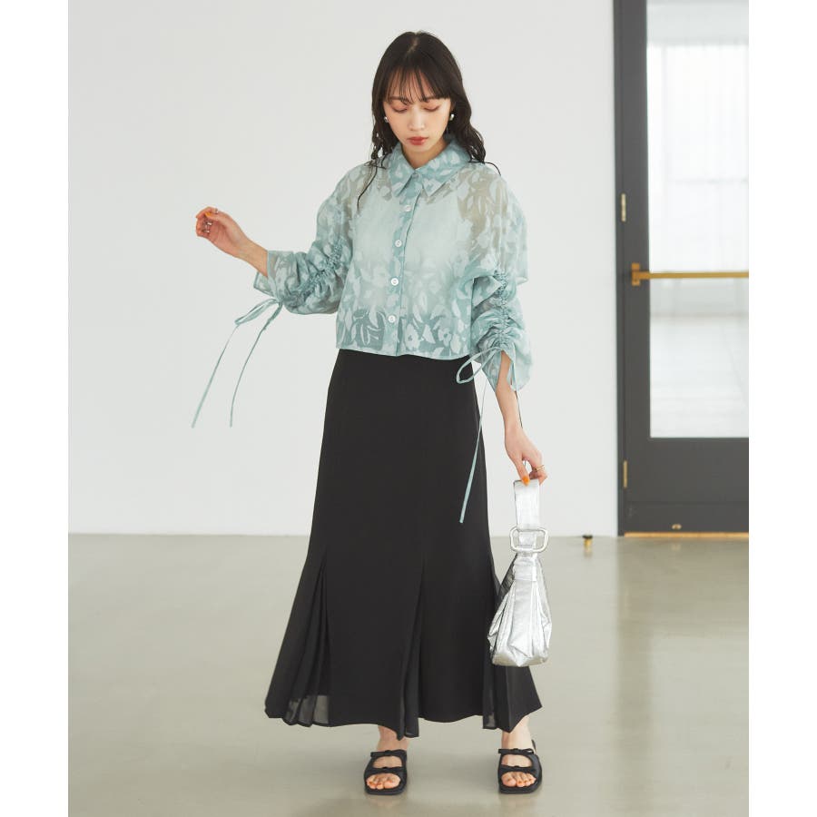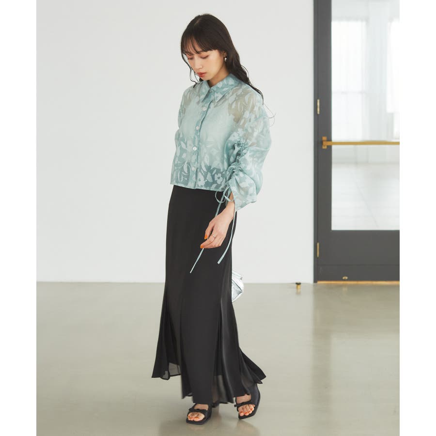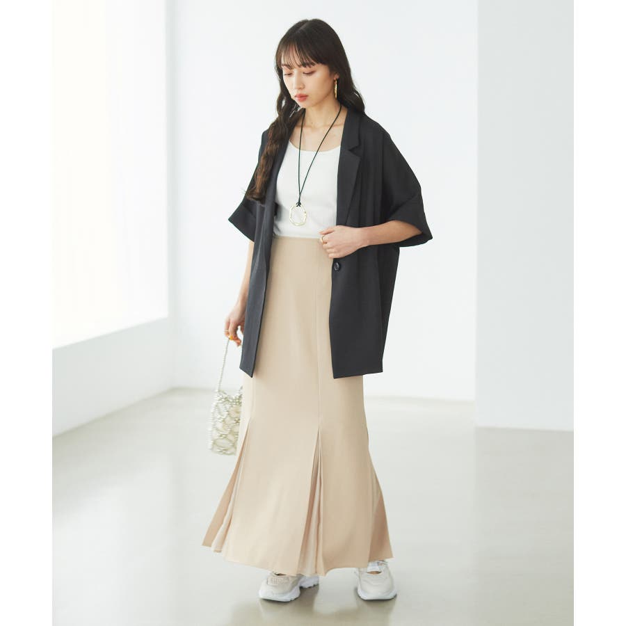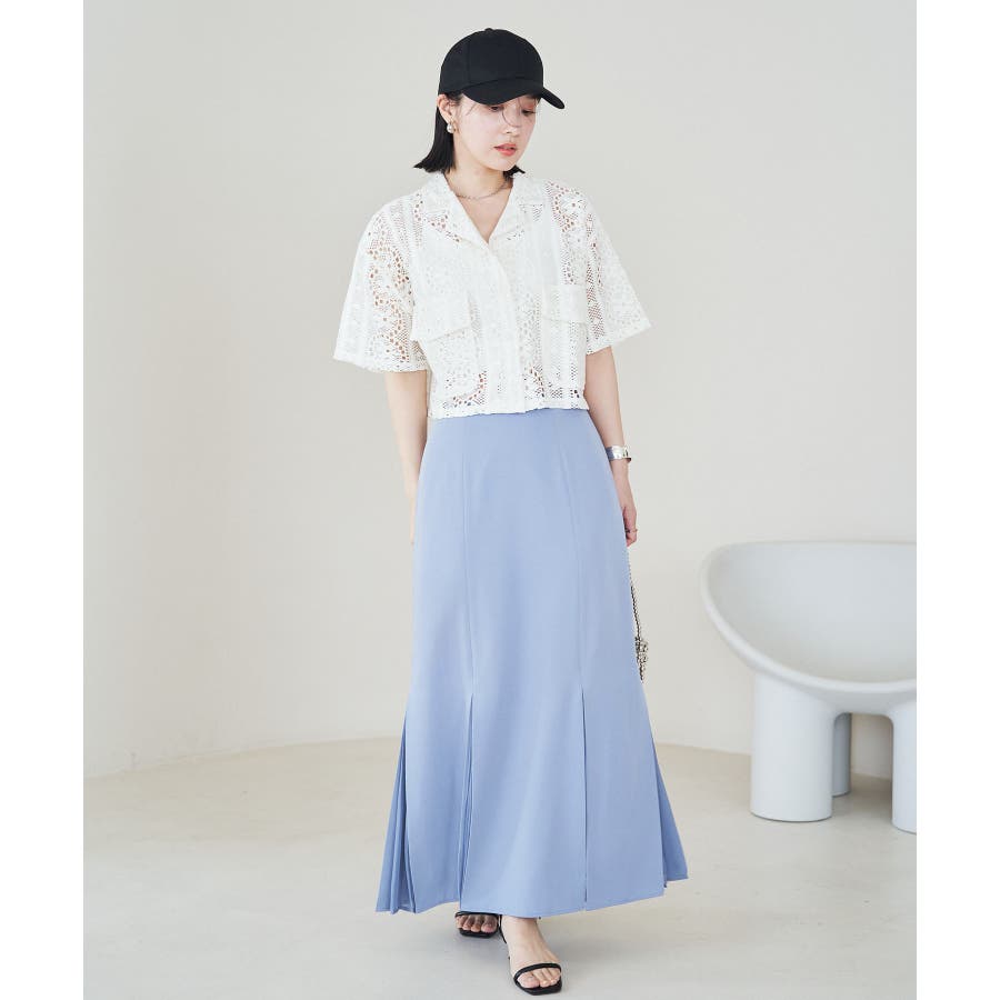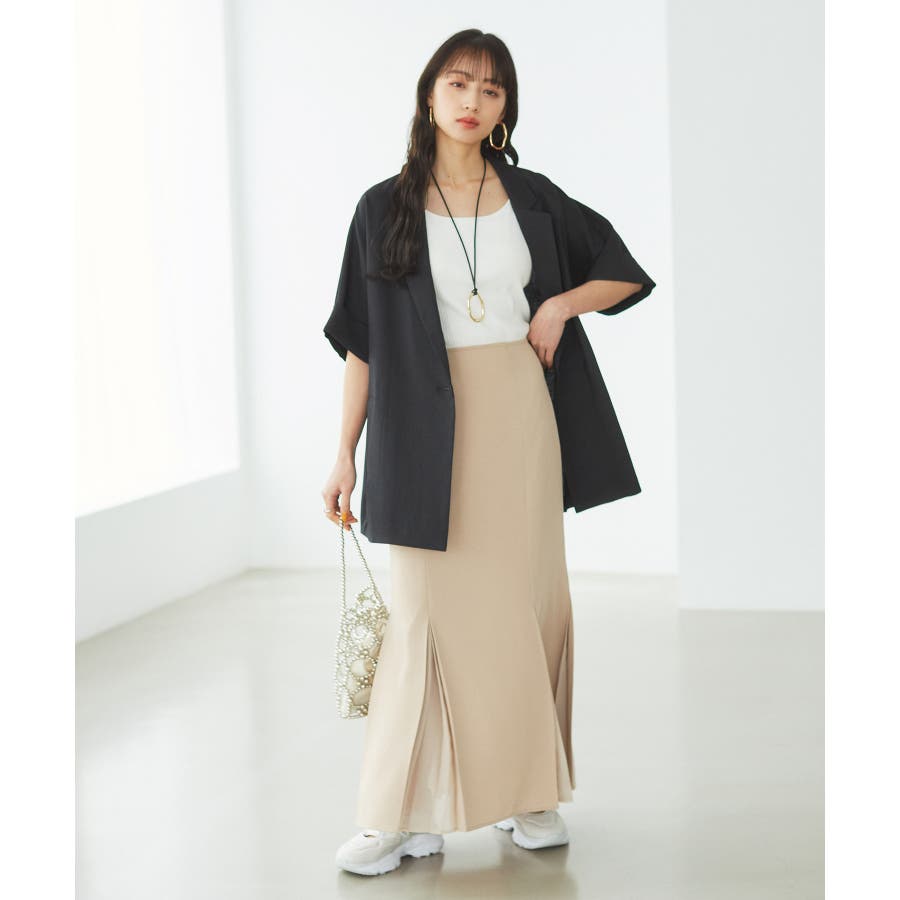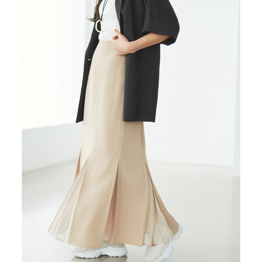 ◆2024春夏◆ 【デザイン・シルエット】 落ち感のあるツイルのマーメイドスカート。女性らしいシルエットで、骨盤が張って見えないよう構築。