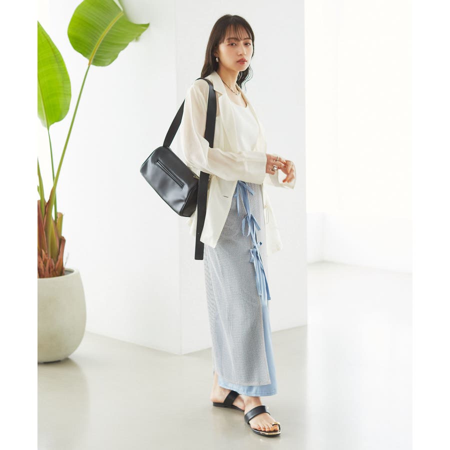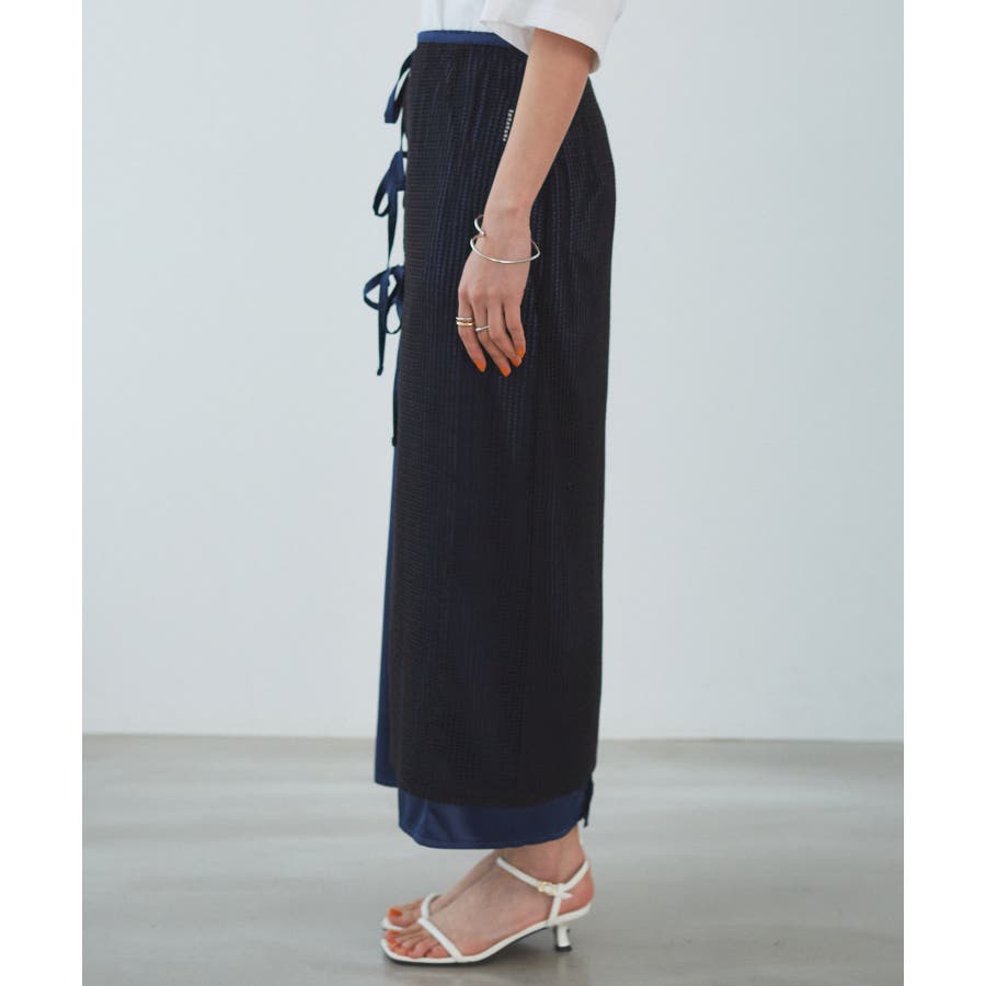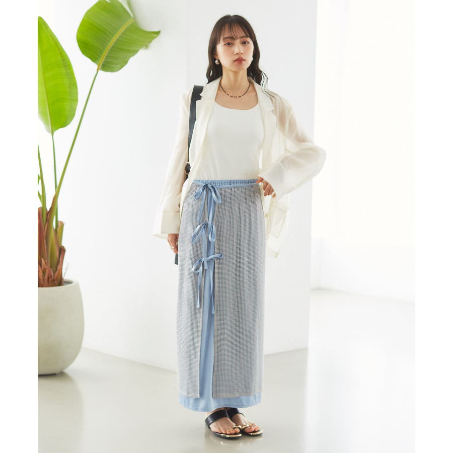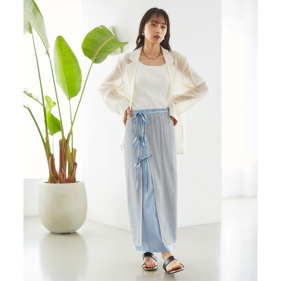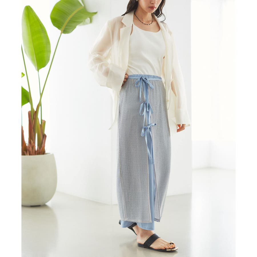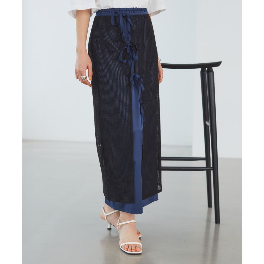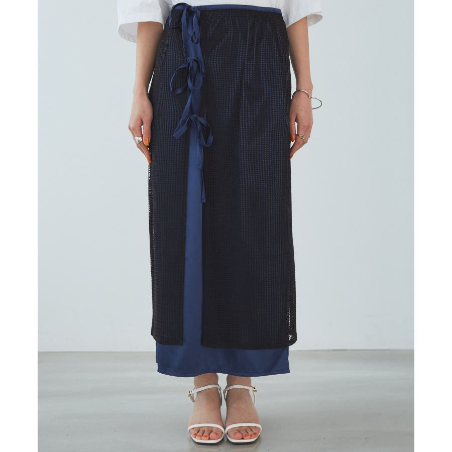 ◆2024春夏◆ 【デザイン・シルエット】 メッシュ素材のラップスカートとサテン素材のIラインスカートがセットになったマルチWAYアイテム。 ラメ入り生地がアクセントになっています。