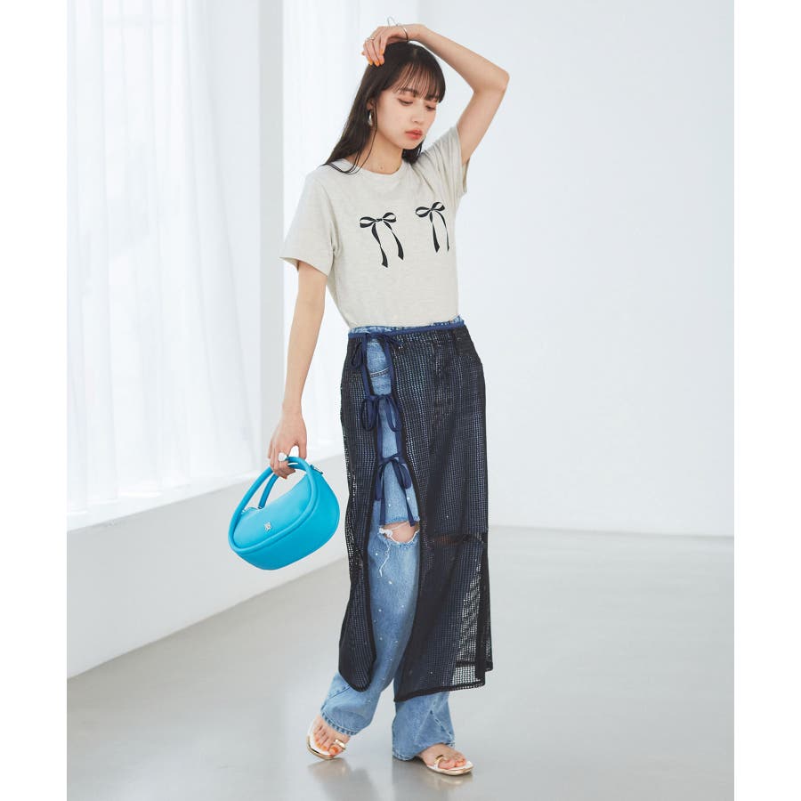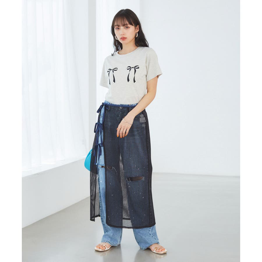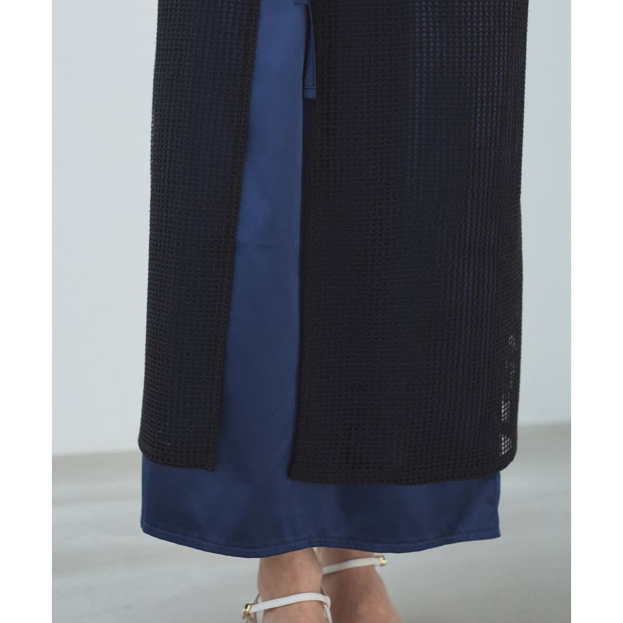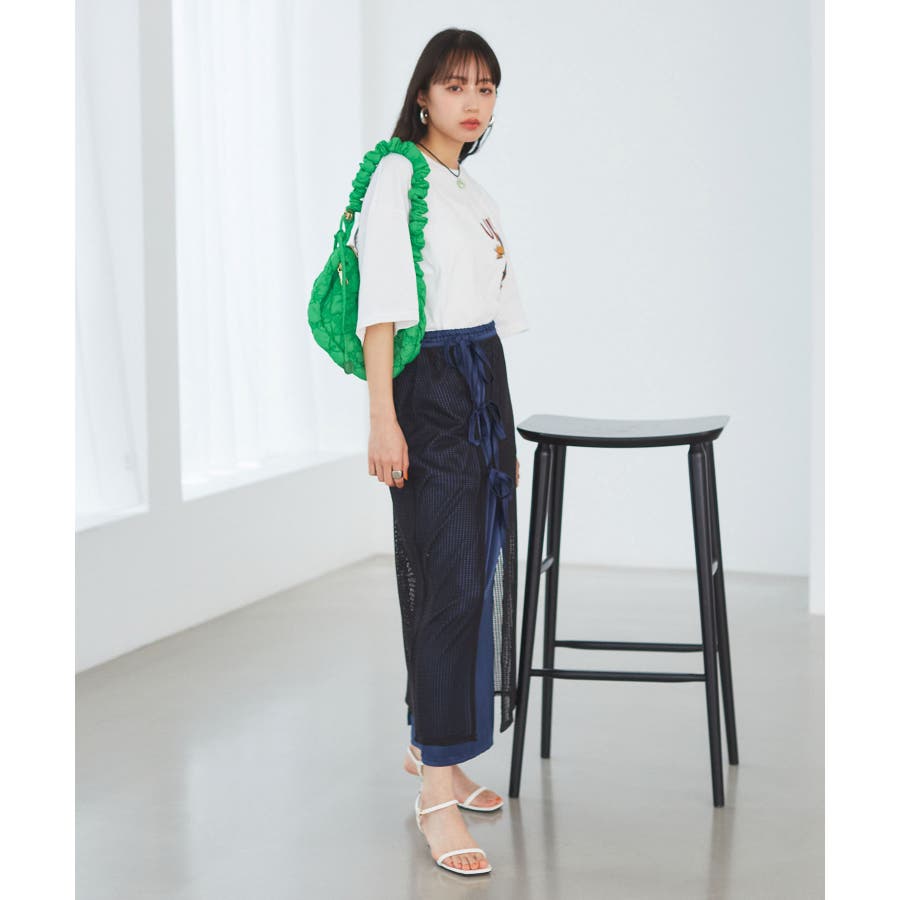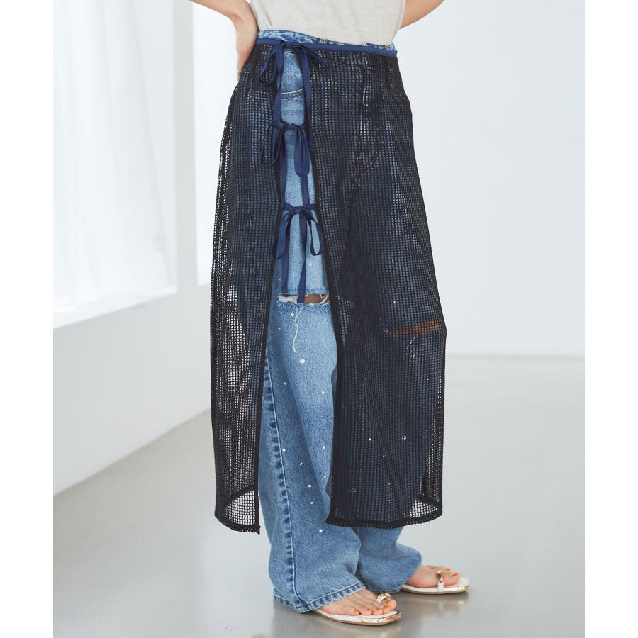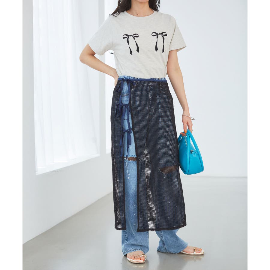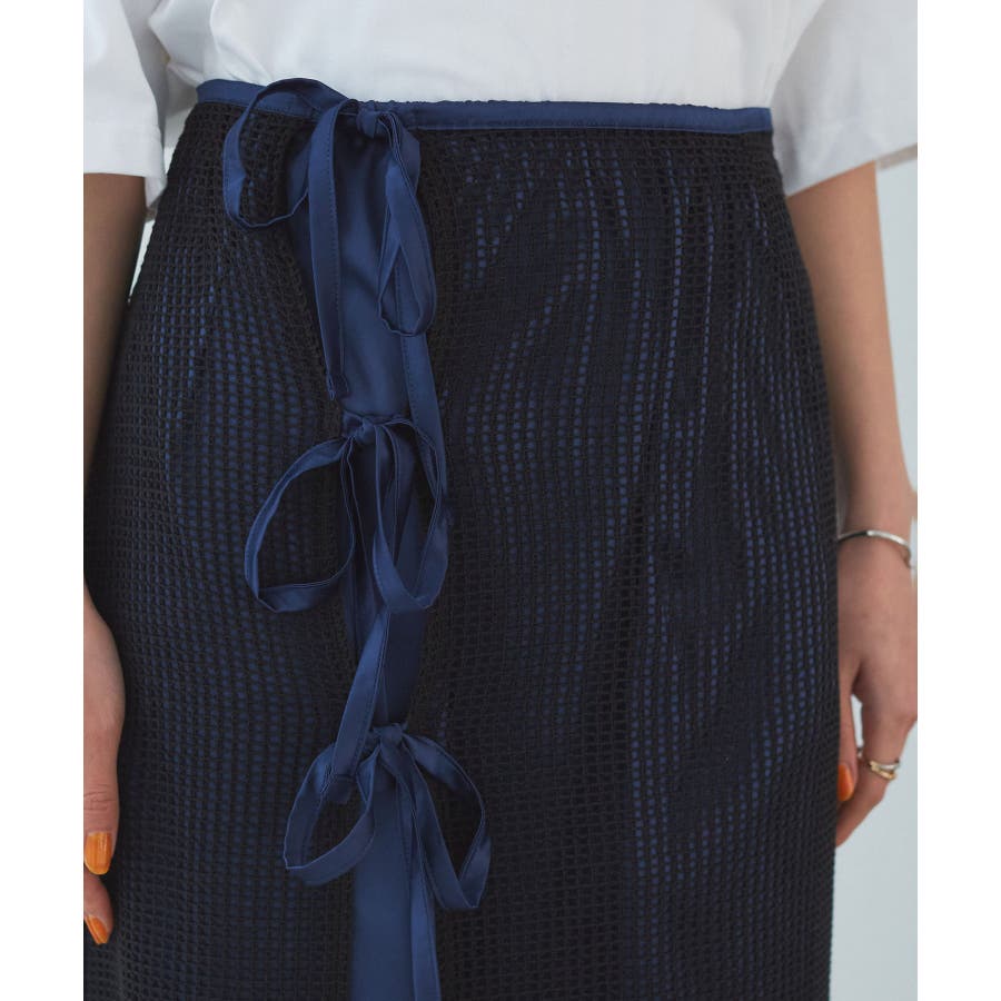 ◆2024春夏◆ 【デザイン・シルエット】 メッシュ素材のラップスカートとサテン素材のIラインスカートがセットになったマルチWAYアイテム。 ラメ入り生地がアクセントになっています。
